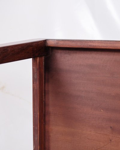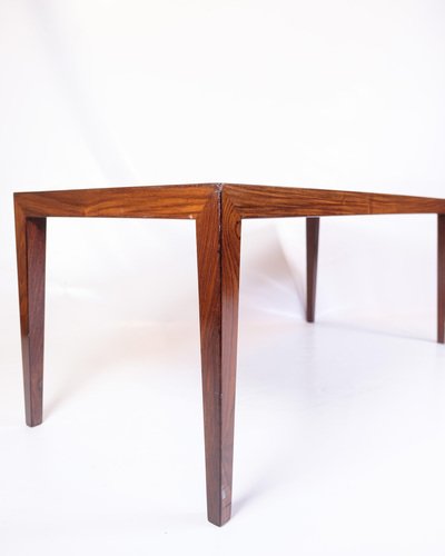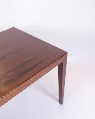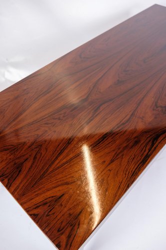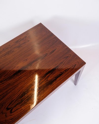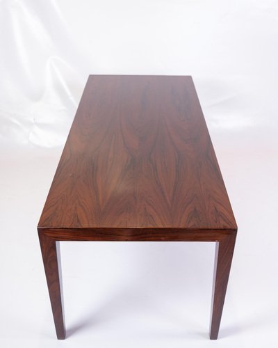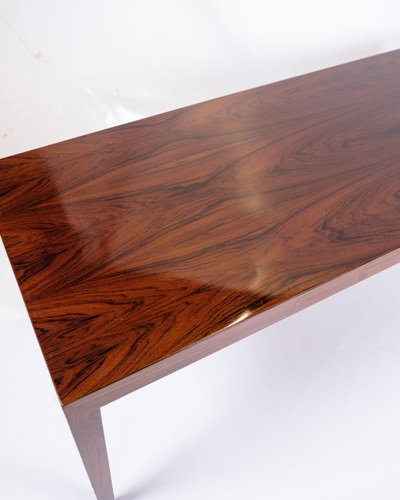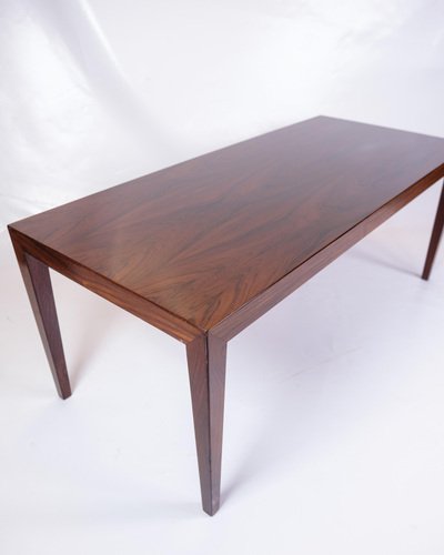 This rosewood coffee table, designed by Severin Hansen in the 1960s, is an excellent example of Danish mid-century modern design. The rich, dark tones of the rosewood and unique grain patterns give the table a luxurious and timeless aesthetic that fits perfectly into both classic and modern interiors. Severin Hansen is known for his elegant and minimalist designs, which often emphasize the natural beauty of the materials. This coffee table is no exception. The simple but sophisticated shape ensures that the table is both functional and visually appealing. The slim, conical legs and the clean tabletop create a light and airy expression that is characteristic of Hansen's design philosophy. The rosewood used in this table is chosen for its durability and beautiful appearance. The natural colors and patterns of the wood make each table unique, and the fine finish highlights these details in the most beautiful way. Rosewood is also known for its strength, which ensures that this table will be able to withstand daily use for many years. This coffee table is an iconic piece from the 1960s, a period when Danish design really made its mark on the international furniture scene. The table represents the balance between form and function for which Danish design is famous. Dimensions: H:50.5cm W:125.5cm D:55cm