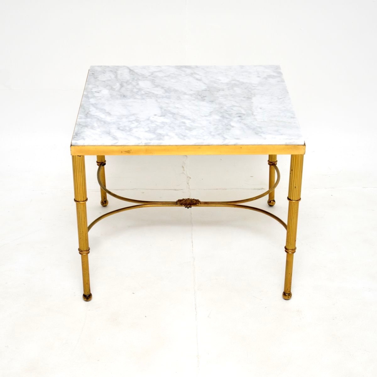 The quality is fantastic, the brass frame has beautifully curved stretchers with a lovely connecting brass rosette, and fluted legs. This is a very useful and practical size, with a very sturdy build. It is large enough for use as a petite central coffee table, or can be used as a relatively large side / occasional table.