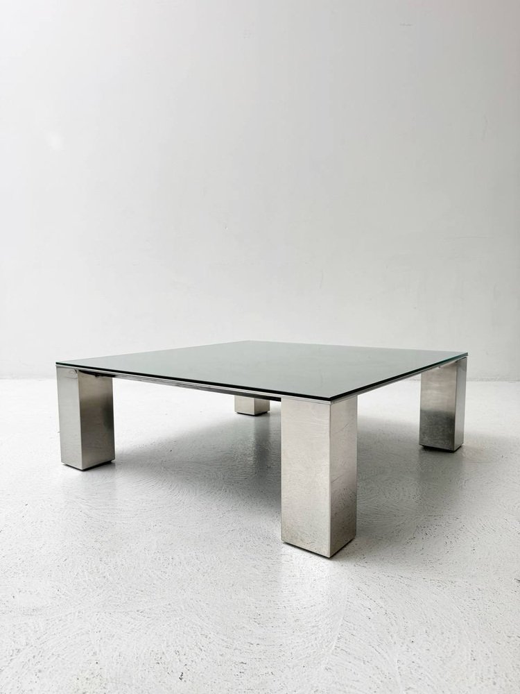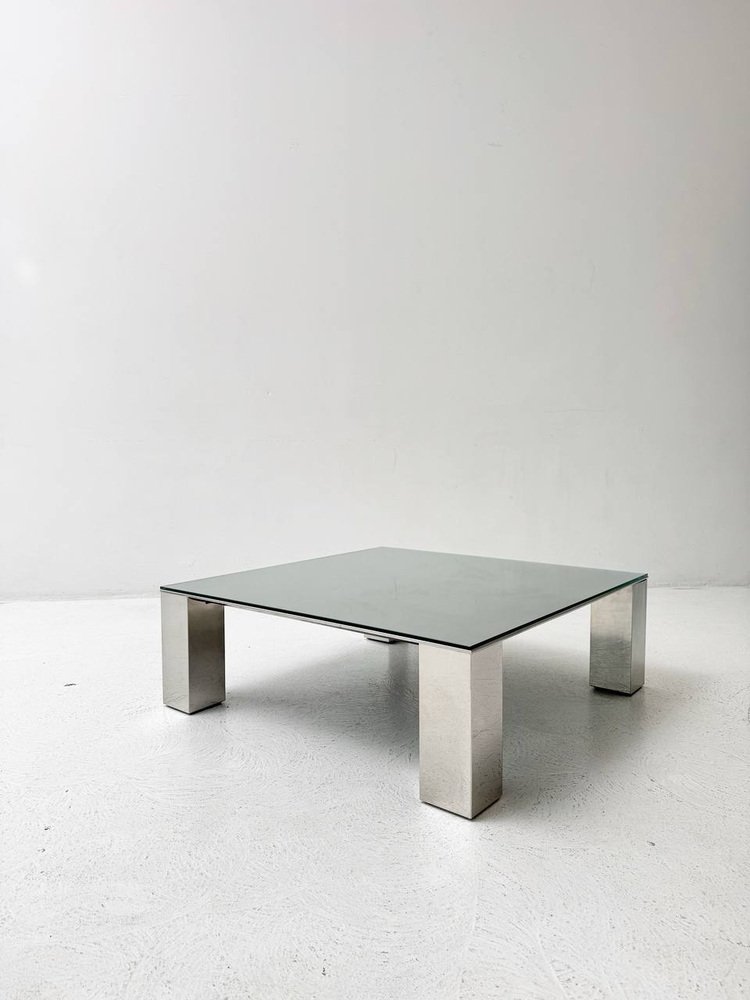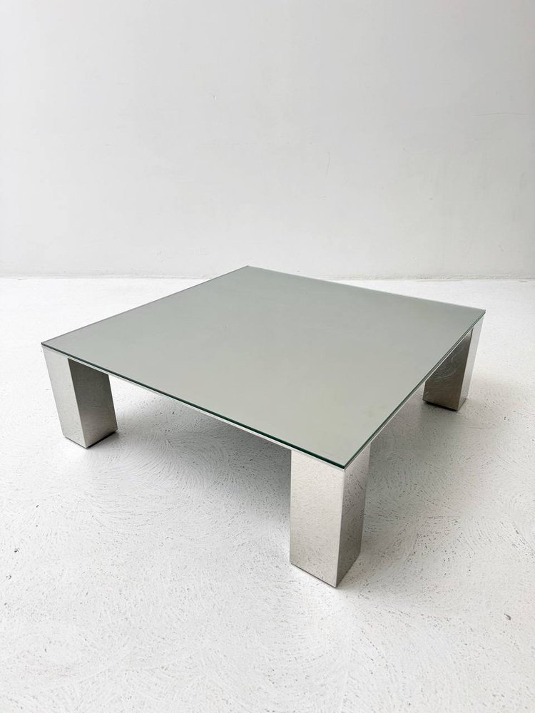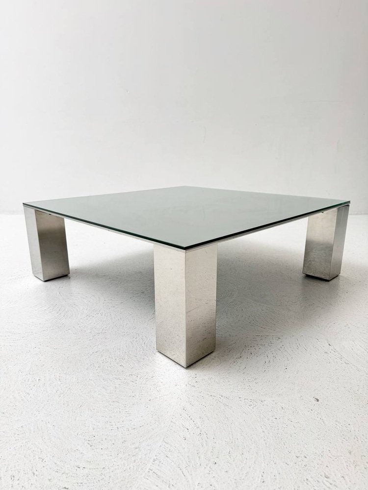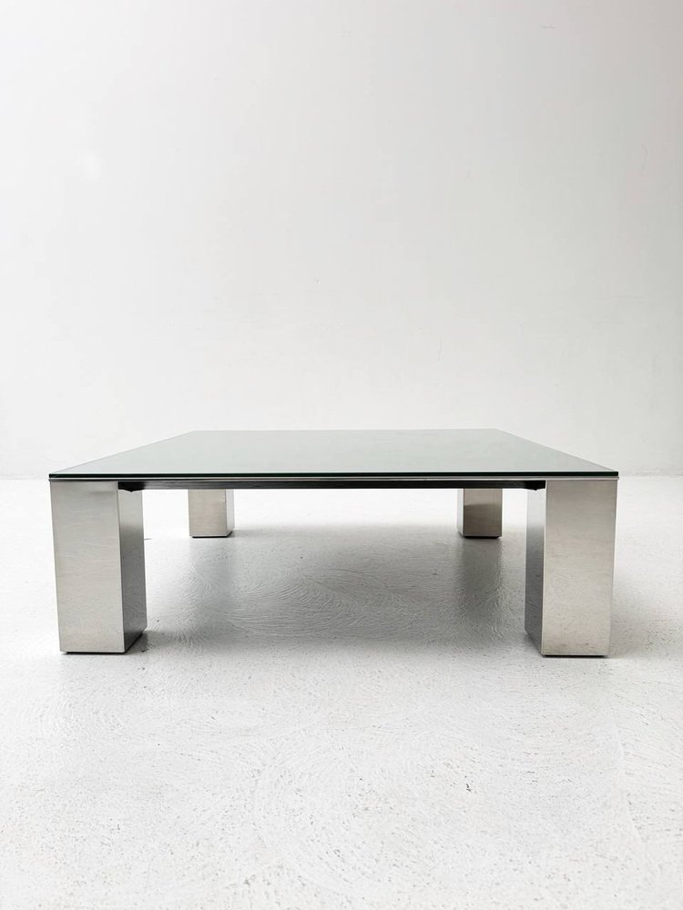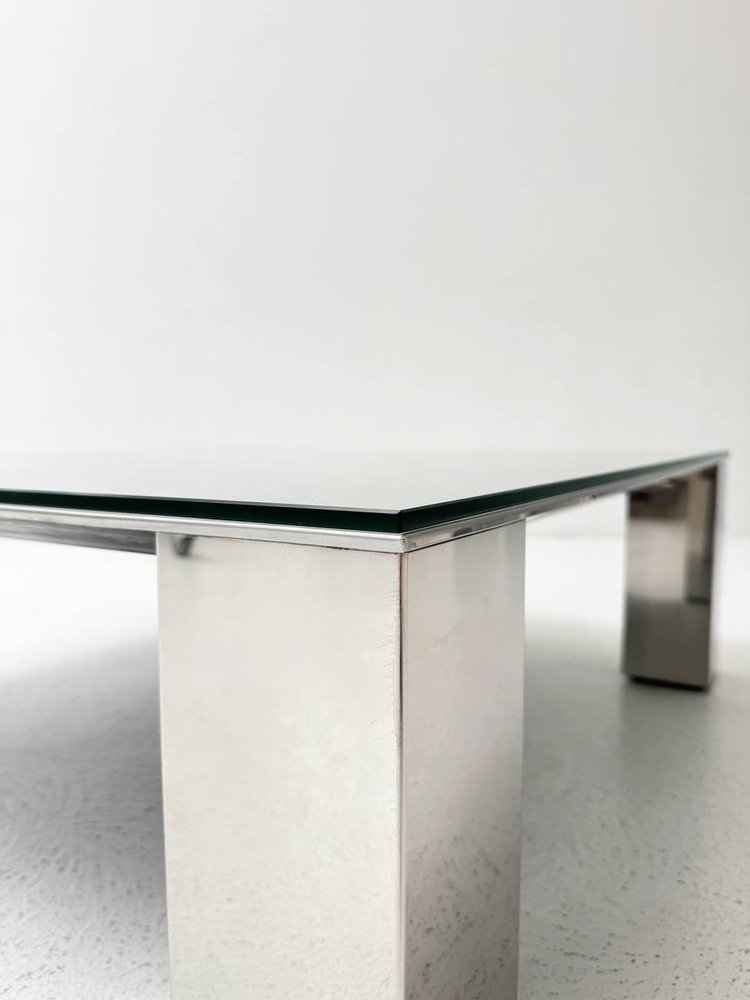 Condition: The coffee table by Giovanni for Saporiti is in very good condition. The glass top is clear and free of any visible scratches or damage. The robust, chrome-plated legs are also well maintained and show no significant rust or signs of wear. Overall, the table exudes a well-preserved, well-maintained aesthetic that underlines its timeless elegance.