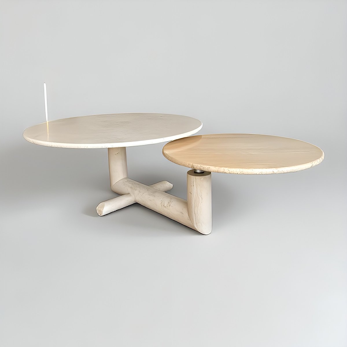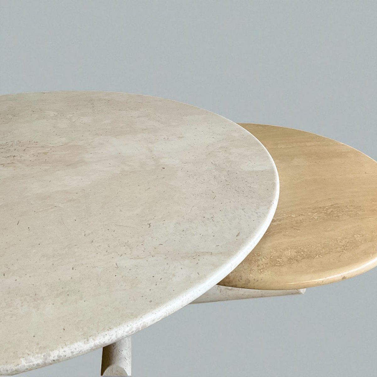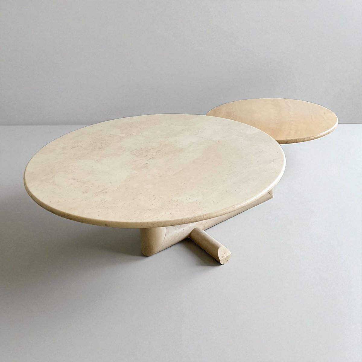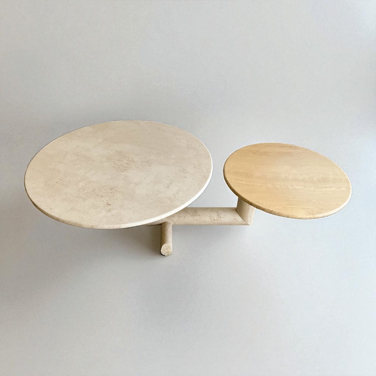 * Cette table de salon en travertin (pierre calcaire) massif séduit par son design moderne et intemporel, mis en valeur par le piètement sculptural et les deux plateaux ronds de taille différente.