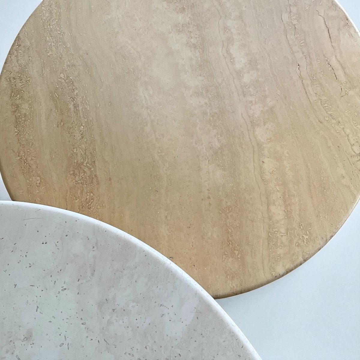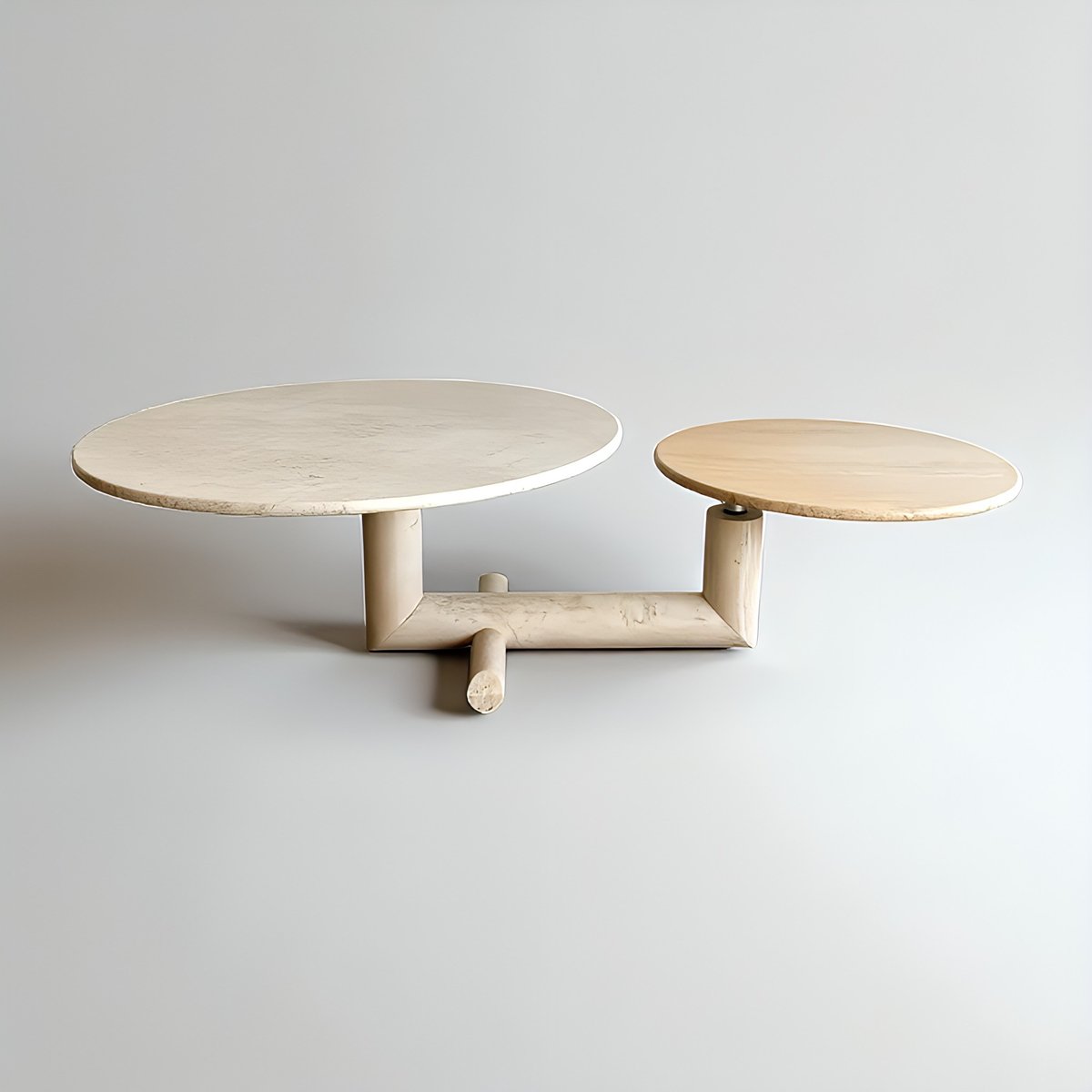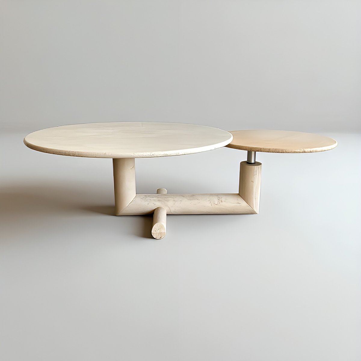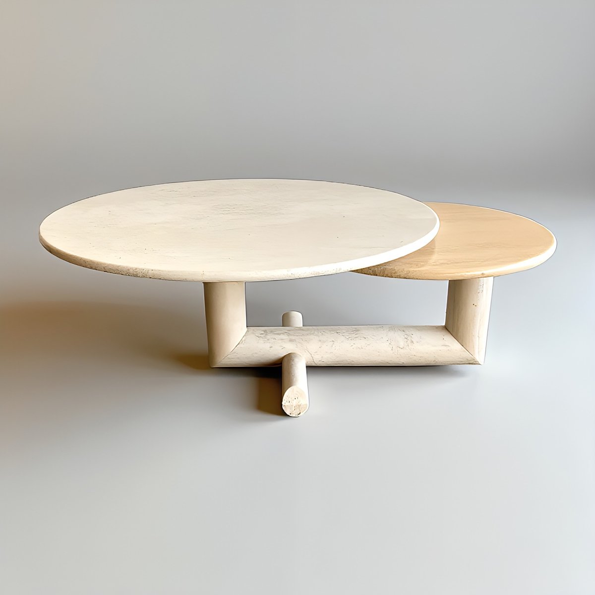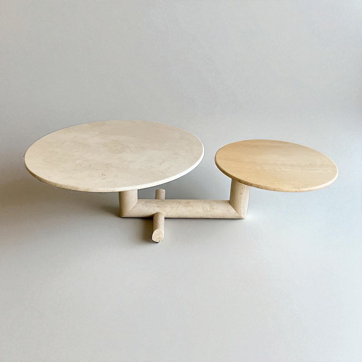 * Cette table de salon en travertin (pierre calcaire) massif séduit par son design moderne et intemporel, mis en valeur par le piètement sculptural et les deux plateaux ronds de taille différente.
