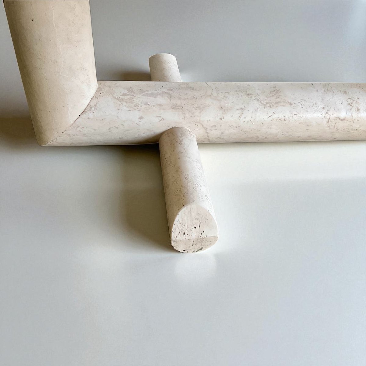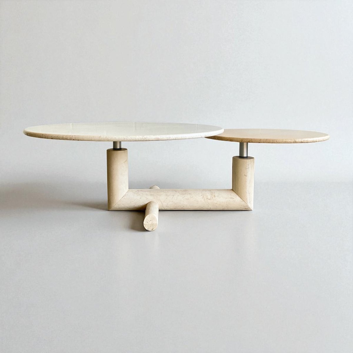 Ce design exceptionnel date des années 1980 et a été produit jusque dans les années 1990. Nous attribuons ce modèle à UP & UP d'Italie, car il est stylistiquement très similaire à d'autres modèles de tables basses en travertin/marbre d'UP & UP des années 1970 et 1980.