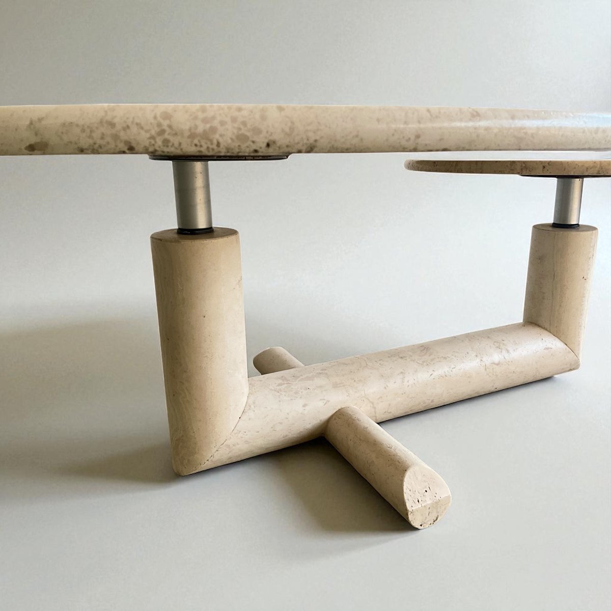 This exceptional design dates back to the 1980s and was still in production until the 1990s. We attribute this design to UP & UP from Italy, as it is stylistically very similar to other travertine/marble coffee table designs by UP & UP from the 1970s and 1980s.