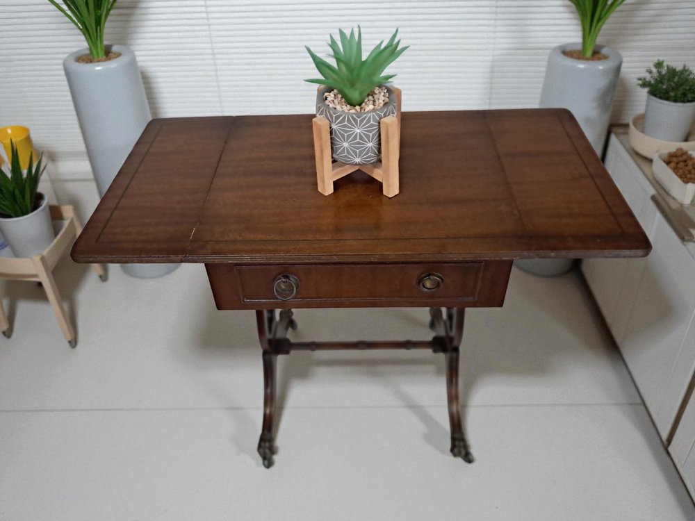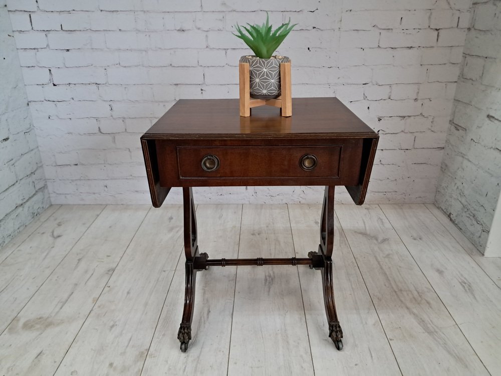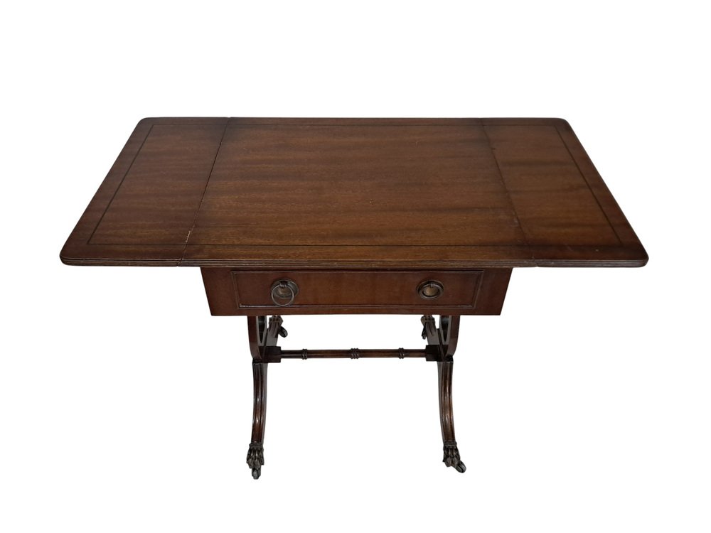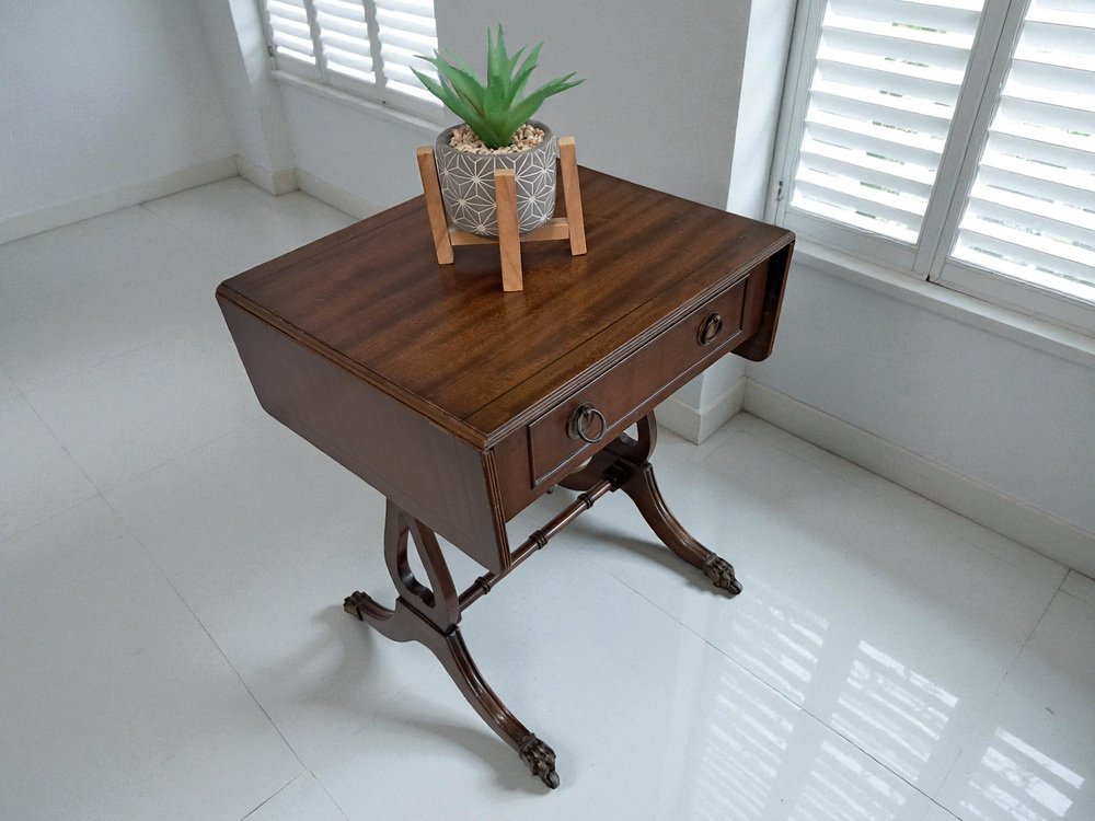 Introducing a truly exquisite vintage piece - a magnificent Victorian style Mahogany antique sofa table with drop flap sides. This table boasts a dark Mahogany finish, highlighting the remarkable wood grain that adorns it. Adding to its allure are two drawers, one on each side and adorned with decorative brass pull handles, and dovetail joints. One of the set of drawers are dummy drawers, enabling the sofa table to stand anywhere in a room and still look look splendid from the front or the rear. This table dates from the Early 20th Century (1930's).
