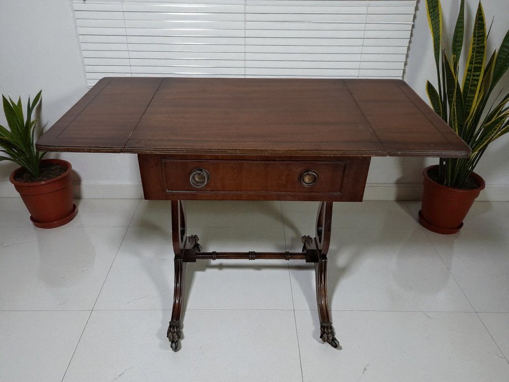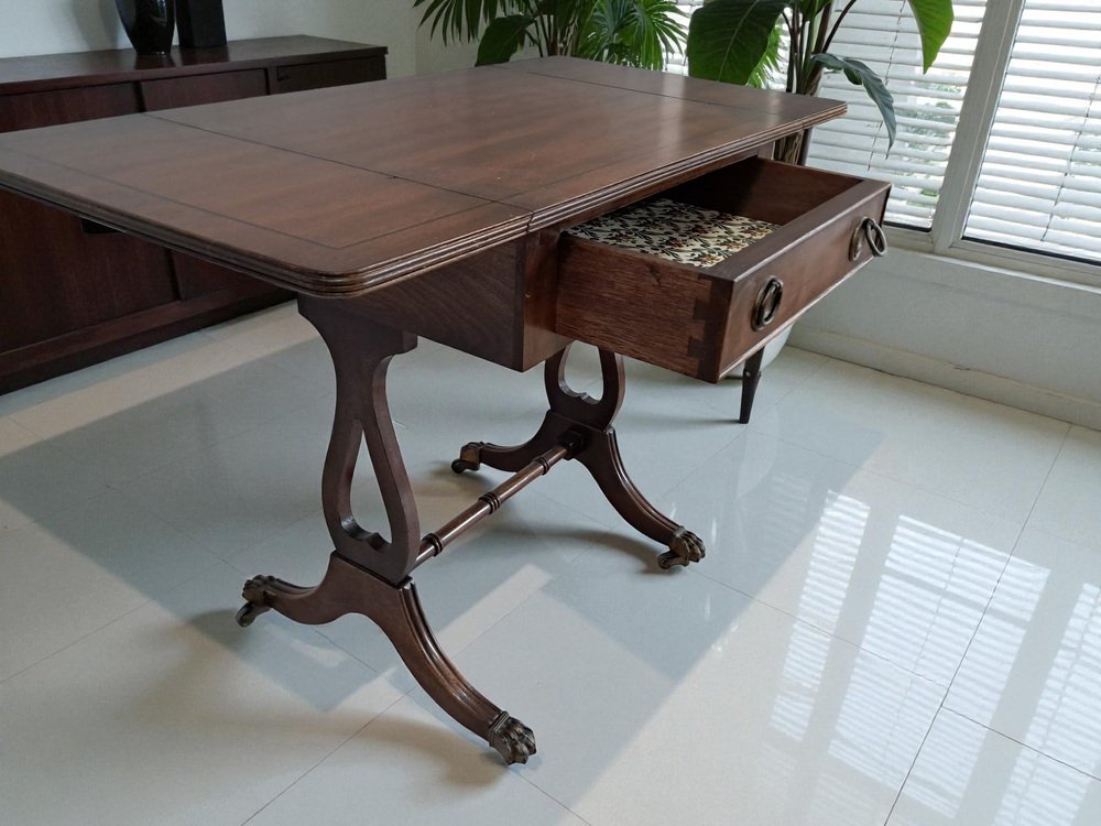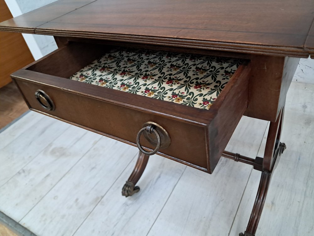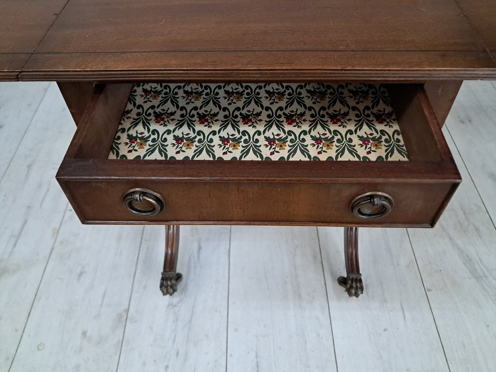 Voici une pièce vintage vraiment exquise - une magnifique table de canapé antique en acajou de style victorien avec des côtés à rabat. Cette table présente une finition en acajou foncé qui met en valeur le remarquable grain de bois qui l'orne. Deux tiroirs, un de chaque côté, ornés de poignées décoratives en laiton et d'articulations à queue d'aronde, ajoutent à son attrait. L'un des tiroirs est un tiroir factice, ce qui permet à la table de canapé de se placer n'importe où dans une pièce et de rester splendide de l'avant ou de l'arrière. Cette table date du début du 20e siècle (années 1930).