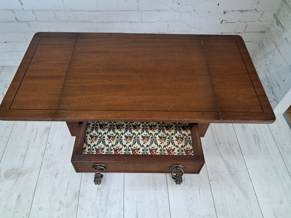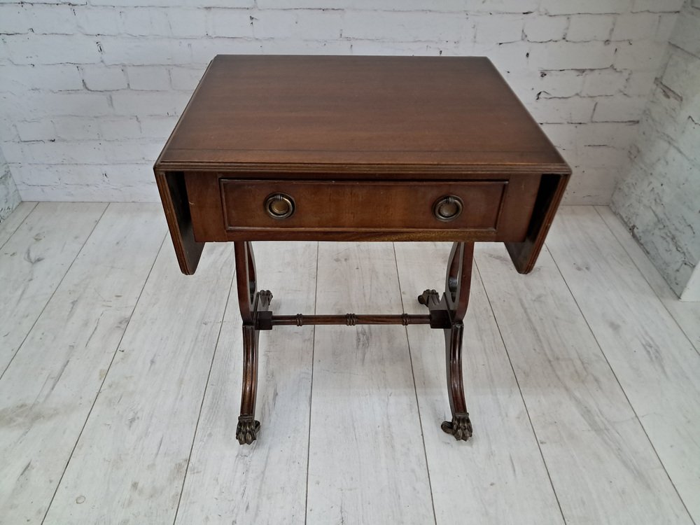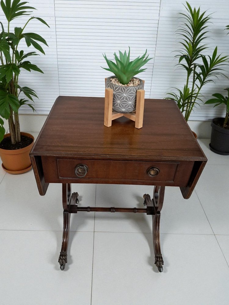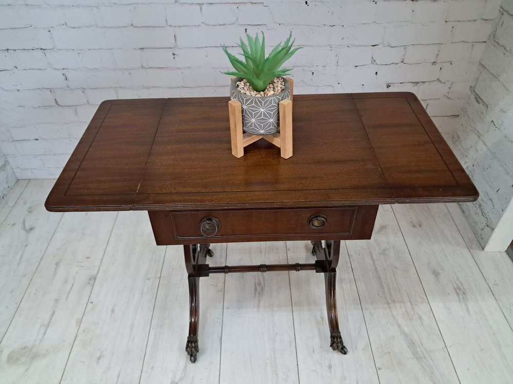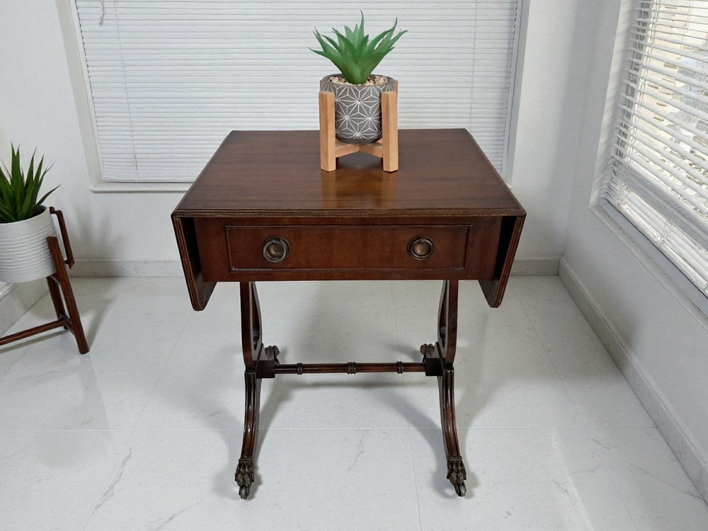 Voici une pièce vintage vraiment exquise - une magnifique table de canapé antique en acajou de style victorien avec des côtés à rabat. Cette table présente une finition en acajou foncé qui met en valeur le remarquable grain de bois qui l'orne. Deux tiroirs, un de chaque côté, ornés de poignées décoratives en laiton et d'articulations à queue d'aronde, ajoutent à son attrait. L'un des tiroirs est un tiroir factice, ce qui permet à la table de canapé de se placer n'importe où dans une pièce et de rester splendide de l'avant ou de l'arrière. Cette table date du début du 20e siècle (années 1930).