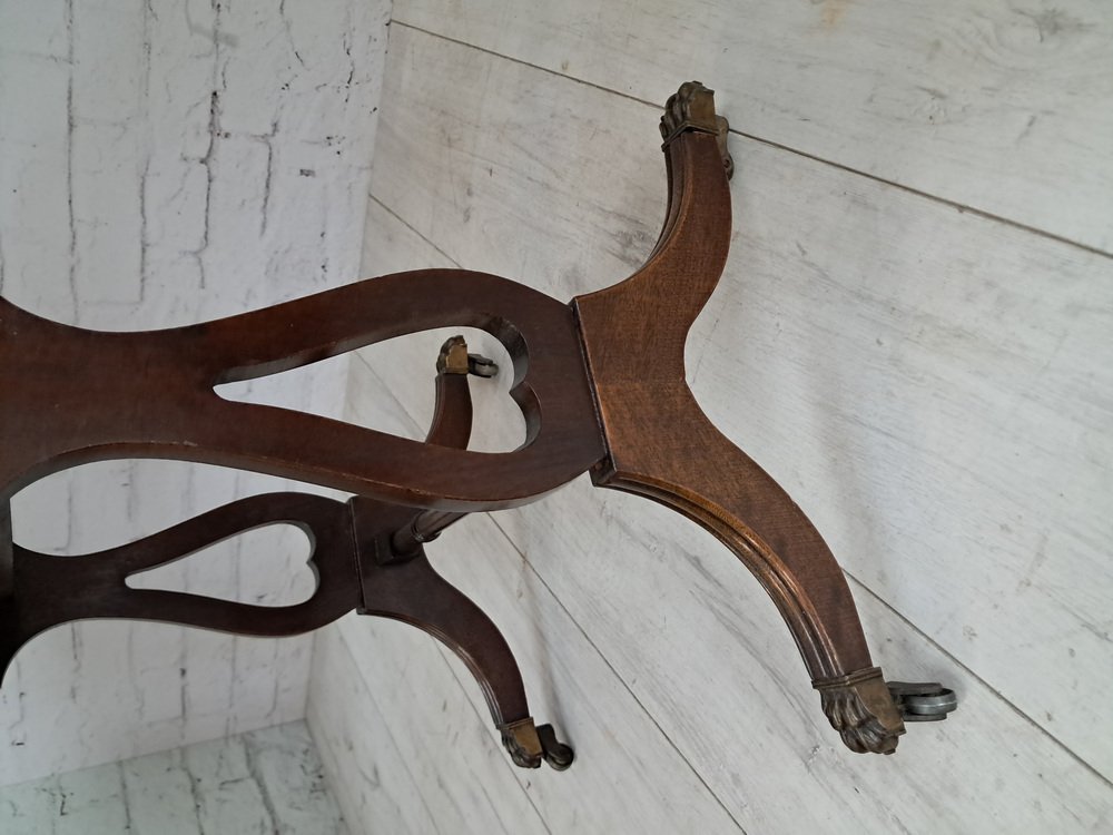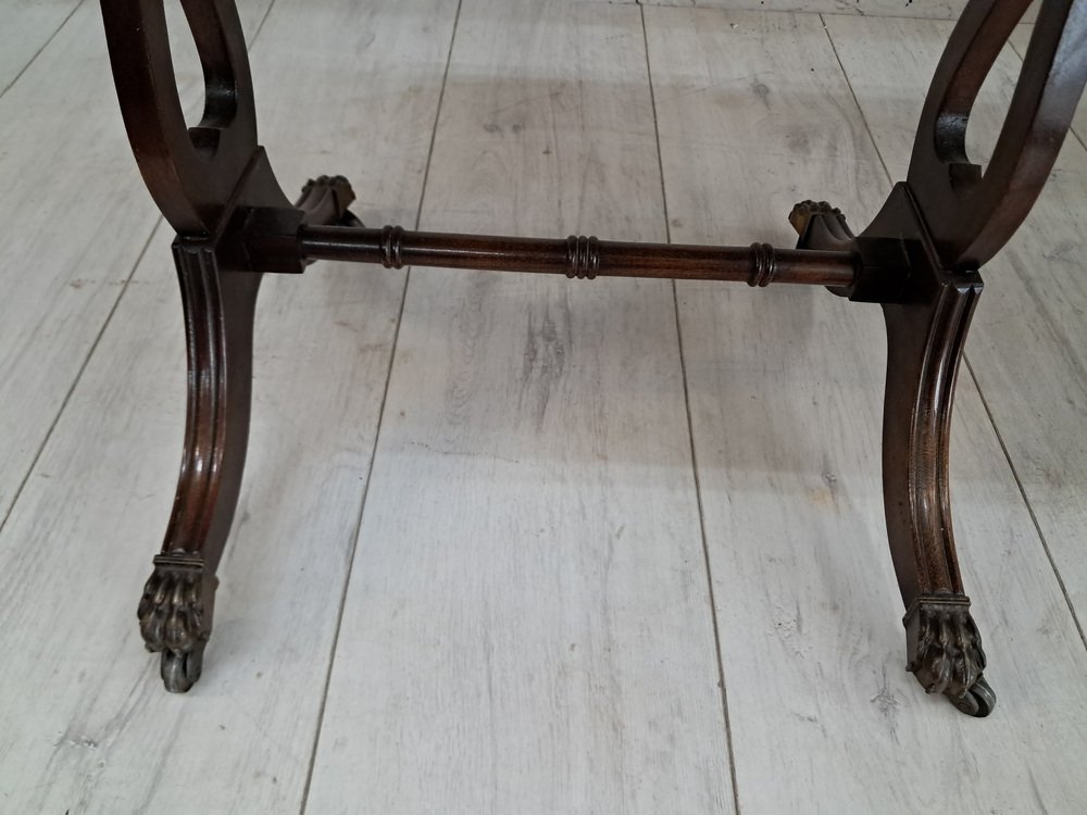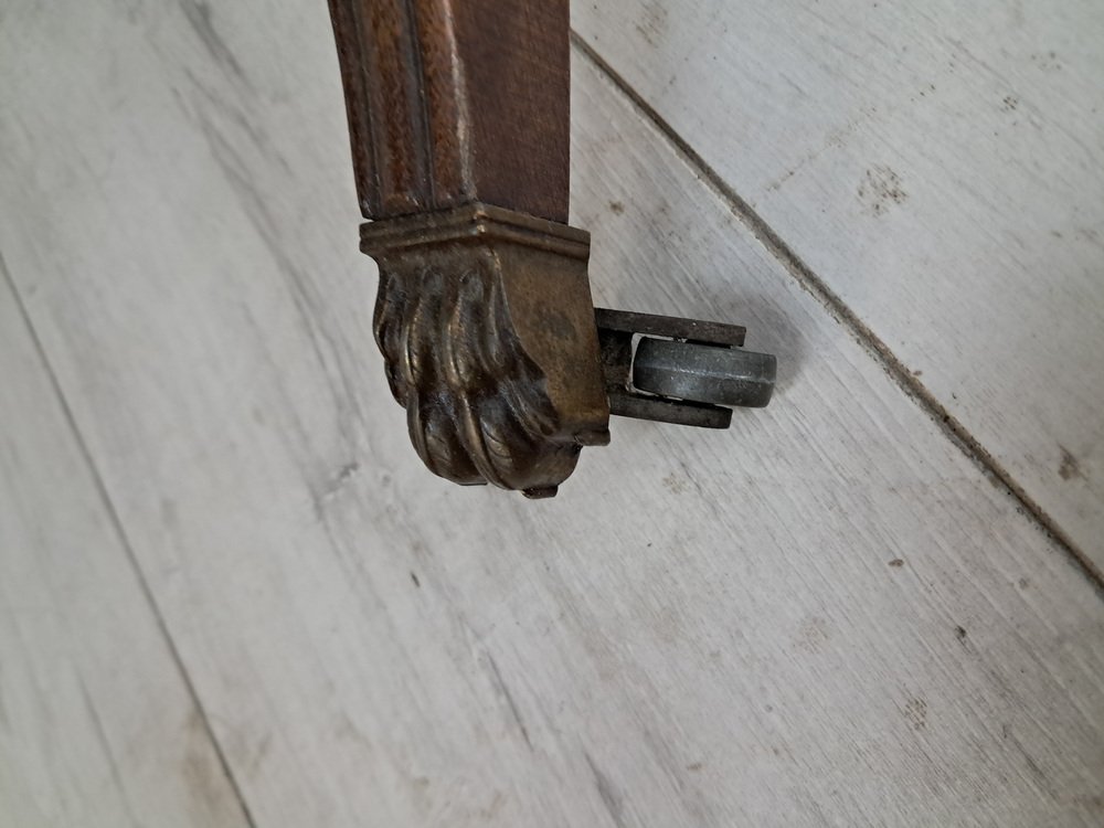 L'élégance de la table est encore accentuée par ses pieds sabres avec pattes et roulettes en laiton, reliés par une traverse décorative en bois tourné.