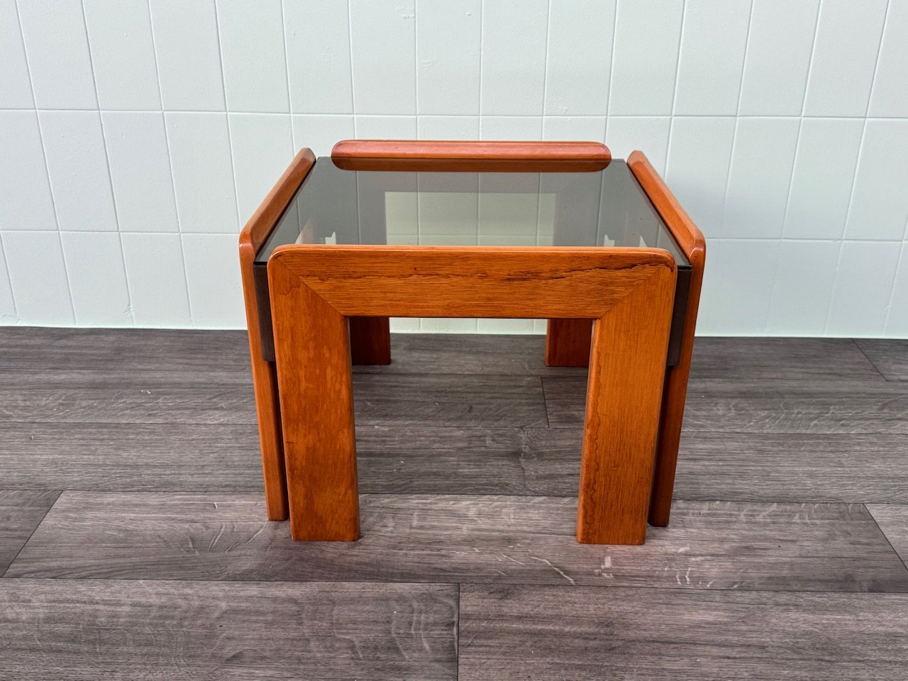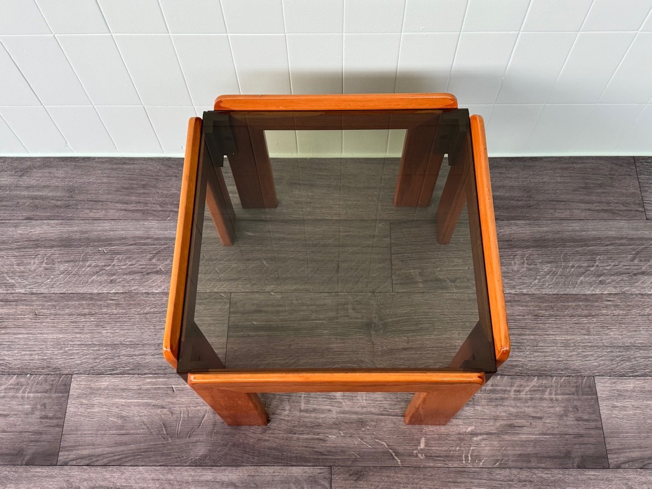 Fabriquée en bois de hêtre, la table présente une structure à la fois solide et légère. Le plateau en verre fumé, aux formes géométriques simples, est fini avec une attention méticuleuse aux détails, tandis que la surface en bois lisse et raffinée respire la chaleur et le raffinement.
