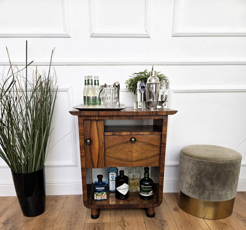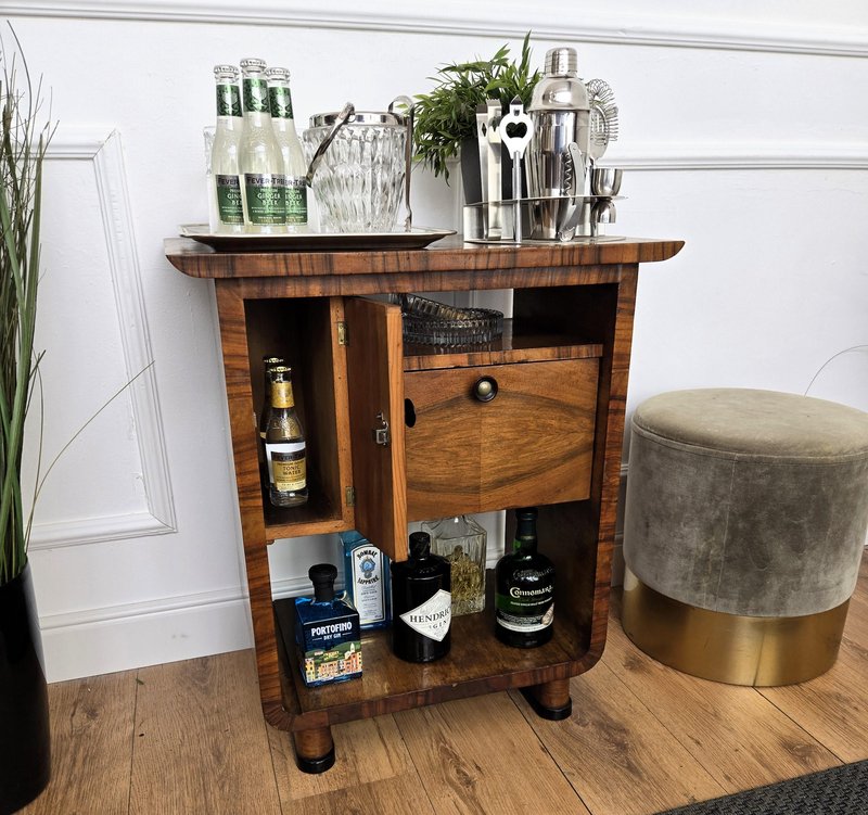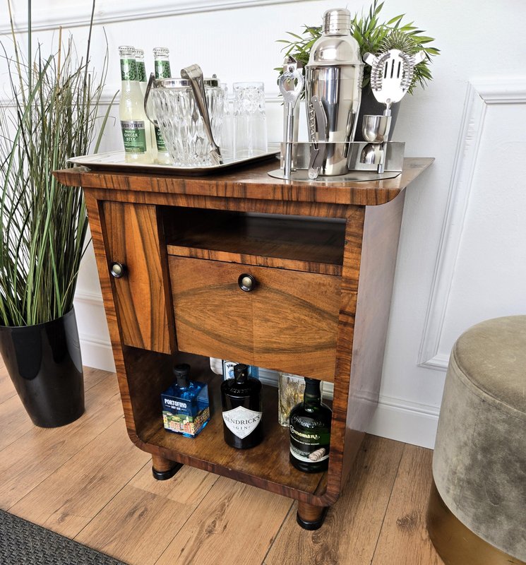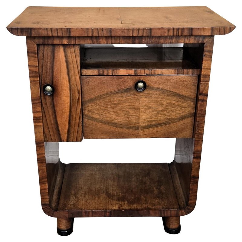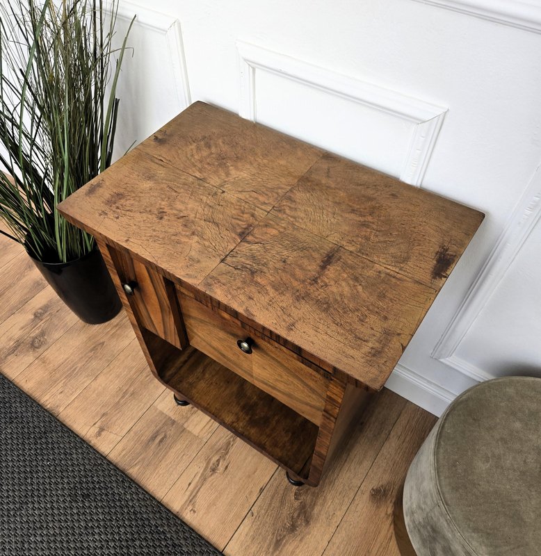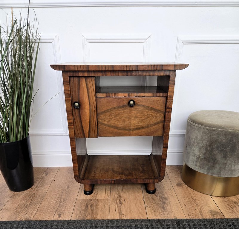 Very elegant Italian side table in typical Art Deco shape and materials with its beautiful wood, small side door and drawer, and the overall harmonic design. Its nice shape and look make it ideal as a side table with books and silver framed pictures as well as a bottle and glass liquor bar cabinet. The Art Deco style, that preceded Hollywood Regency and thereafter Mid-Century Modern, is all about making a big statement and was considered very glamorous, elegant, functional, and modern with softly shaped patterns and smooth angles.
