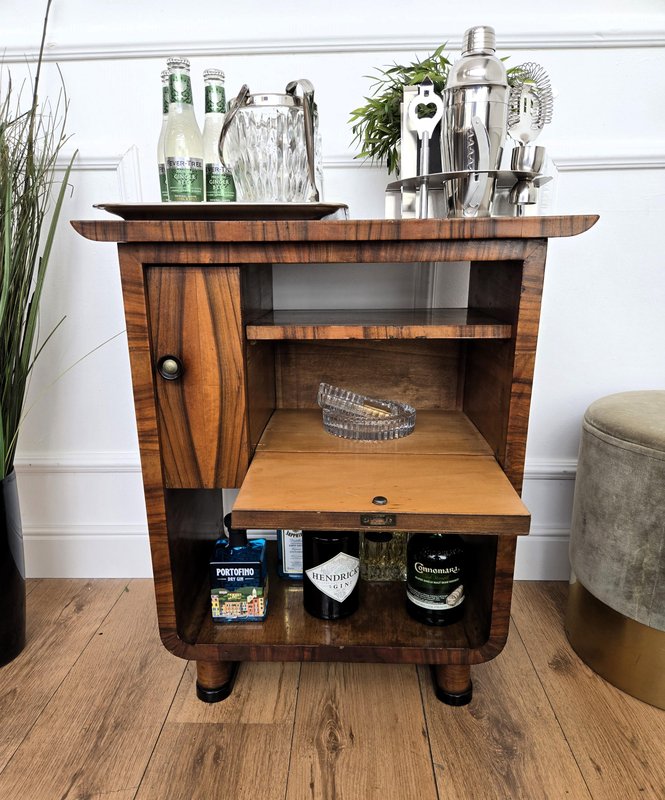 Très élégante table d'appoint italienne de forme et de matériaux typiquement Art déco avec son beau bois, sa petite porte latérale et son tiroir, et son design général harmonieux. Sa forme et son aspect agréables en font une table d'appoint idéale pour accueillir des livres et des tableaux encadrés d'argent, ainsi qu'un meuble de bar à bouteilles et à verres. Le style Art déco, qui a précédé le style Régence hollywoodienne et, par la suite, le style Moderne du milieu du siècle, a pour but de faire une grande déclaration et était considéré comme très glamour, élégant, fonctionnel et moderne avec des motifs aux formes douces et des angles lisses.