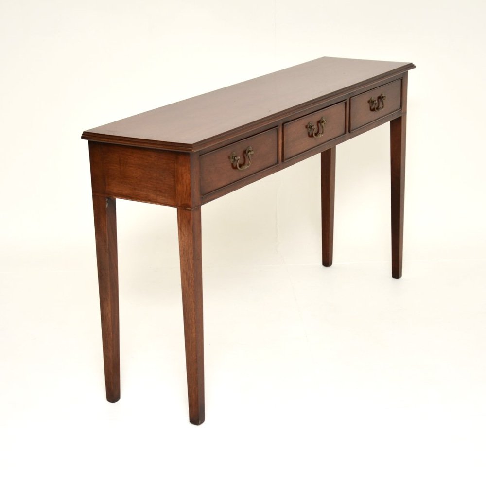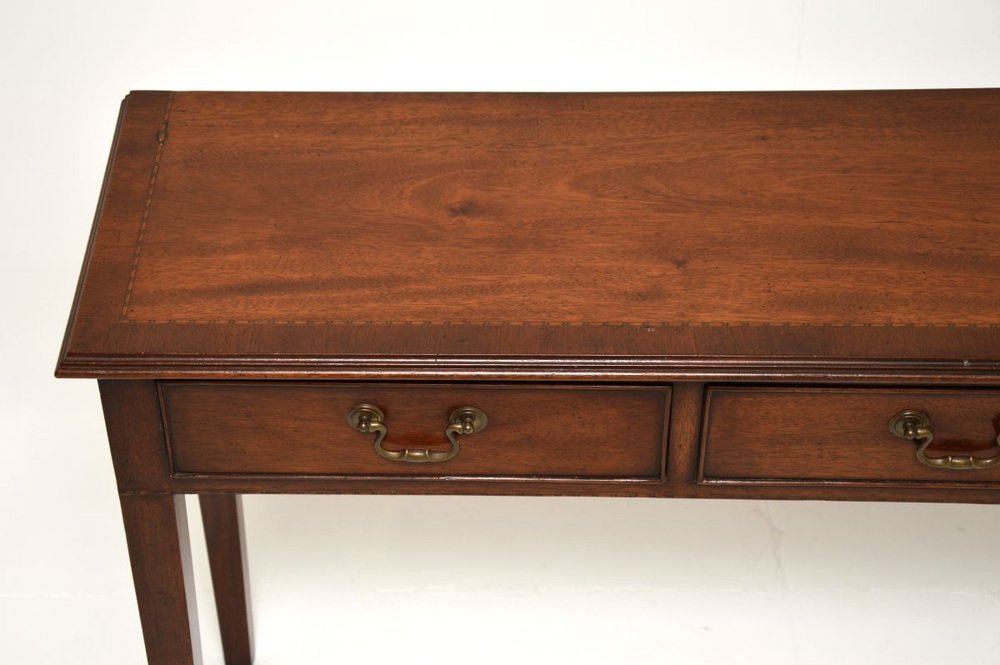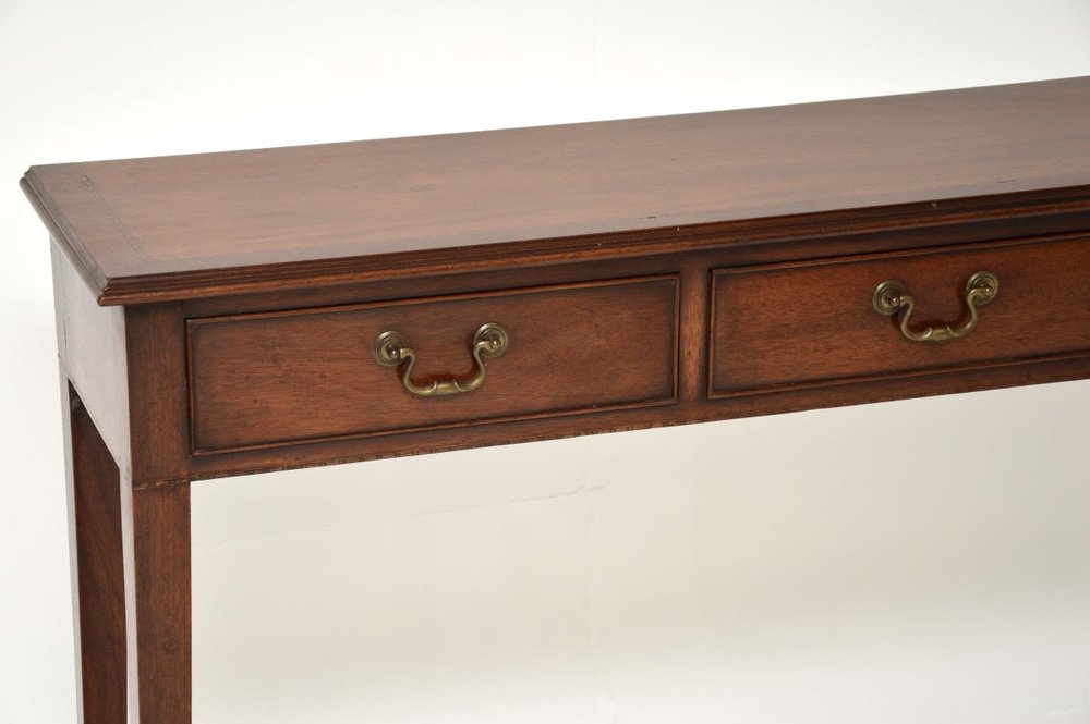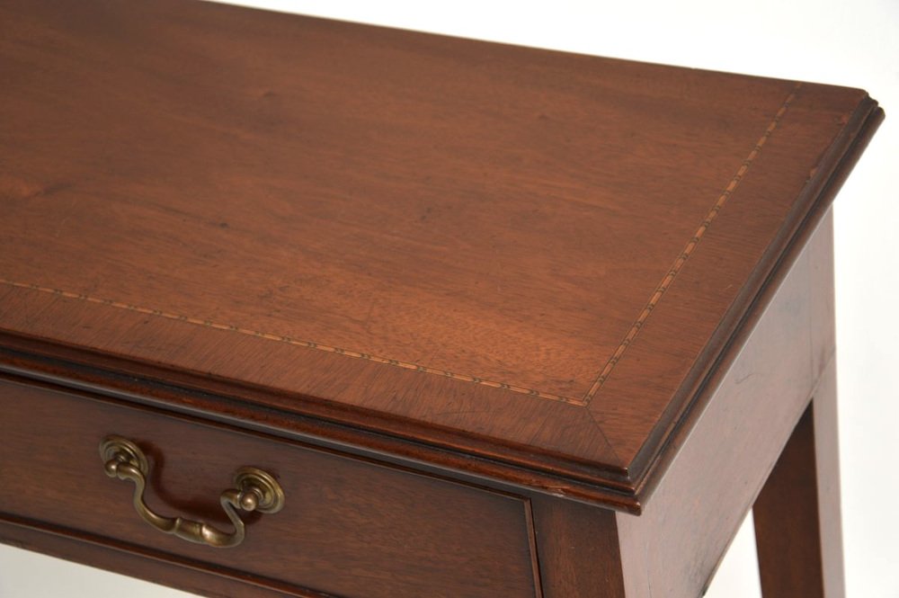 It is of superb quality, it is a very useful size; quite long, elegant and slender. The top has cross banded edges and beautiful inlaid satinwood banding. The drawers have high quality brass handles, this stands on nicely tapered legs. The wood has a gorgeous colour tone and patina, with lovely grain patterns.