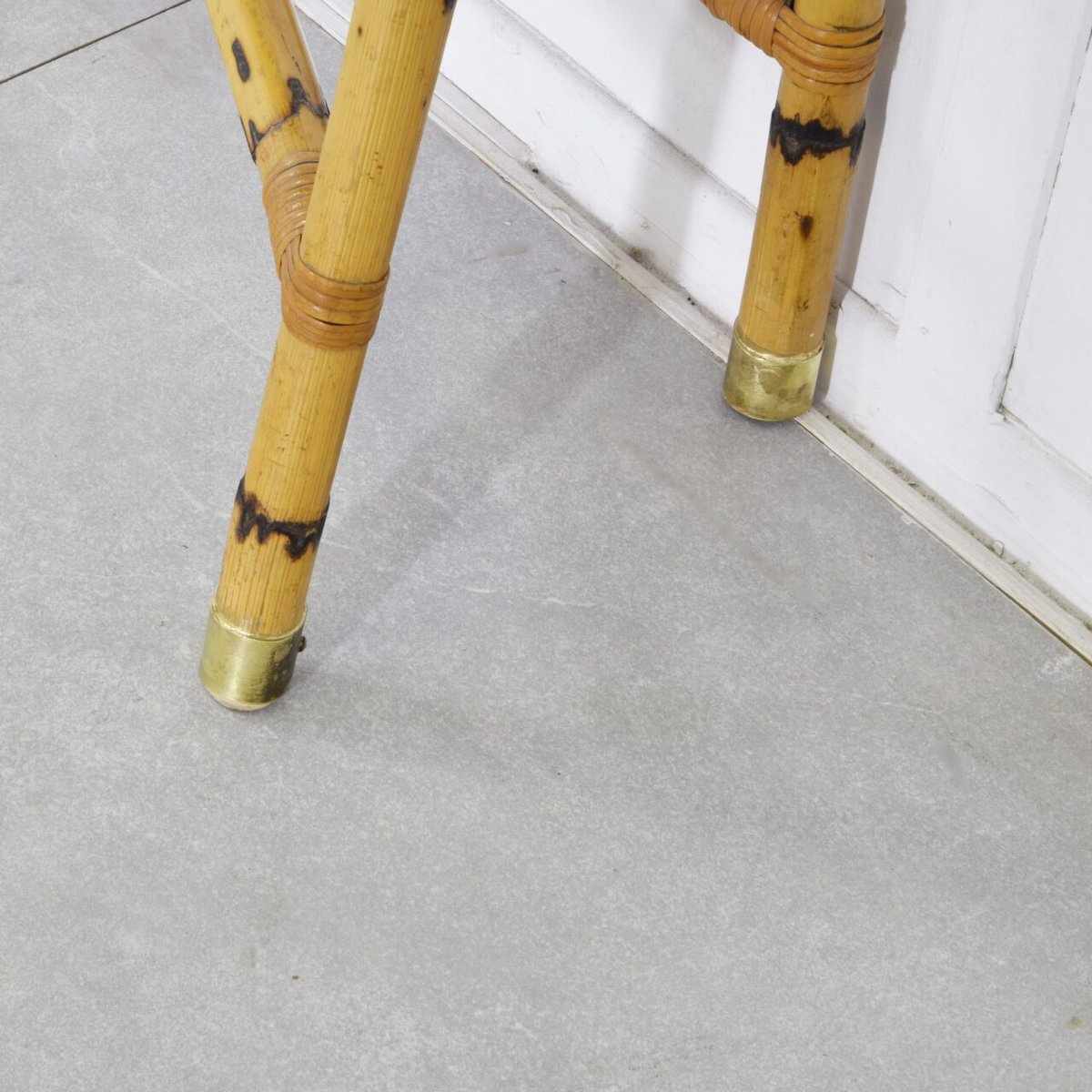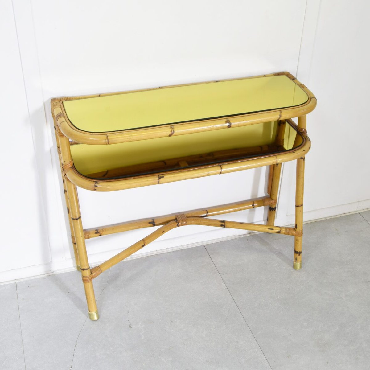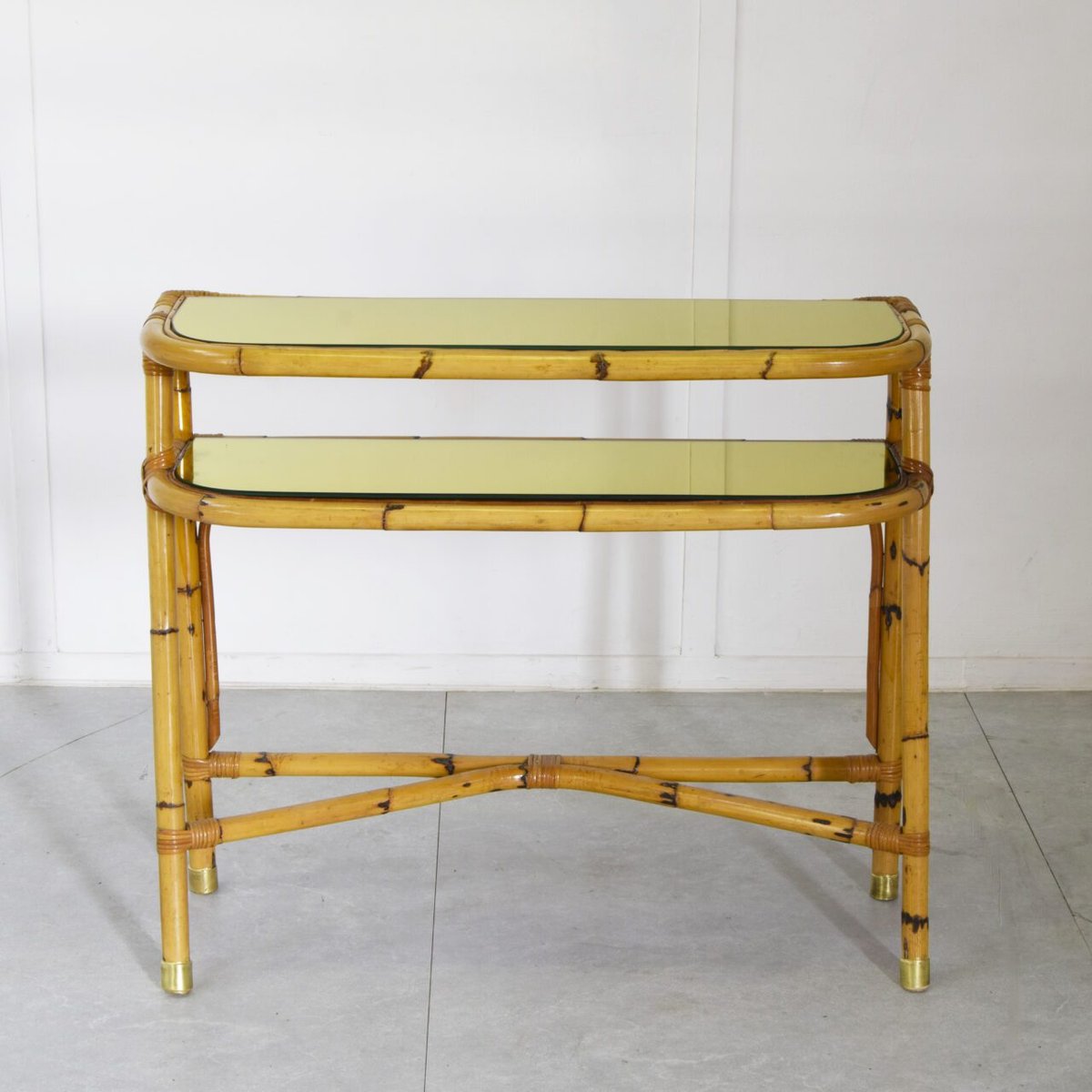 This vintage double-tiered console table perfectly embodies Midcentury Modern style with Hollywood Regency influences. The supporting structure is crafted from genuine, curved and tied natural bamboo, typical of Italian production from the 1950s and 1960s, displaying its characteristic patina. The two shelves are made of pale gold/champagne mirrored glass, a detail that lends an immediate touch of luxury and warm reflections. The finishing details, particularly the foot caps, are crafted from polished brass, adding a refined contrast to the natural material. The open construction, reinforced by a central crosspiece, makes it ideal as an accent piece or entryway piece in sophisticated settings.