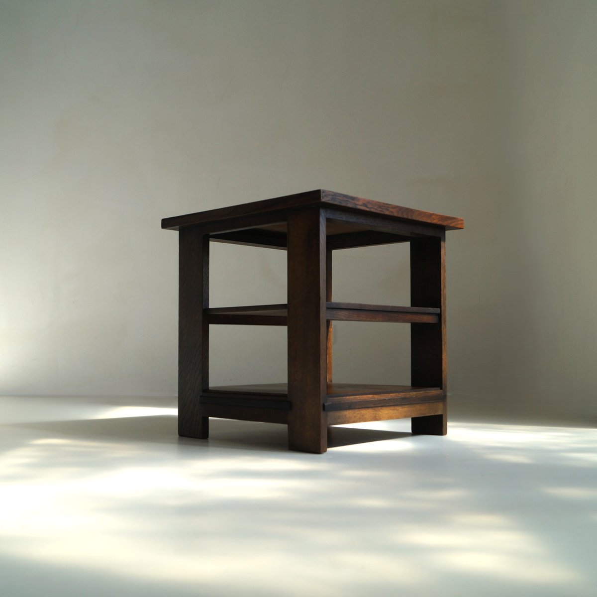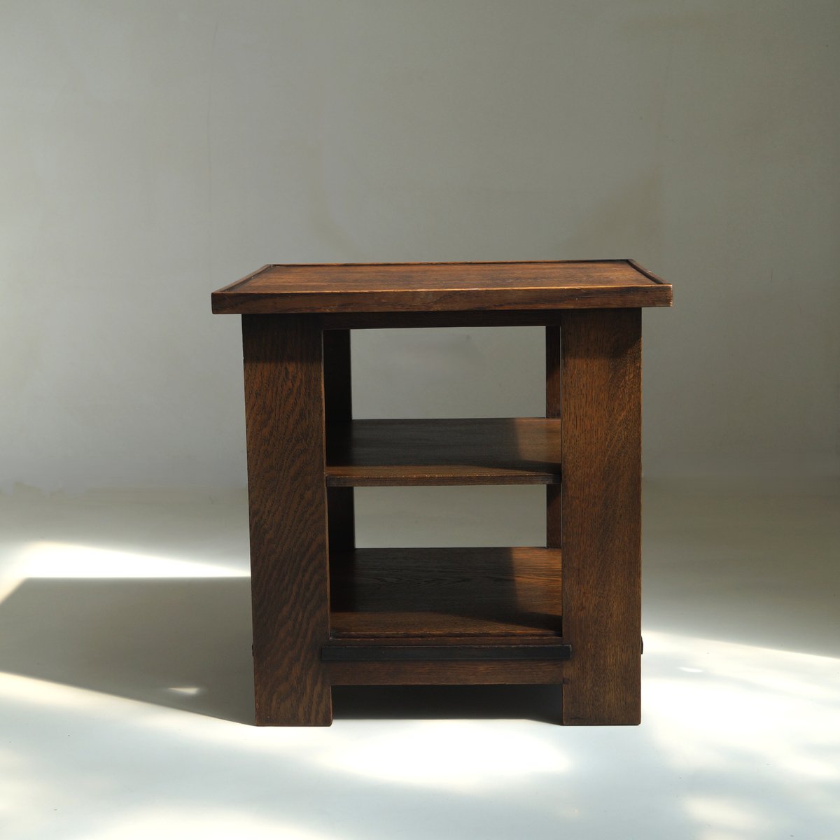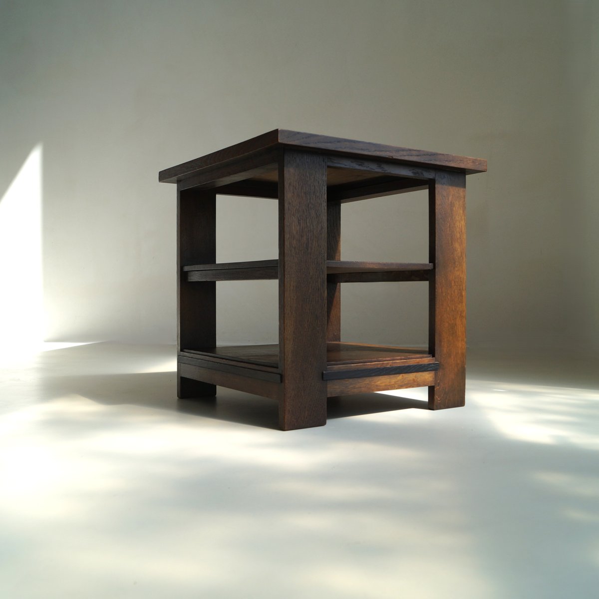 A three-tier side table in stained oak, produced in the 1920s by the pioneering Dutch furniture maker L.O.V. Oosterbeek. The table’s clean, rectilinear form is accented with subtle Hague School details, including understated blackened elements at the base. Its balanced proportions — a perfect 50 cm x 50 cm x 50 cm cube — give it a harmonious presence from every angle.