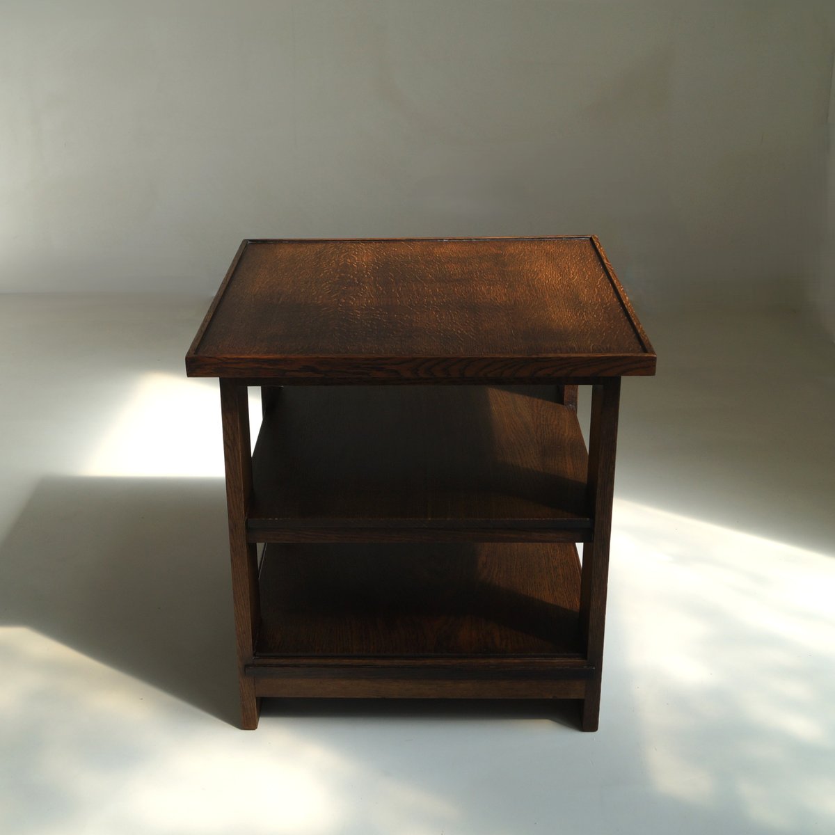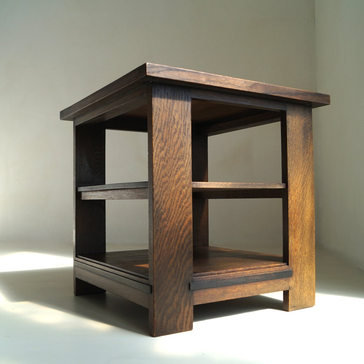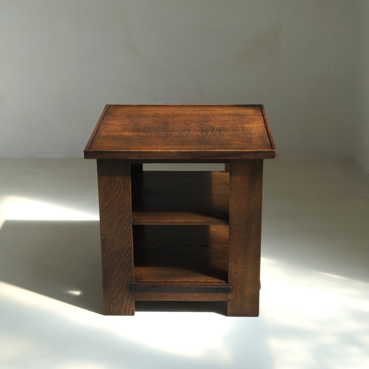 A three-tier side table in stained oak, produced in the 1920s by the pioneering Dutch furniture maker L.O.V. Oosterbeek. The table’s clean, rectilinear form is accented with subtle Hague School details, including understated blackened elements at the base. Its balanced proportions — a perfect 50 cm x 50 cm x 50 cm cube — give it a harmonious presence from every angle.