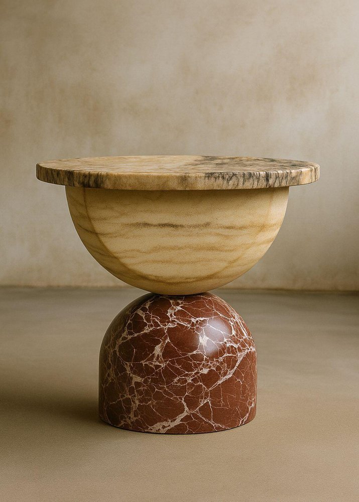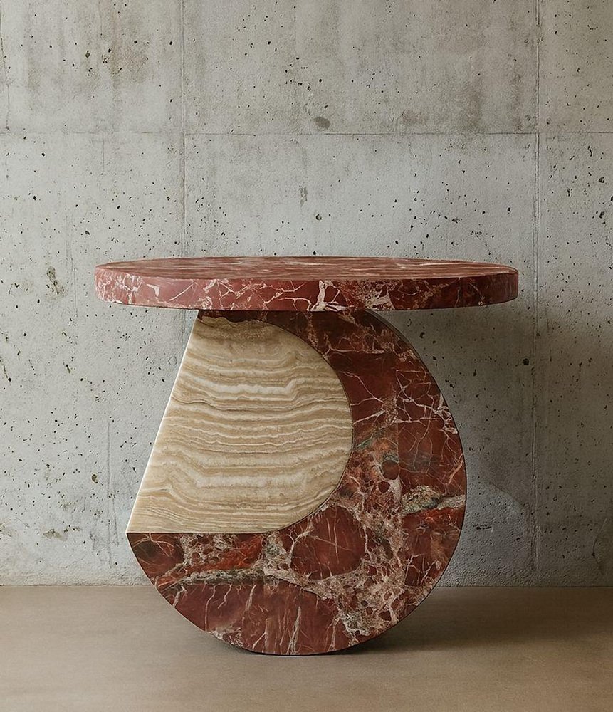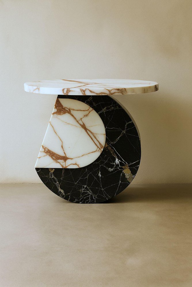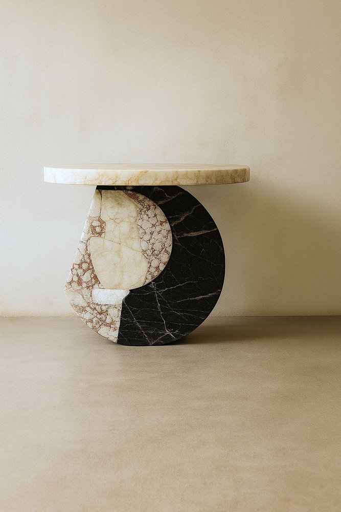 Moon Side Table in Marble & Onyx by Marsica Fossati Dimensions: Ø 55 x H 55 cm. Materials: Marble & onyx. Handcrafted in Italy, Mexico, or the USA. The series of artsy coffee tables blends stones and marbles featuring a feminine design characterized by graceful curves and organic shapes inspired by the mesmerizing phases of the moon. The elements of the tables are crafted with precision, embracing sinuous lines. The marble accents exude sophistication and refinement, mirroring the ethereal beauty of Moon's craters and valleys. The fusion of materials creates a harmonious juxtaposition of textures and tones. Marsica Fossati is an Italian designer and artist known for her eclectic creativity and meticulous attention to detail. She’s always inspired by the natural and mysticworld. Her practice has always been guided by a strong sensitivity to the relationship between form, material, and space, an approach that naturally extends into her artistic vision.