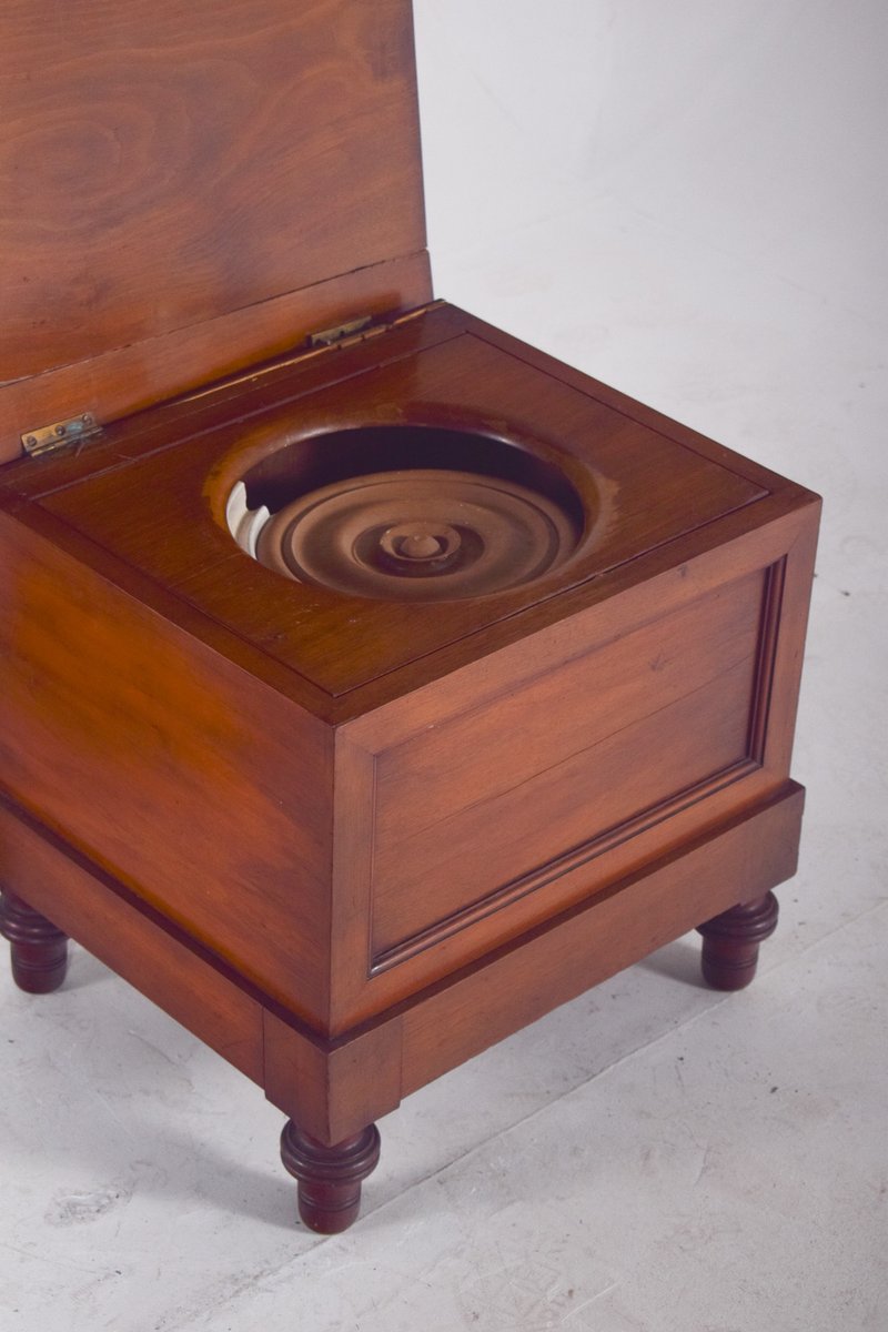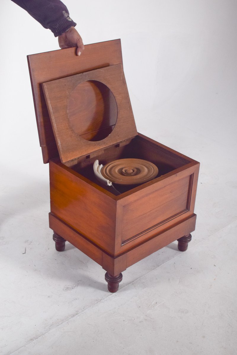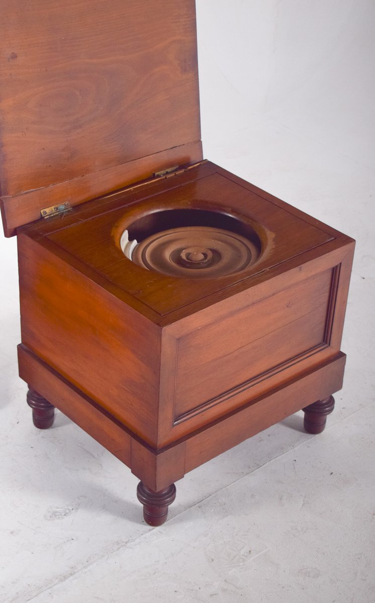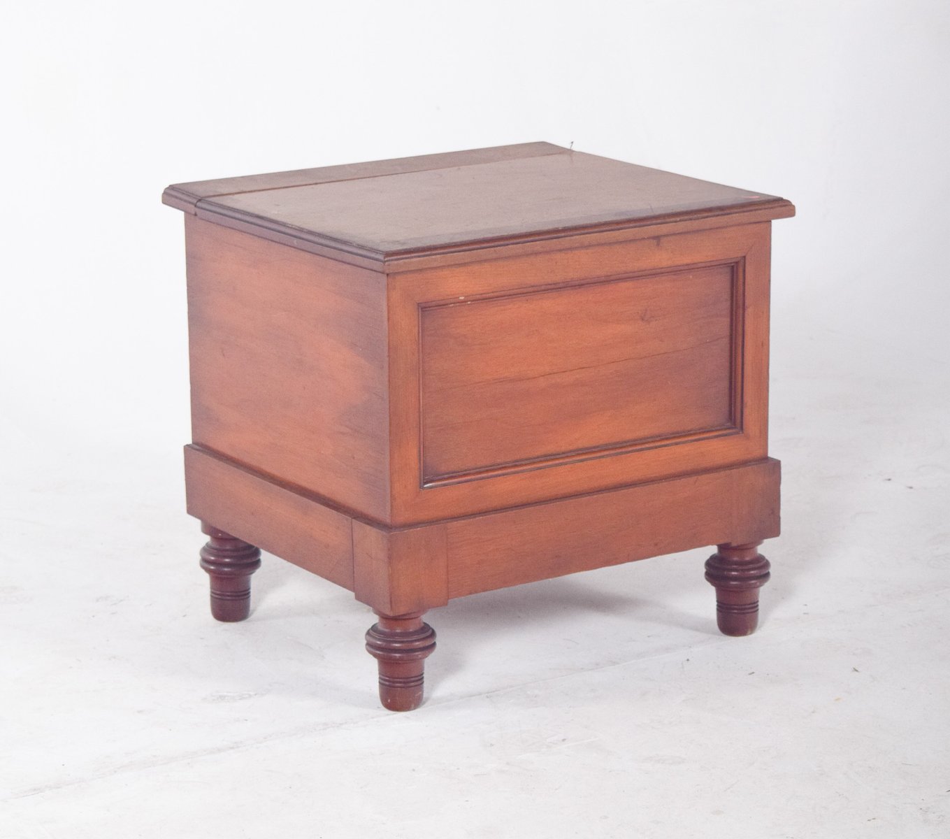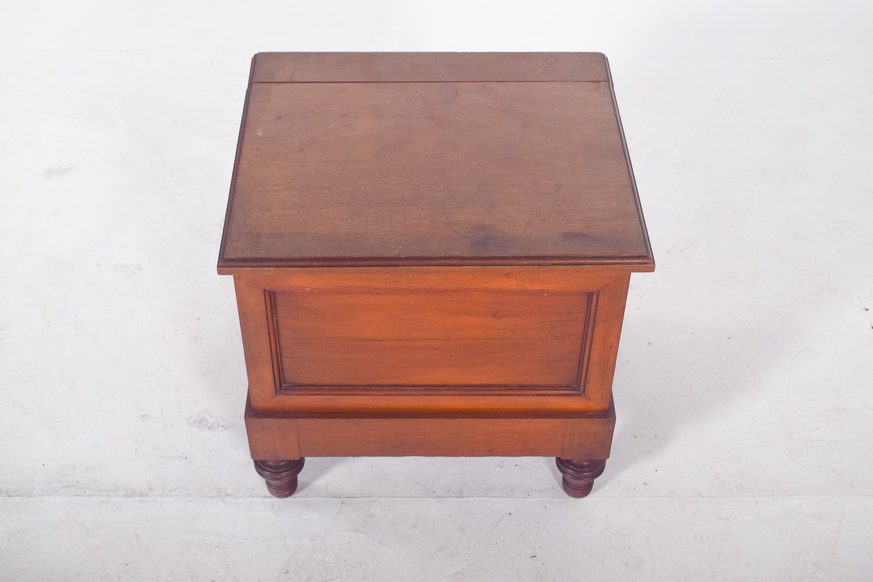 Antique wooden bedside table. Simple in shape, the top lid is hinged by metal hinges which reveal, when opened, a circular cut-out with a ceramic pot still inside. It rests on four short turned feet, typical of utilitarian period furniture, reinforcing its classic and functional style. The top and sides are in good condition, with few signs of wear, making it a well-preserved example of this type of 19th or early 20th century sanitary furniture.