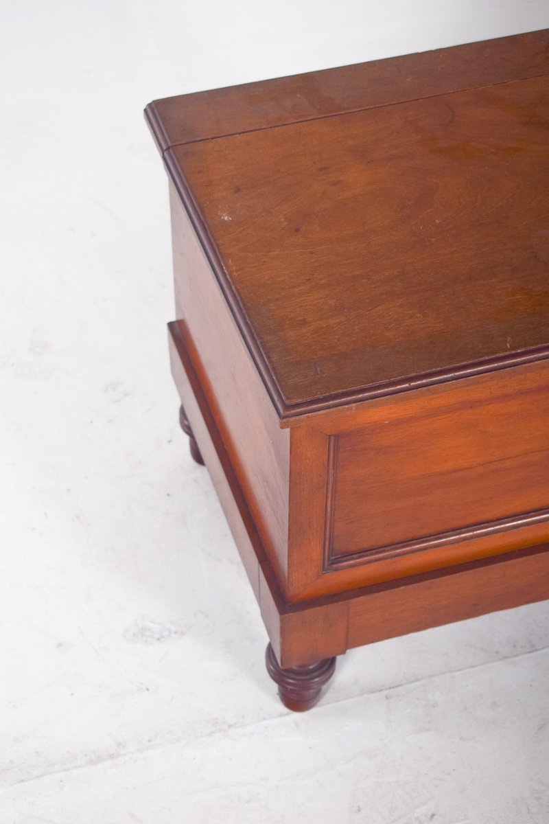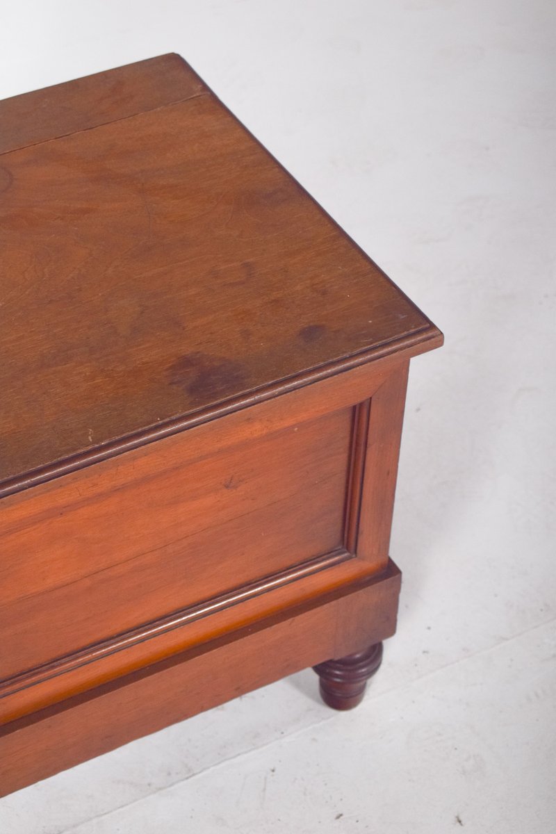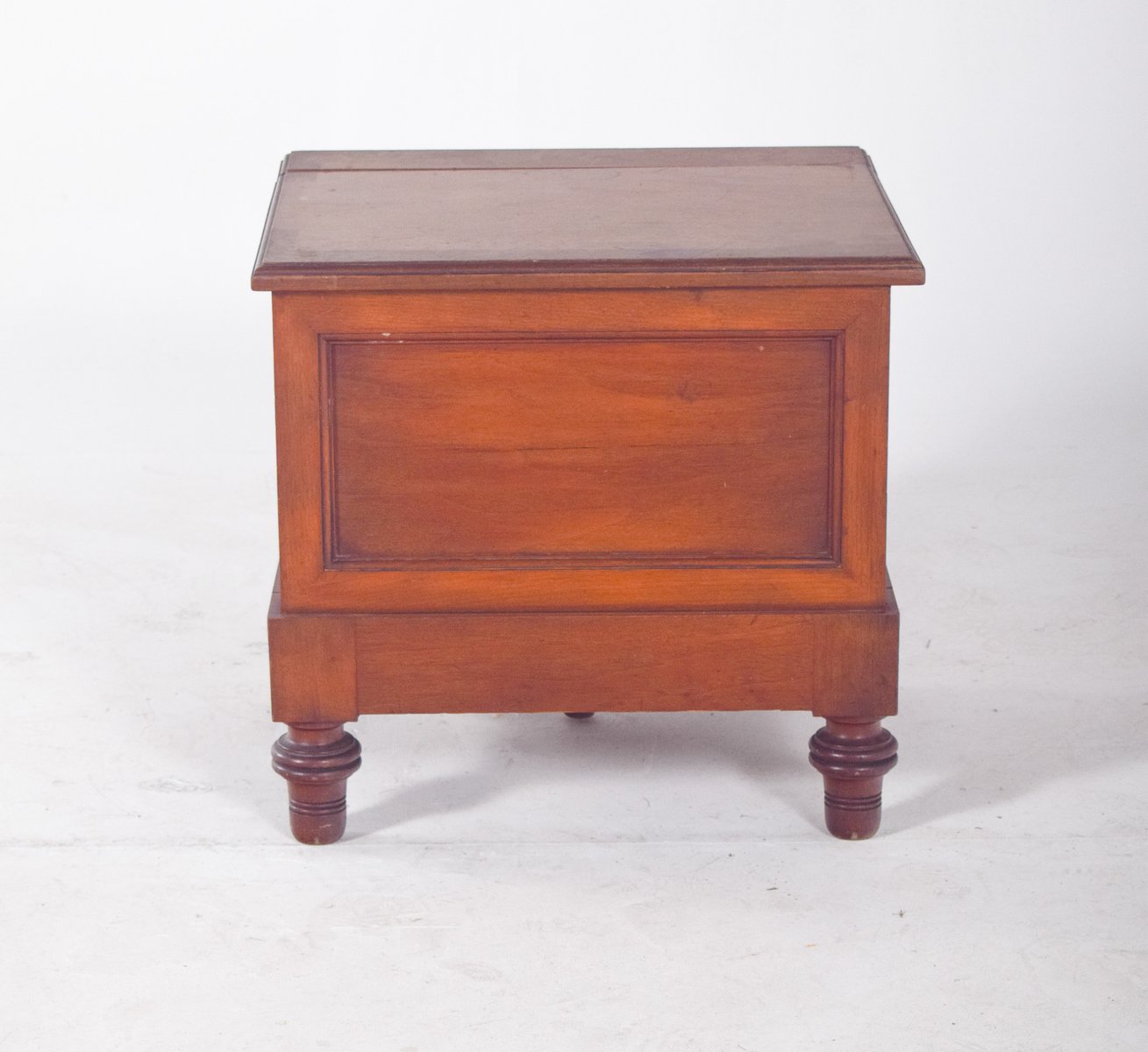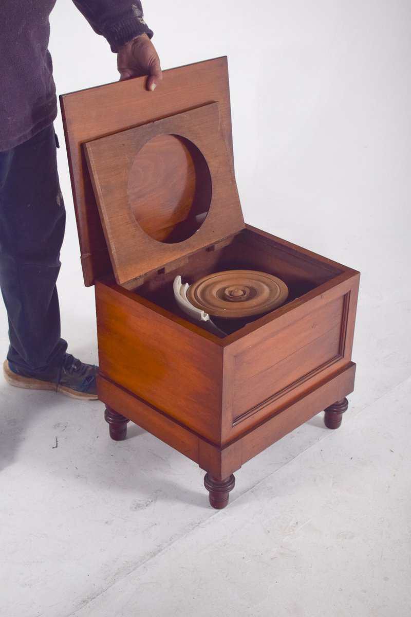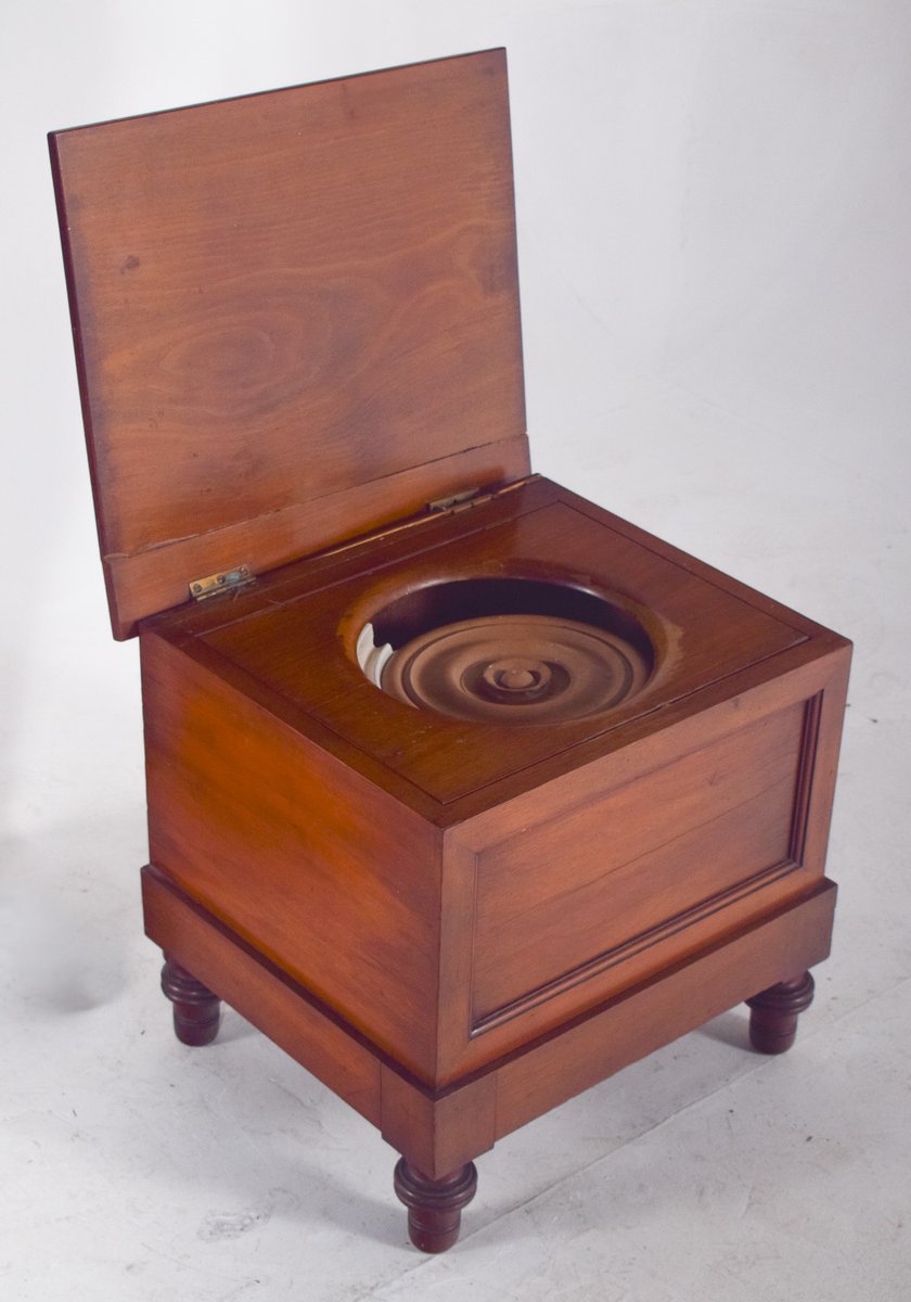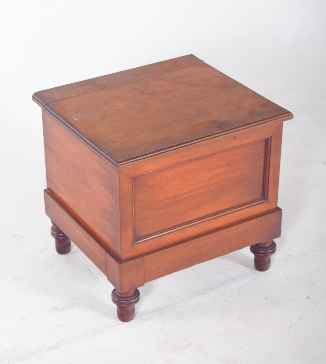 Antique wooden bedside table. Simple in shape, the top lid is hinged by metal hinges which reveal, when opened, a circular cut-out with a ceramic pot still inside. It rests on four short turned feet, typical of utilitarian period furniture, reinforcing its classic and functional style. The top and sides are in good condition, with few signs of wear, making it a well-preserved example of this type of 19th or early 20th century sanitary furniture.