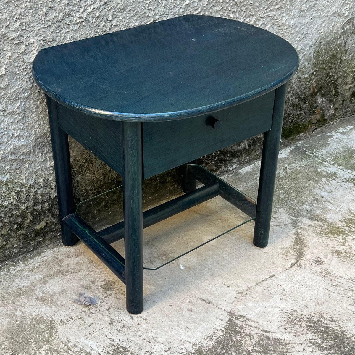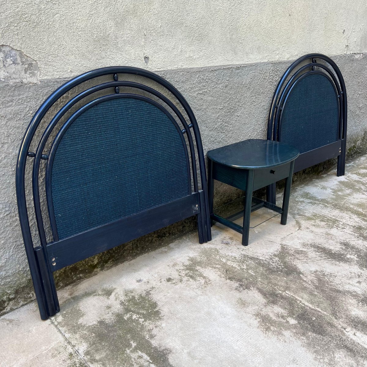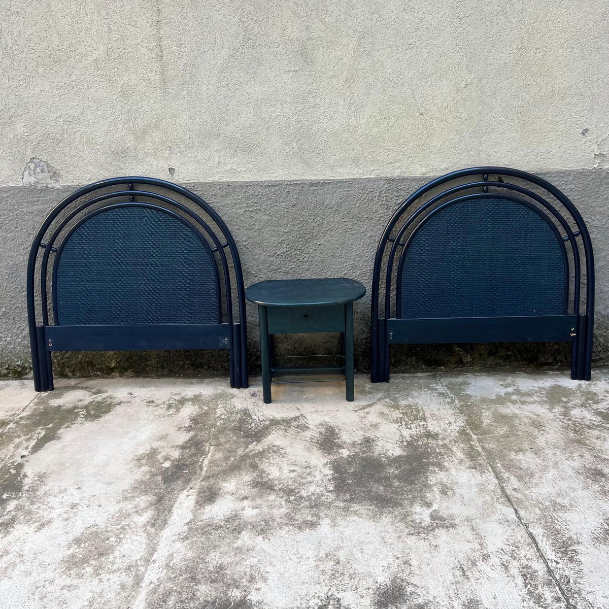 Single bedside table ideal for placement between two single beds with a refined deep blue finish. This bedside table, produced in the 1980s by the Italian company Roberti Rattan, is a perfect blend of classic design and quality craftsmanship. The side table is part of a set that also includes two matching wood and rattan headboards for single beds. The set can be purchased in its entirety or the headboards and bedside table can be sold separately, depending on the buyer's needs. Founded in the 1950s by Renato Roberti, the Roberti Rattan company quickly became a landmark in the designer furniture industry, thanks to its innovative use of rattan and other natural fibers. Based in Italy, Roberti Rattan has distinguished itself through the elegance and quality of its creations, which combine traditional craftsmanship and modernity. Over the years, Roberti Rattan has collaborated with some of the biggest names in design and architecture, including *Gianfranco Frattini* and *Franco Albini*, helping to develop products that reflect a passion for design and attention to detail. These collaborations have led to numerous awards and recognitions in the field of design, consolidating the company's reputation both in Italy and internationally. The company has received numerous awards and recognition due to the quality and innovation of its products. Roberti Rattan has been exhibited in major international exhibitions and fairs, gaining wide critical and public acclaim. This bedside table along with the matching headboards provides a unique opportunity to add a touch of elegance and history to any room. Whether you choose to purchase the entire set or just one piece, each element reflects the craftsmanship and timeless design that have made Roberti Rattan a benchmark brand in the furniture world.