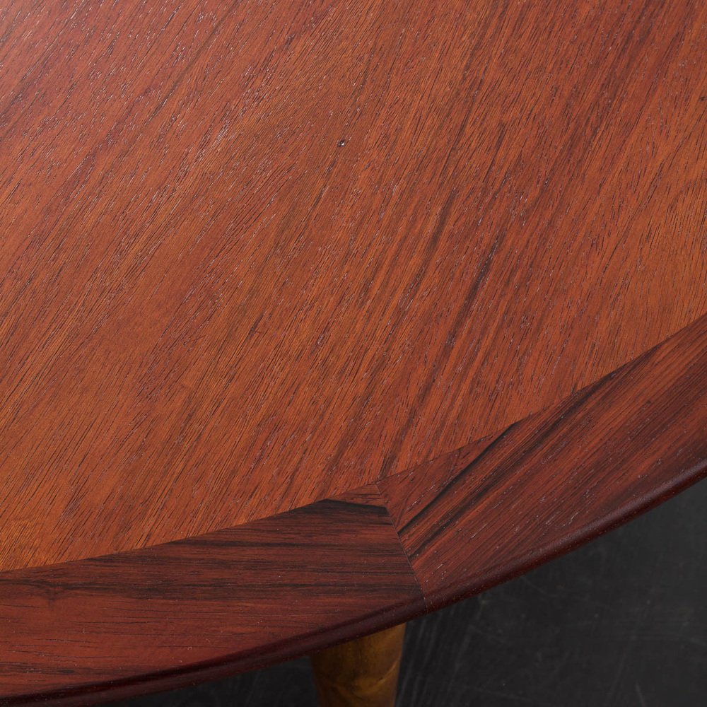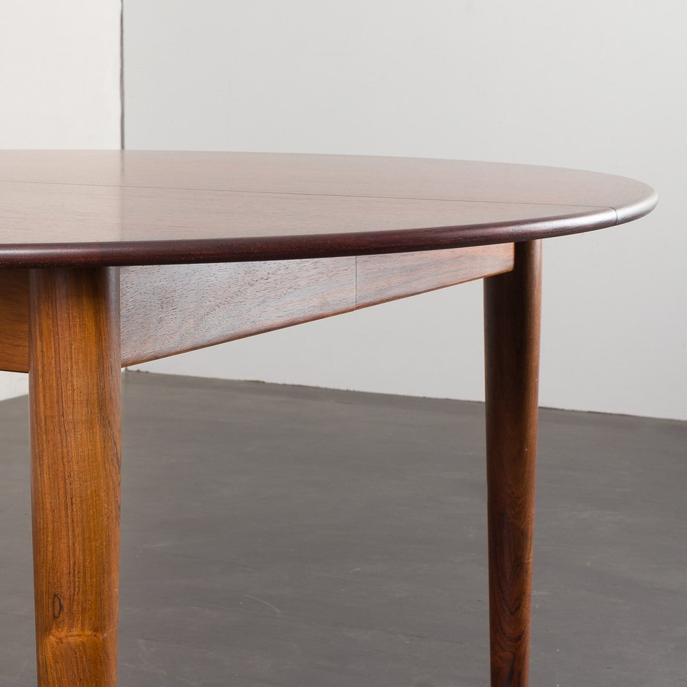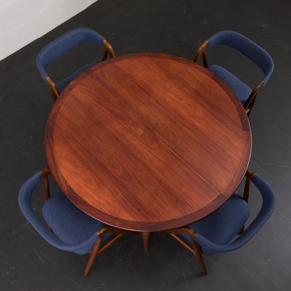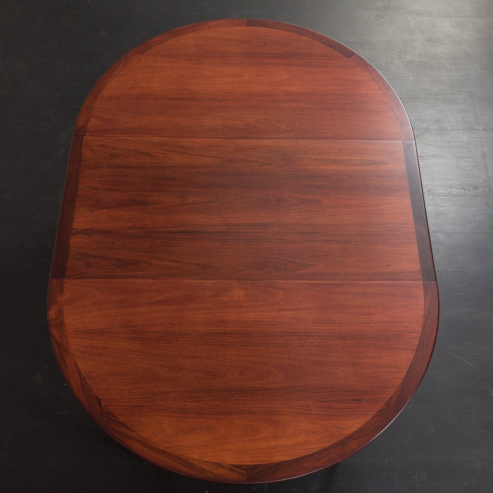 The superior quality circular extension dining table, veneered in rosewood, was designed in 1956 by Grete Jalk, one of the most famous female designers of the Danish mid-century period. This model 'PJ 2-5' was manufactured by P. Jeppesen in the 1960s, as validated by the preserved manufacturer’s label. The table features one additional leaf 55 cm wide, perfectly matched with the wood grain of the tabletop. The beautiful finish made out of solid rosewood sculptured moldings on the rim gives the table a unique look, making it a decoration in itself.