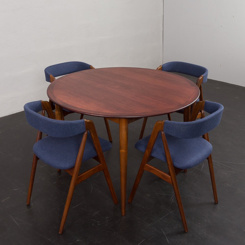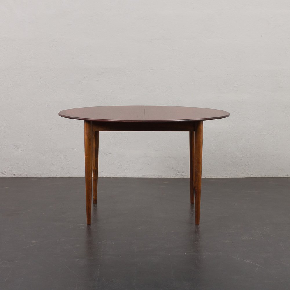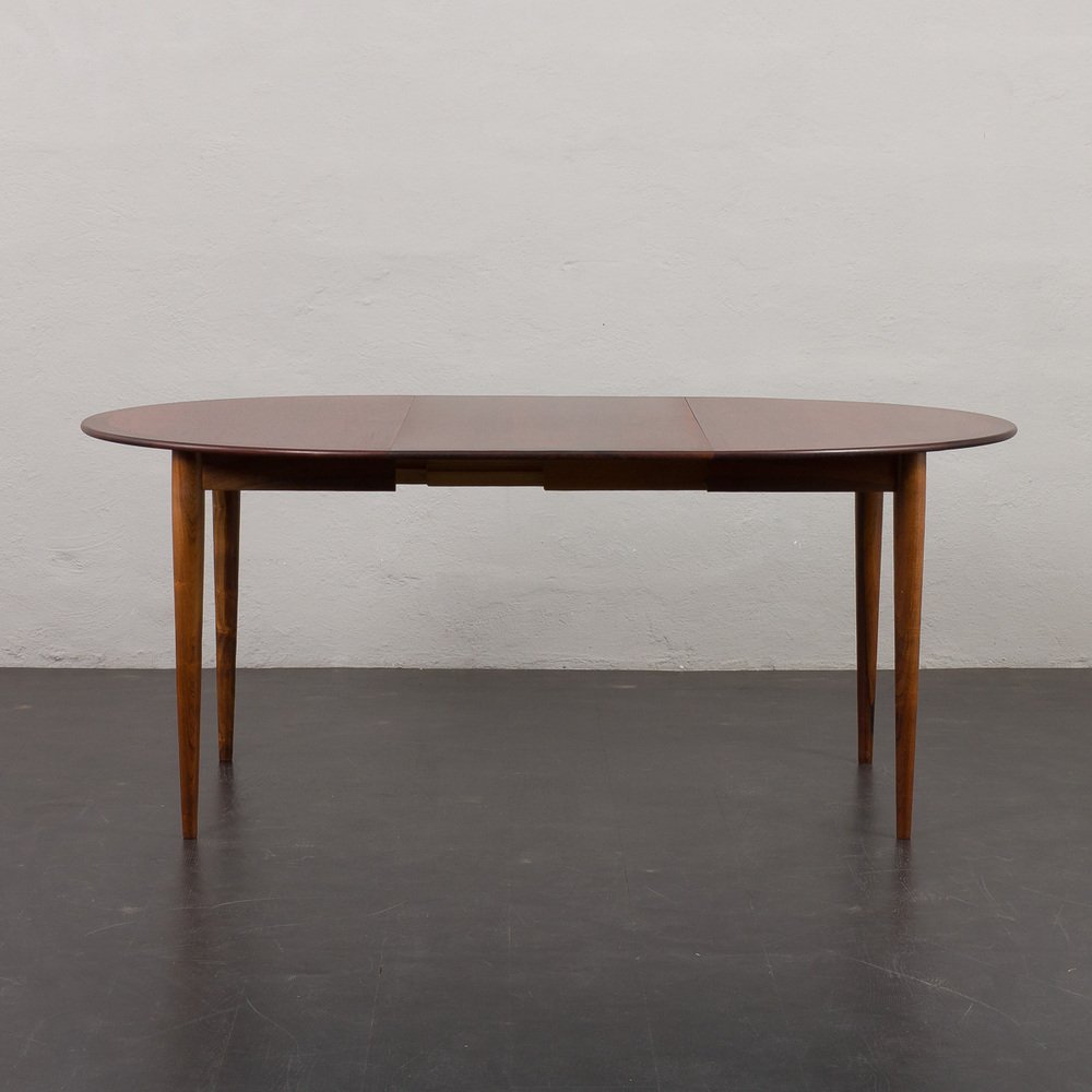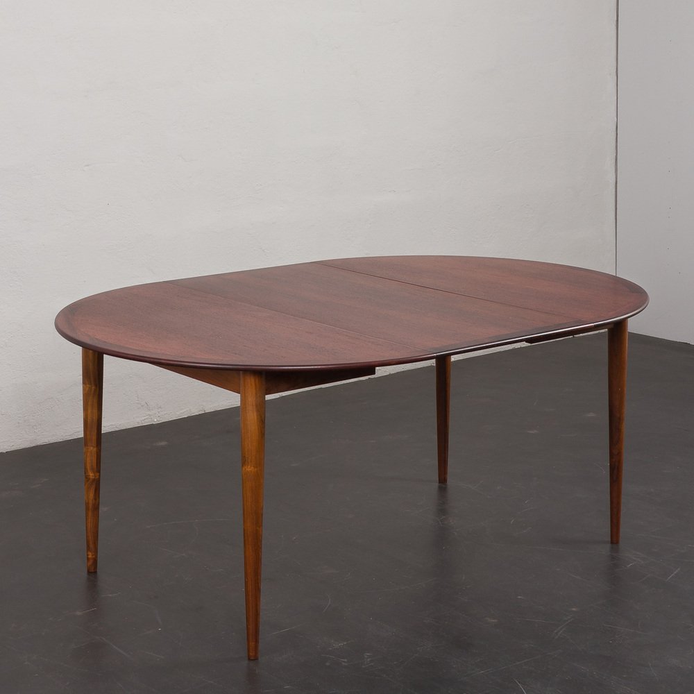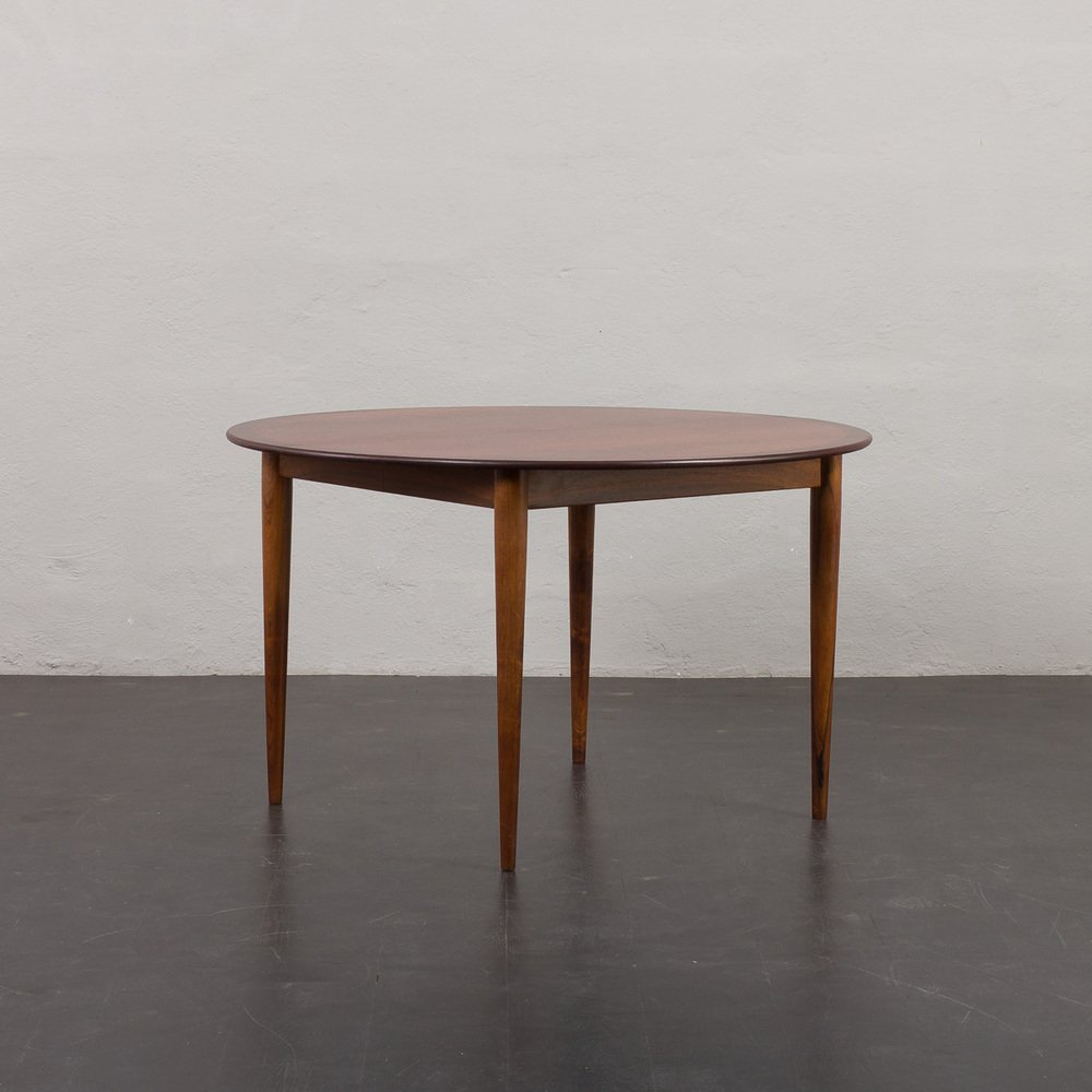 The superior quality circular extension dining table, veneered in rosewood, was designed in 1956 by Grete Jalk, one of the most famous female designers of the Danish mid-century period. This model 'PJ 2-5' was manufactured by P. Jeppesen in the 1960s, as validated by the preserved manufacturer’s label. The table features one additional leaf 55 cm wide, perfectly matched with the wood grain of the tabletop. The beautiful finish made out of solid rosewood sculptured moldings on the rim gives the table a unique look, making it a decoration in itself.