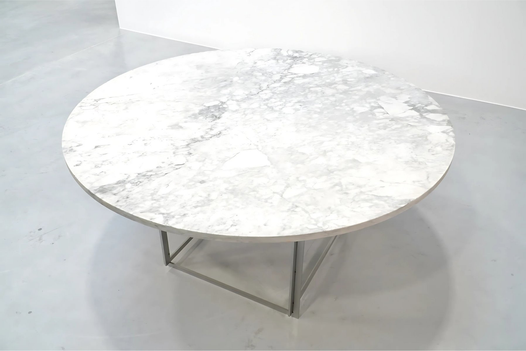 Fantastic minimalist dining table PK54 designed by Poul Kjaerholm and manufactured by Ejvind Kold Christensen in Denmark during the 1960s. This exceptional piece blends two geometric shapes, the square and the circle, combining a brushed satin stainless steel base with an extraordinary original and rare flint-rolled cipollini marble top. This particular marble with its green-beige hue and patterns of white and grey, reminiscent of the layers of an onion, hence its Italian name 'cipollino', is one of the few original stone tops utilized by EKC for these tables.