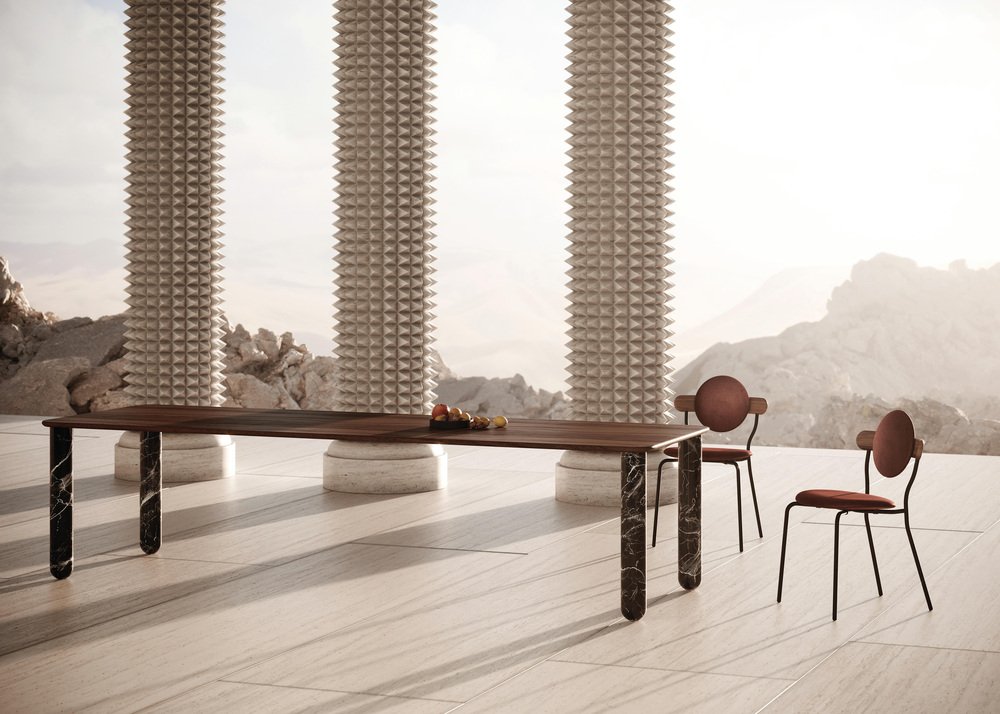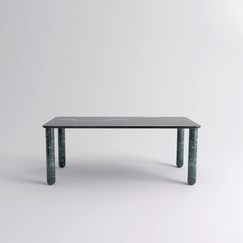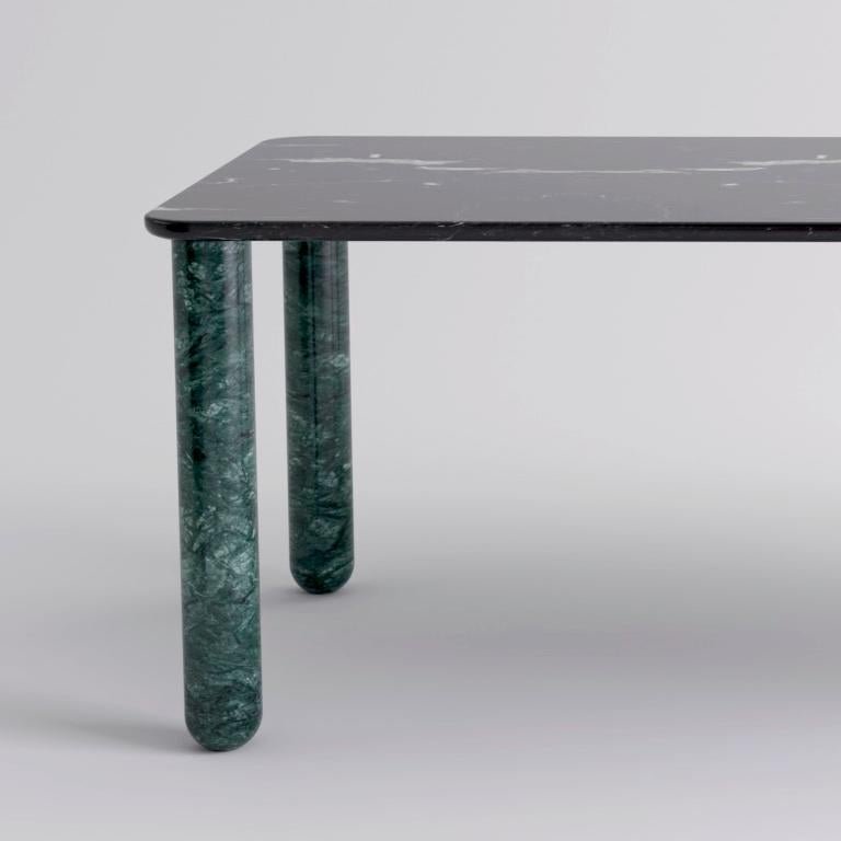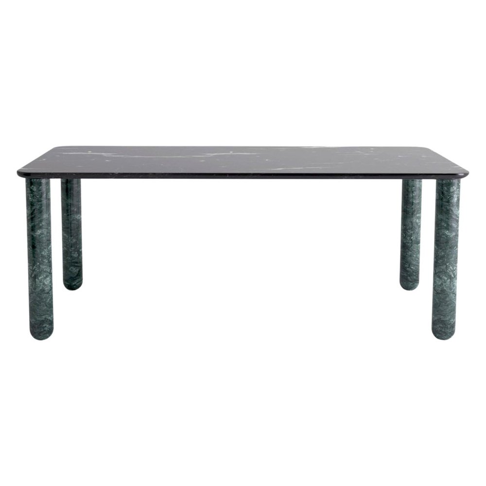 X large black and green marble "Sunday" dining table, Jean-Baptiste Souletie Dimensions: 200 W x 100 D x 74.5 H cm Materials: Indian green marble legs, black marquina marble top. Different finishes and sizes are available. Sunday is a family of dinner tables, coffee tables and consoles with a simple and sculptural design. The mix of heavy marble legs and a thin solid wood top creates an interesting contrast while the rounded edges and generous proportions provide a comforting feeling. Sunday is all about the materials: 3 marbles and 2 woods are available in the collection. Sunday comes in a wide variety of dimensions and 2 different marble legs heights to perfectly fit your interior whether you need a small coffee table, a large one, a console, or even a dinner table that will seat 10 guests on a friendly Sunday lunch.