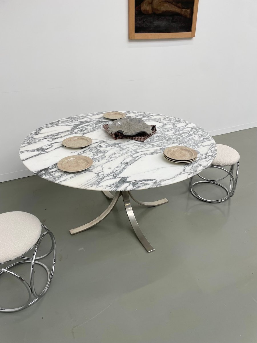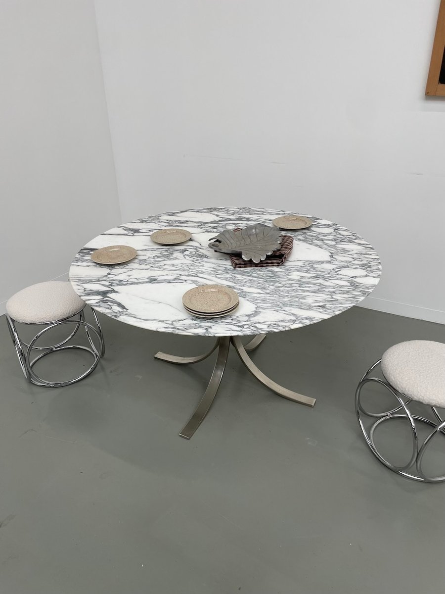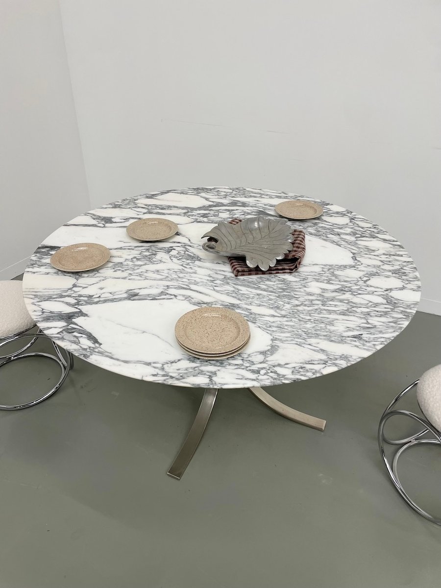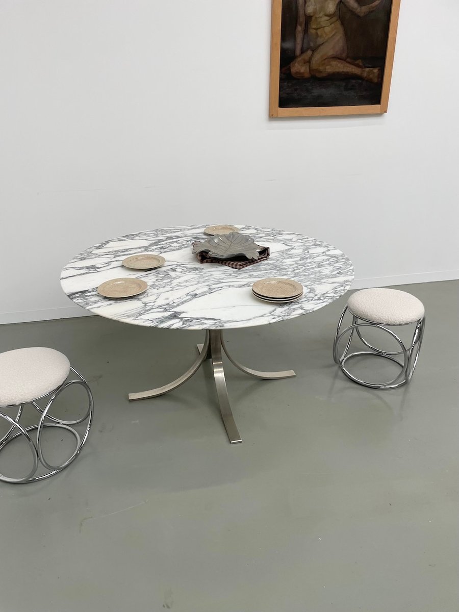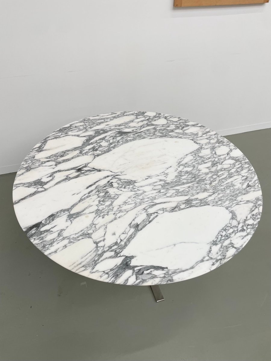 Ancienne table avec son plateau rond en marbre blanc et son piètement chromé type fleuri, dans le goût de Osvaldo Borsani modèle T69.