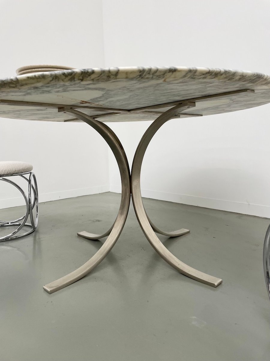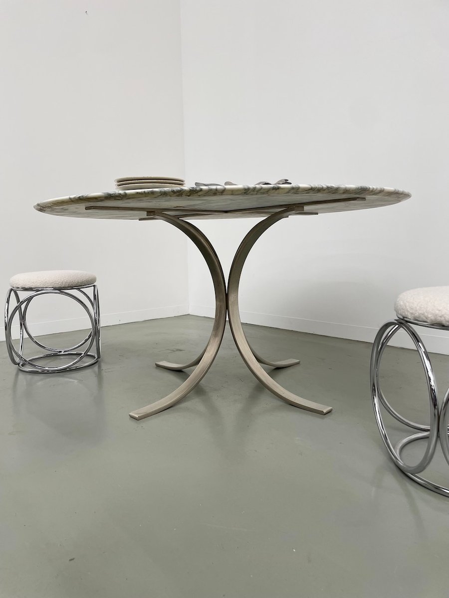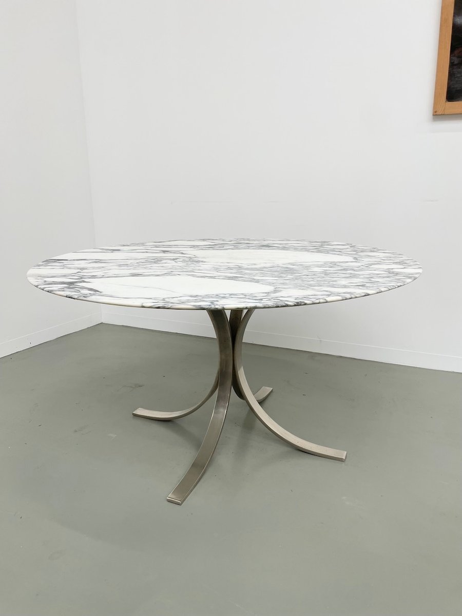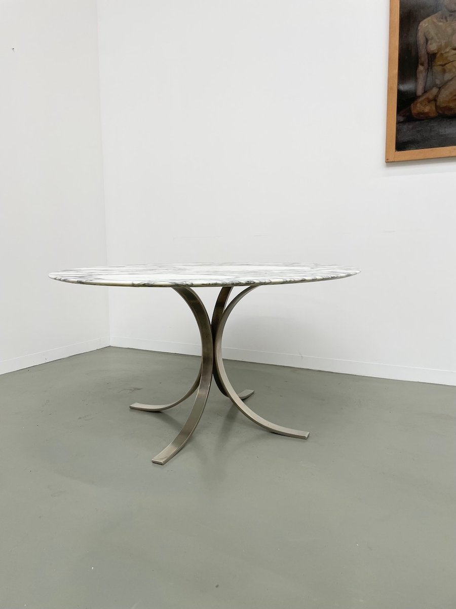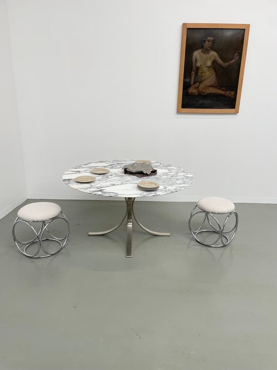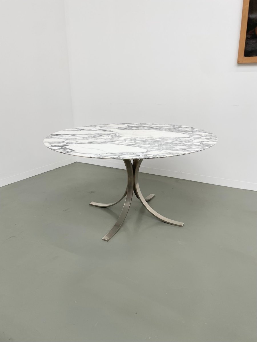Ancienne table avec son plateau rond en marbre blanc et son piètement chromé type fleuri, dans le goût de Osvaldo Borsani modèle T69.
