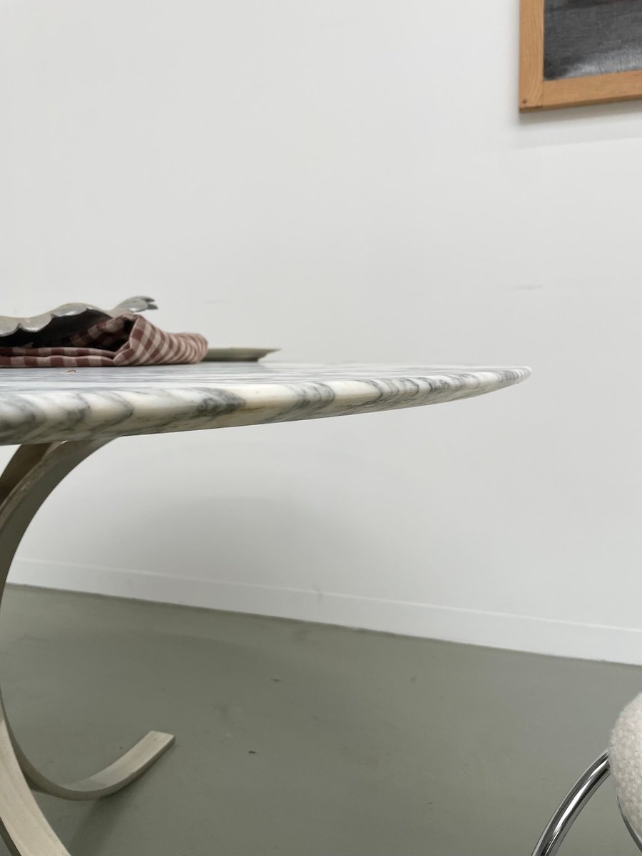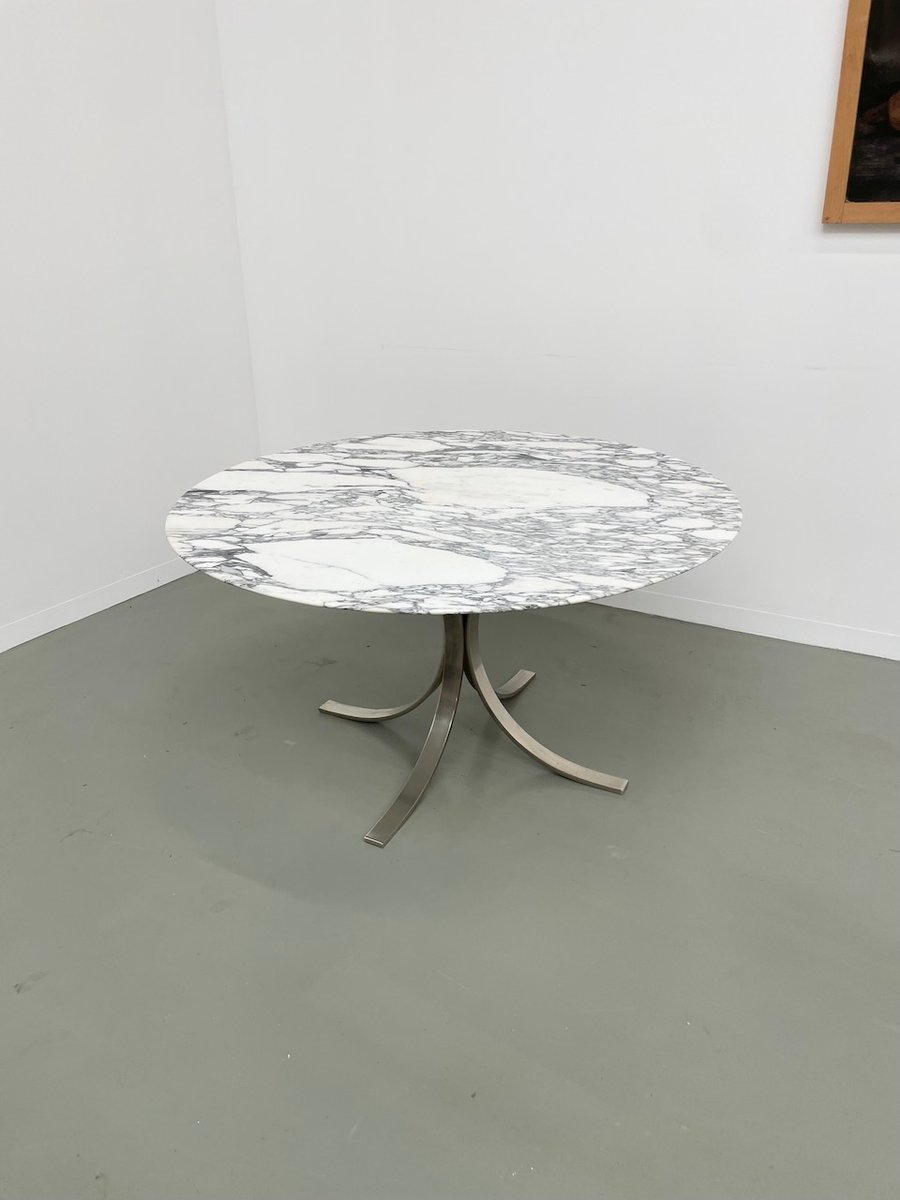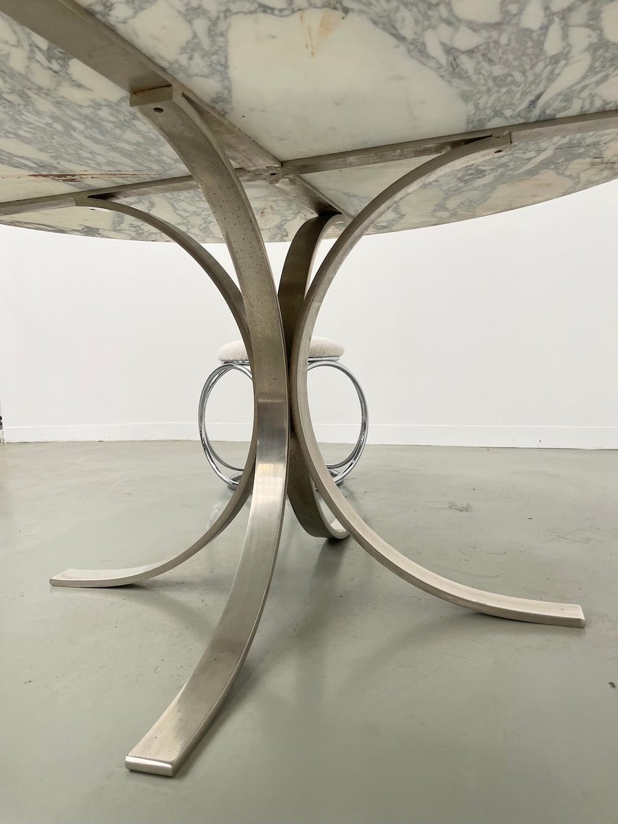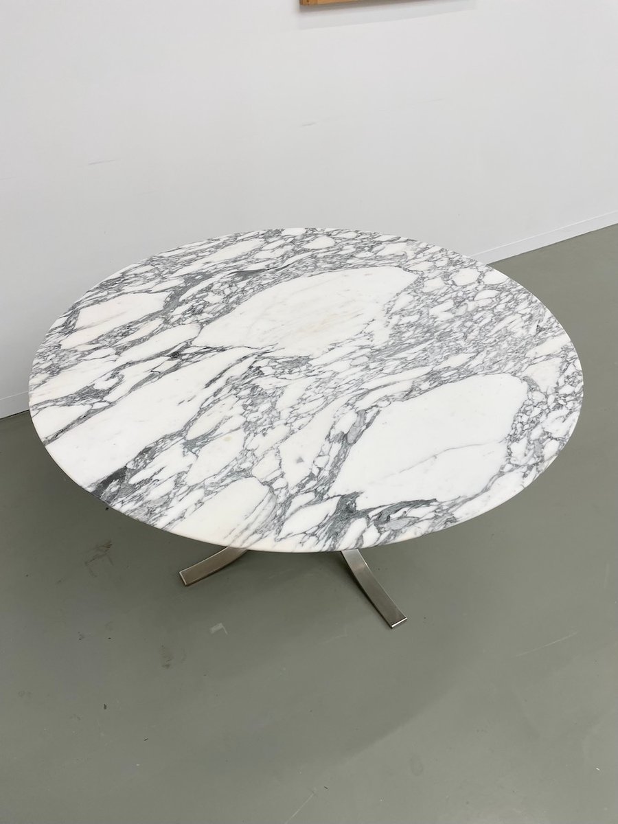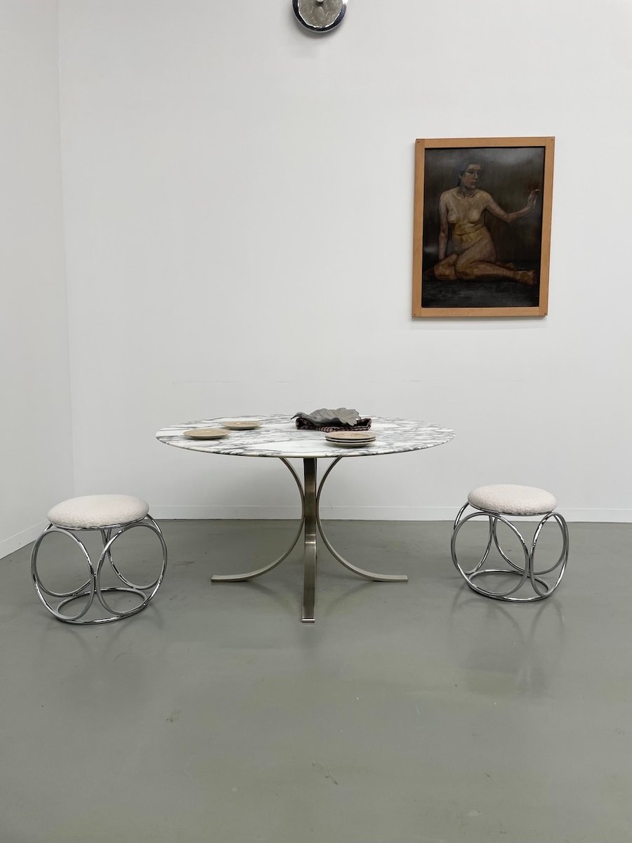 Ancienne table avec son plateau rond en marbre blanc et son piètement chromé type fleuri, dans le goût de Osvaldo Borsani modèle T69.