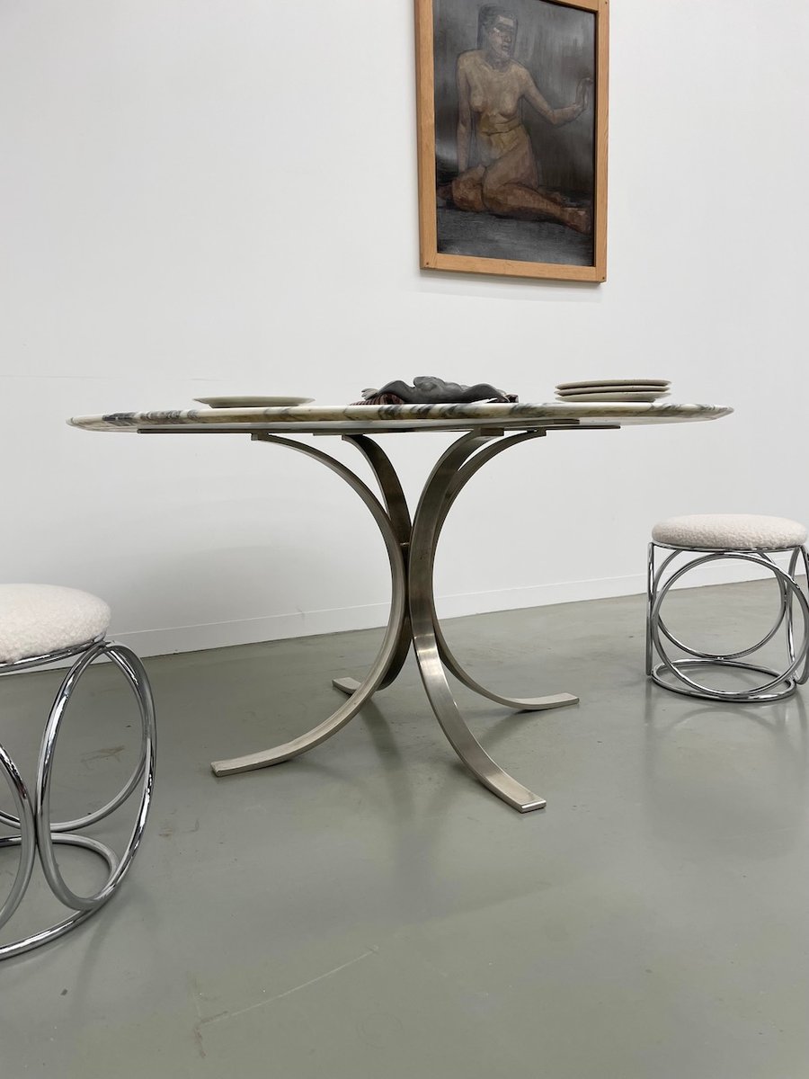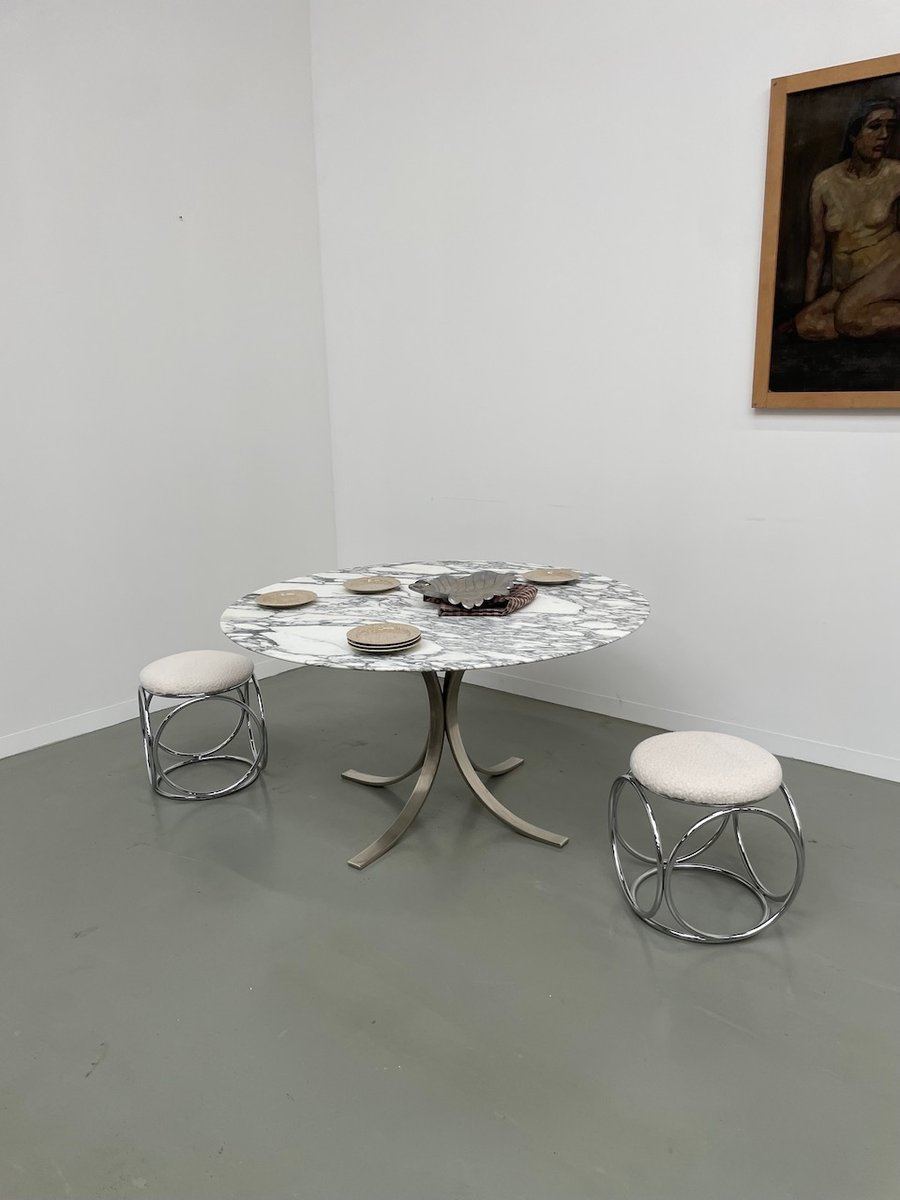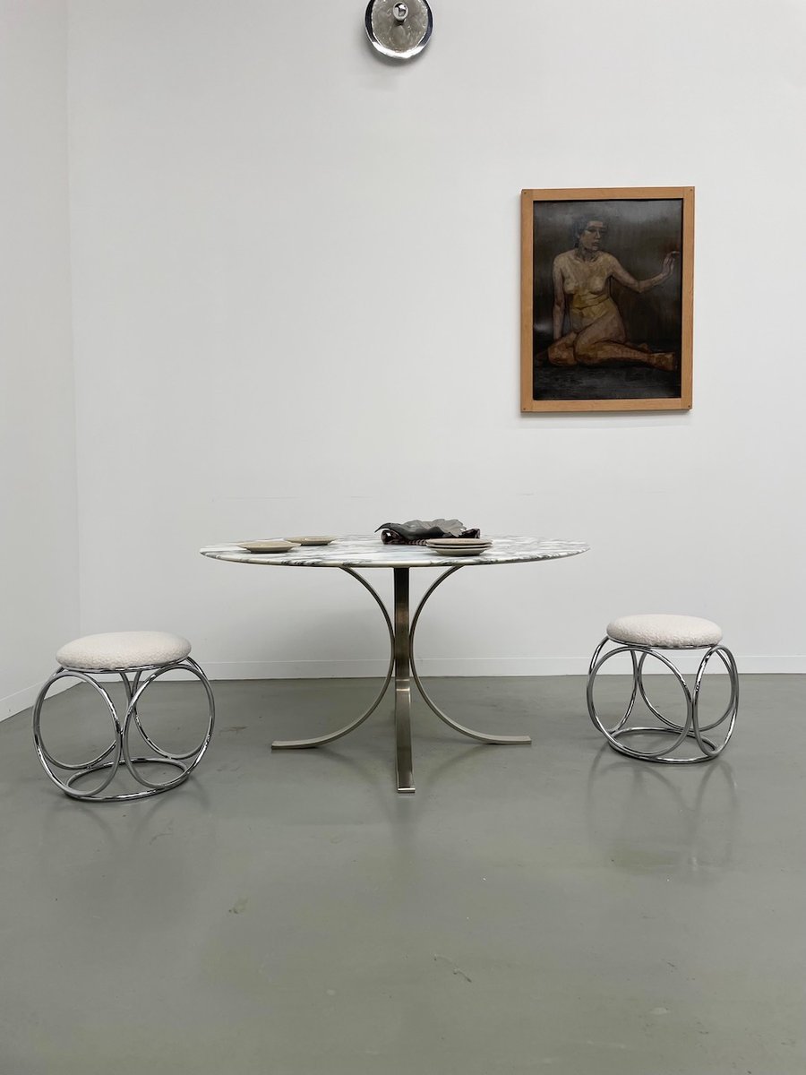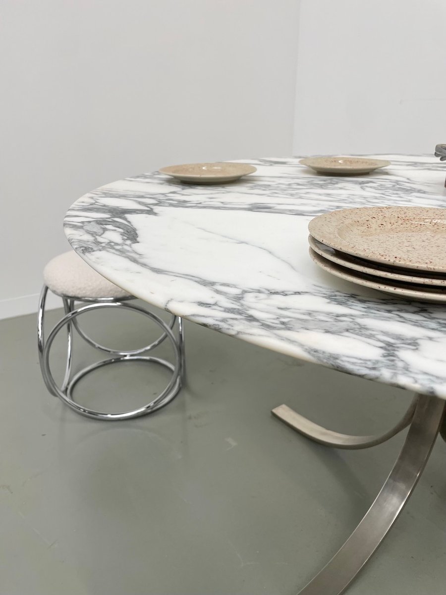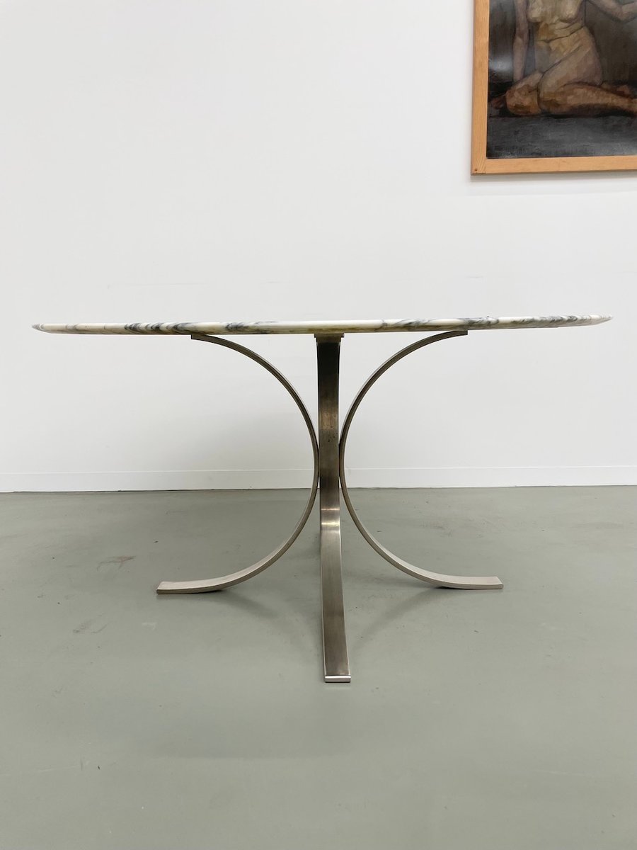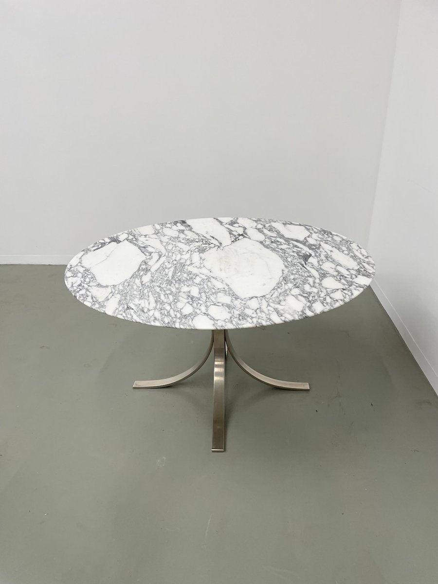Ancienne table avec son plateau rond en marbre blanc et son piètement chromé type fleuri, dans le goût de Osvaldo Borsani modèle T69.