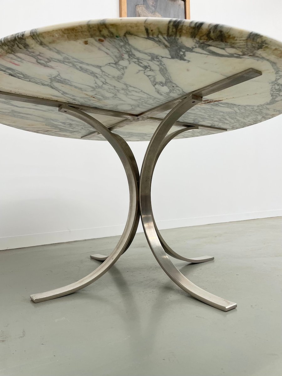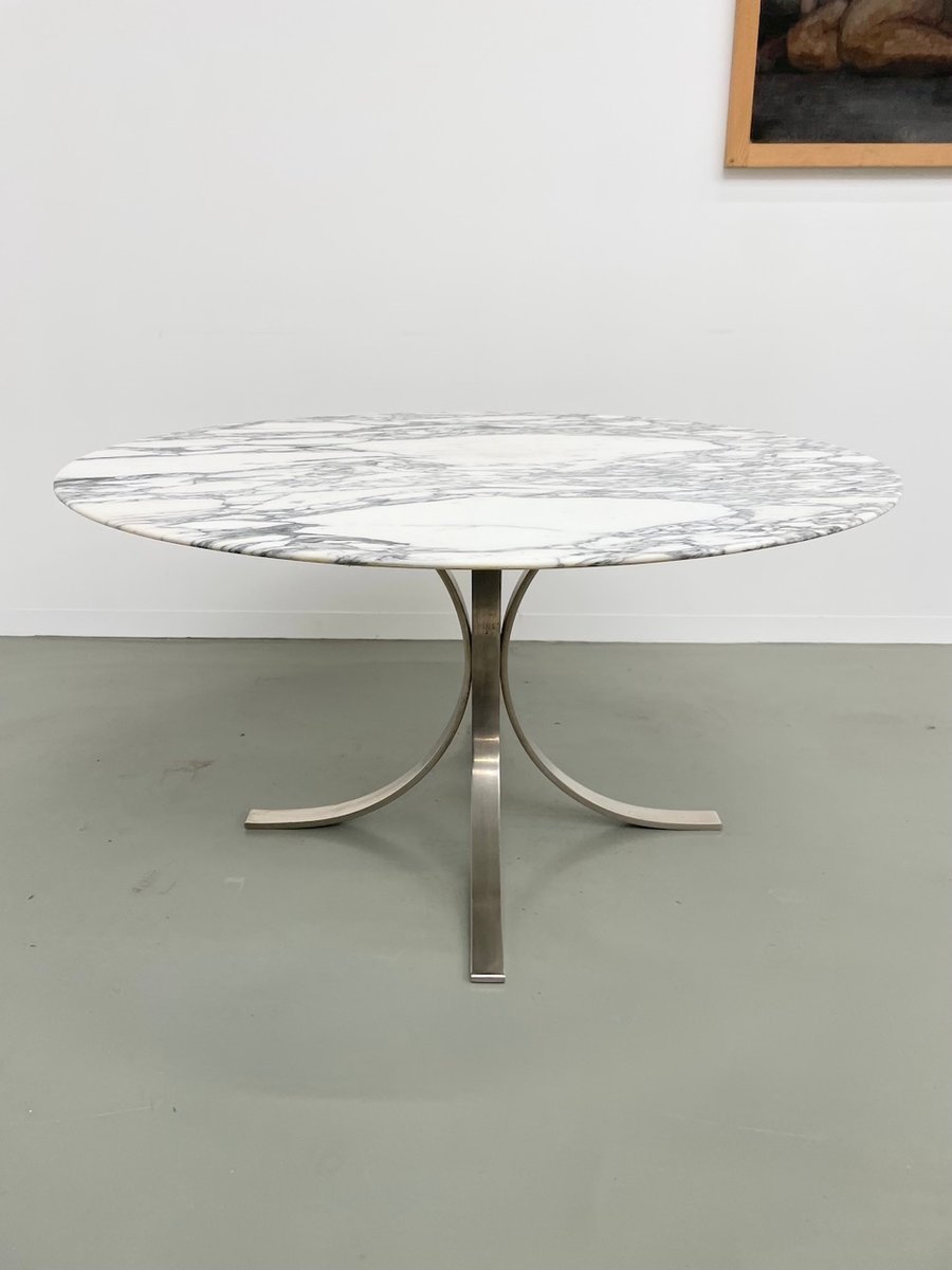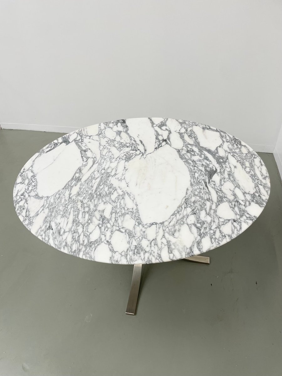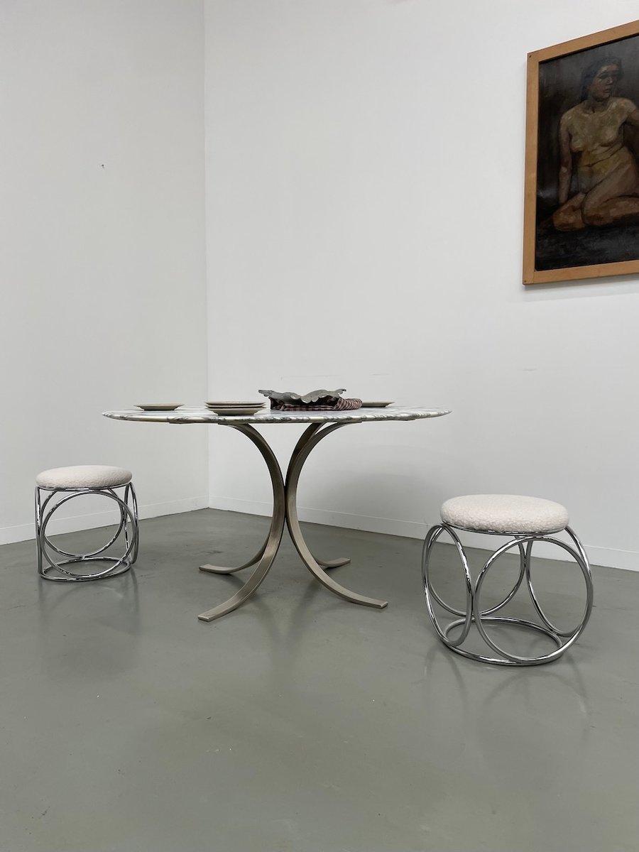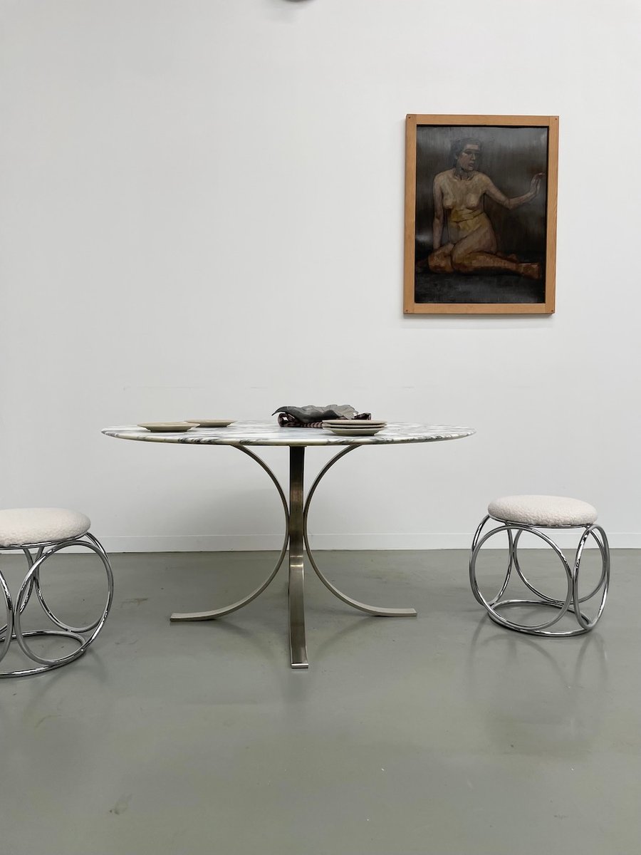 Ancienne table avec son plateau rond en marbre blanc et son piètement chromé type fleuri, dans le goût de Osvaldo Borsani modèle T69.