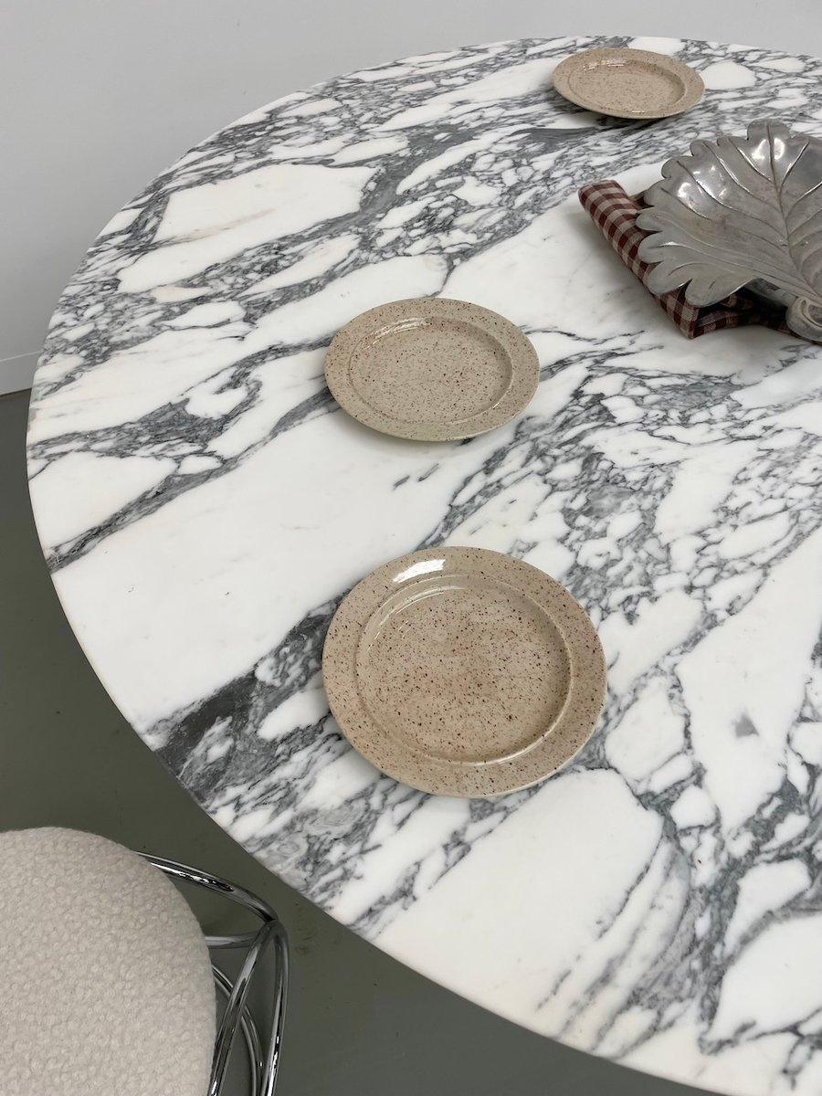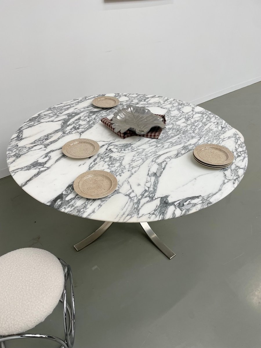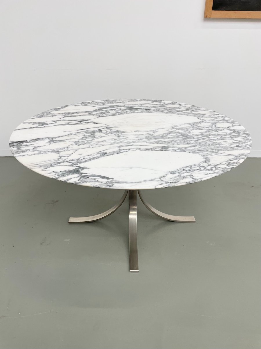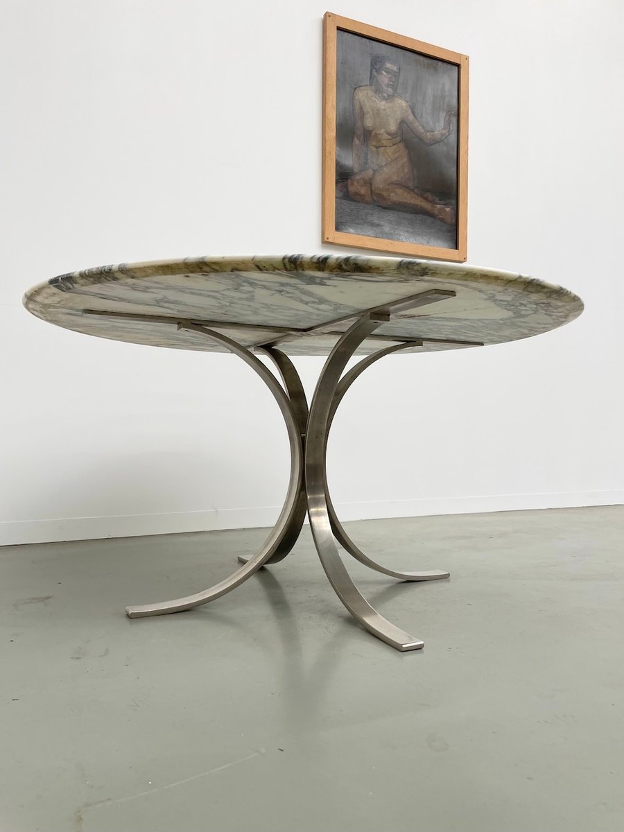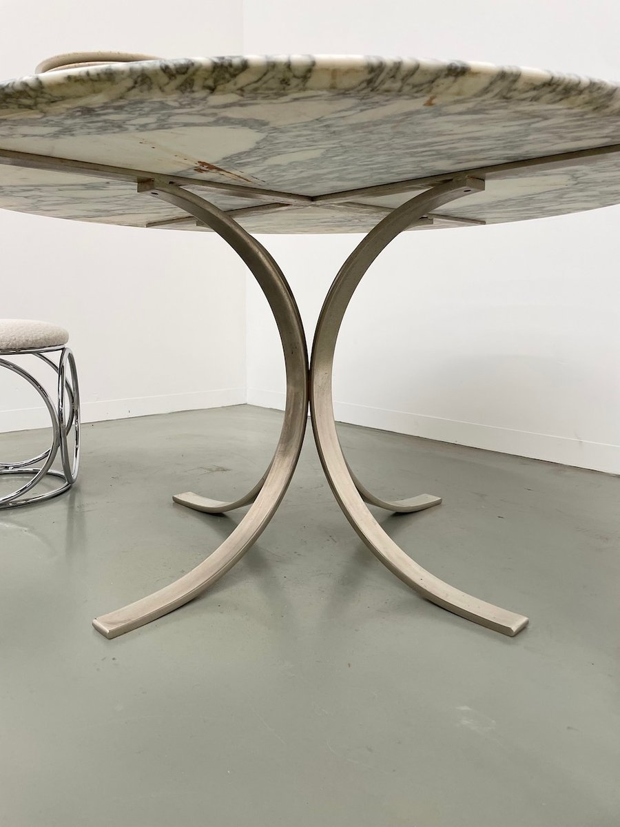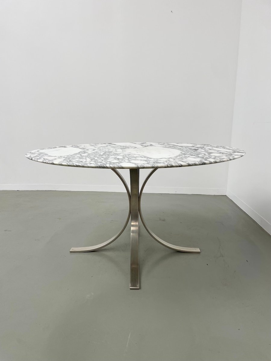 Ancienne table avec son plateau rond en marbre blanc et son piètement chromé type fleuri, dans le goût de Osvaldo Borsani modèle T69.