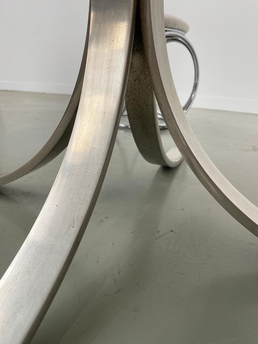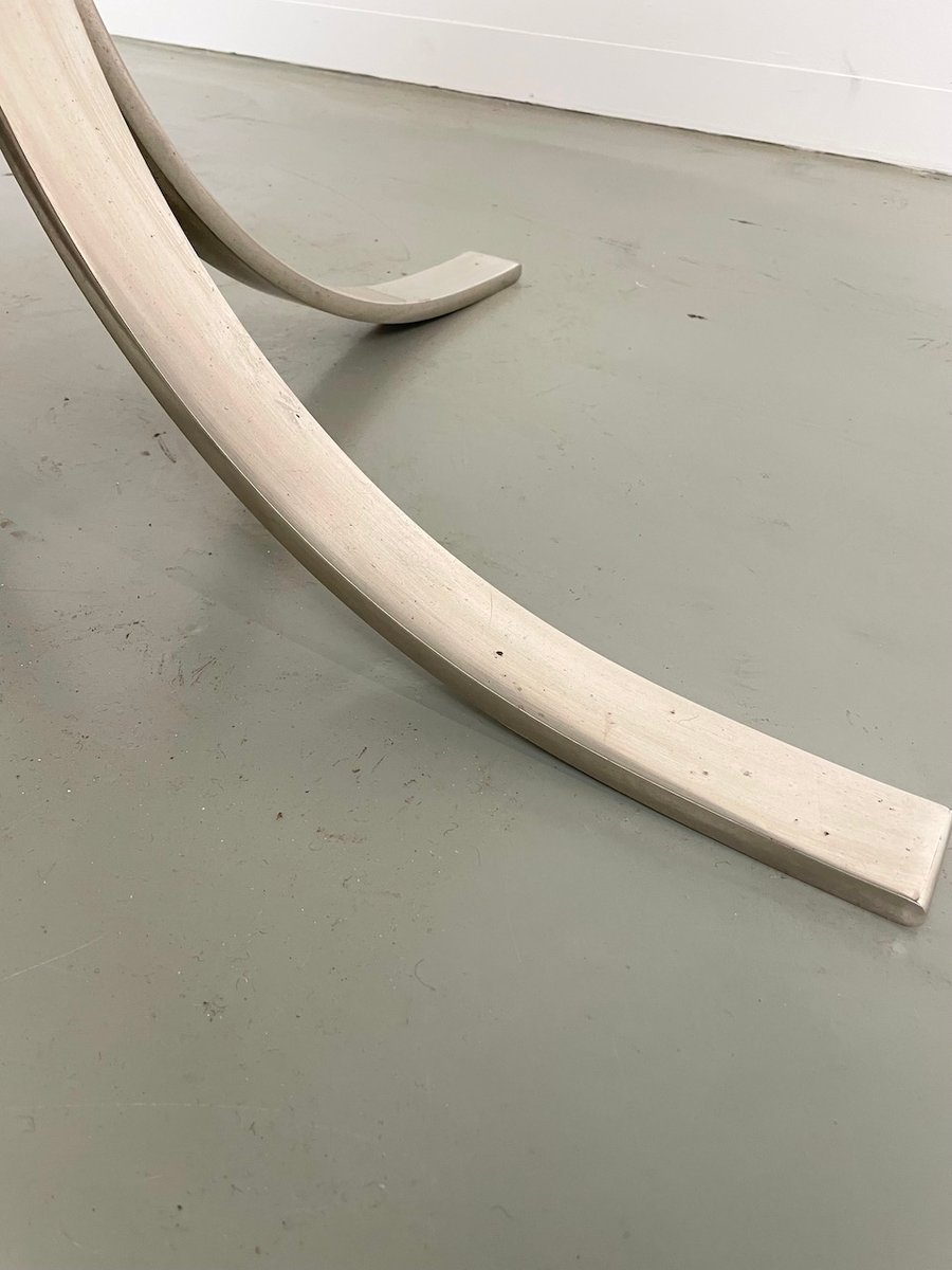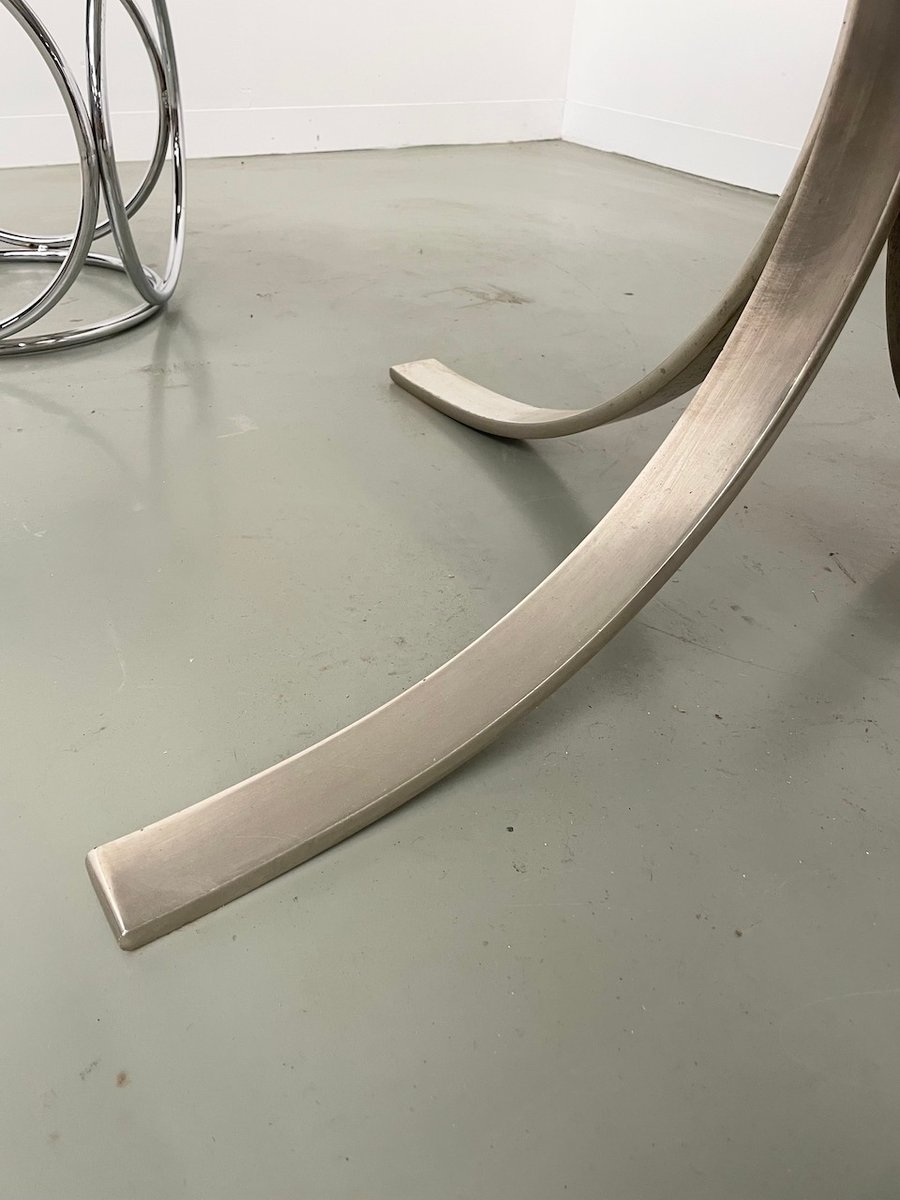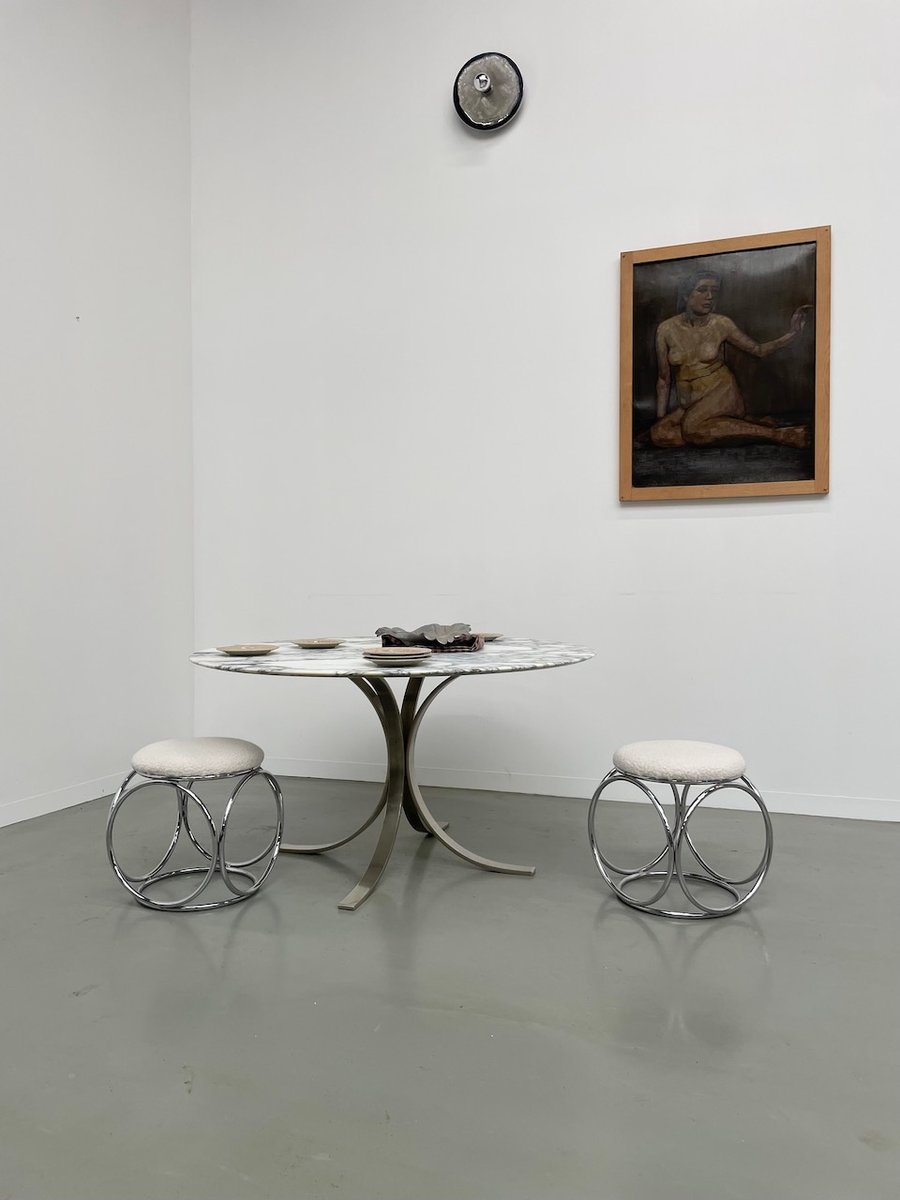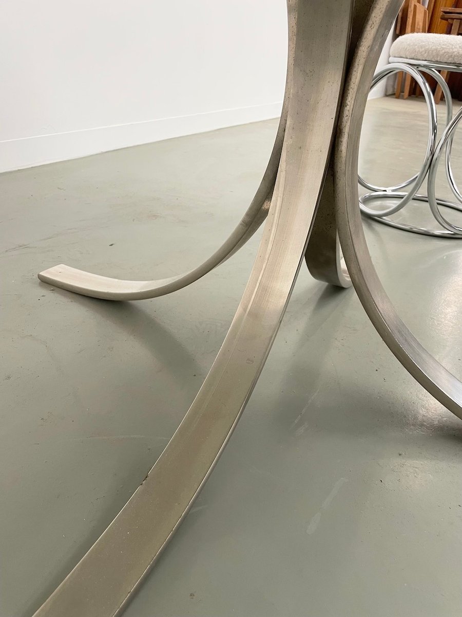 Ancienne table avec son plateau rond en marbre blanc et son piètement chromé type fleuri, dans le goût de Osvaldo Borsani modèle T69.