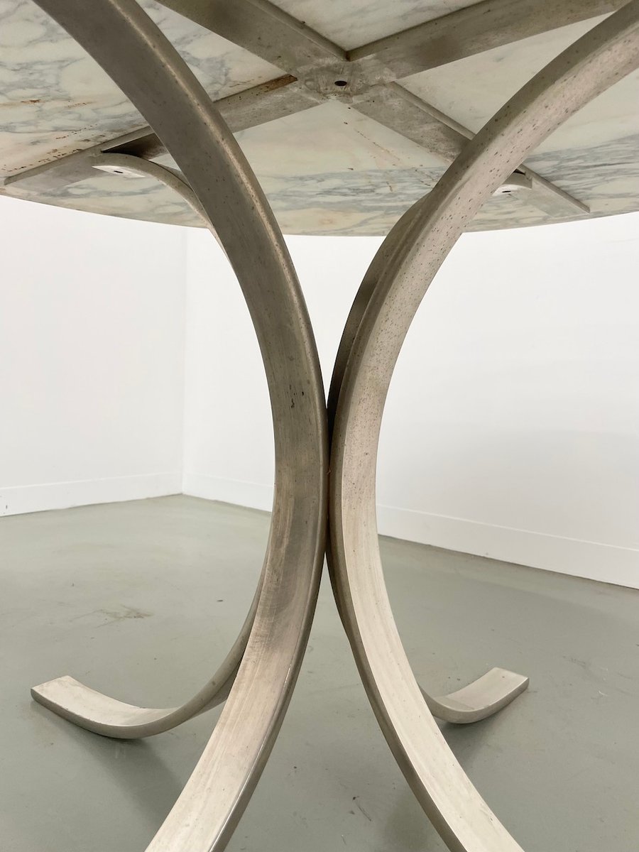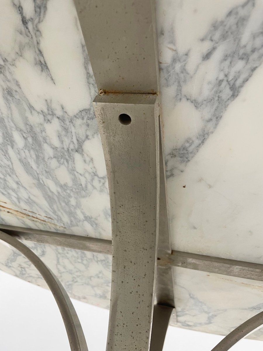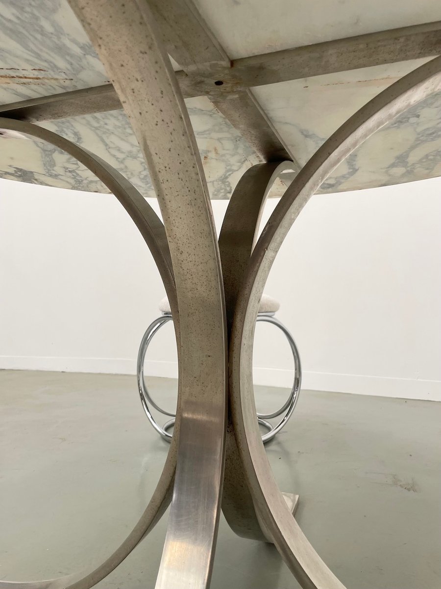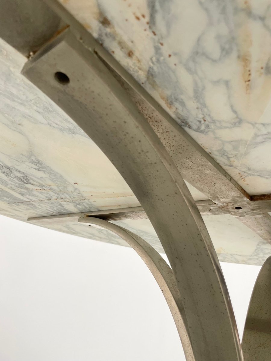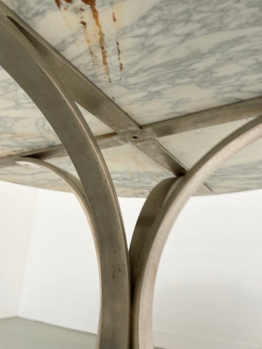 Old table with its round white marble top and its flowery chrome base, in the style of Osvaldo Borsani model T69.
