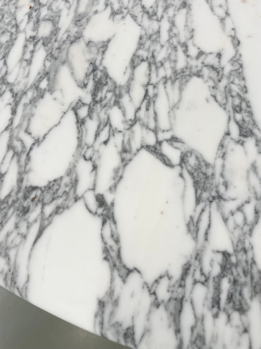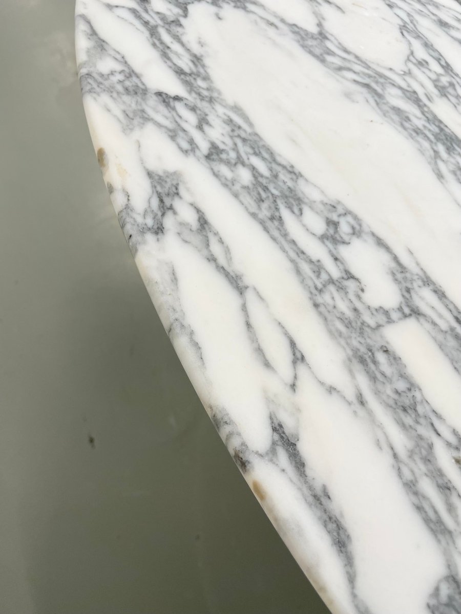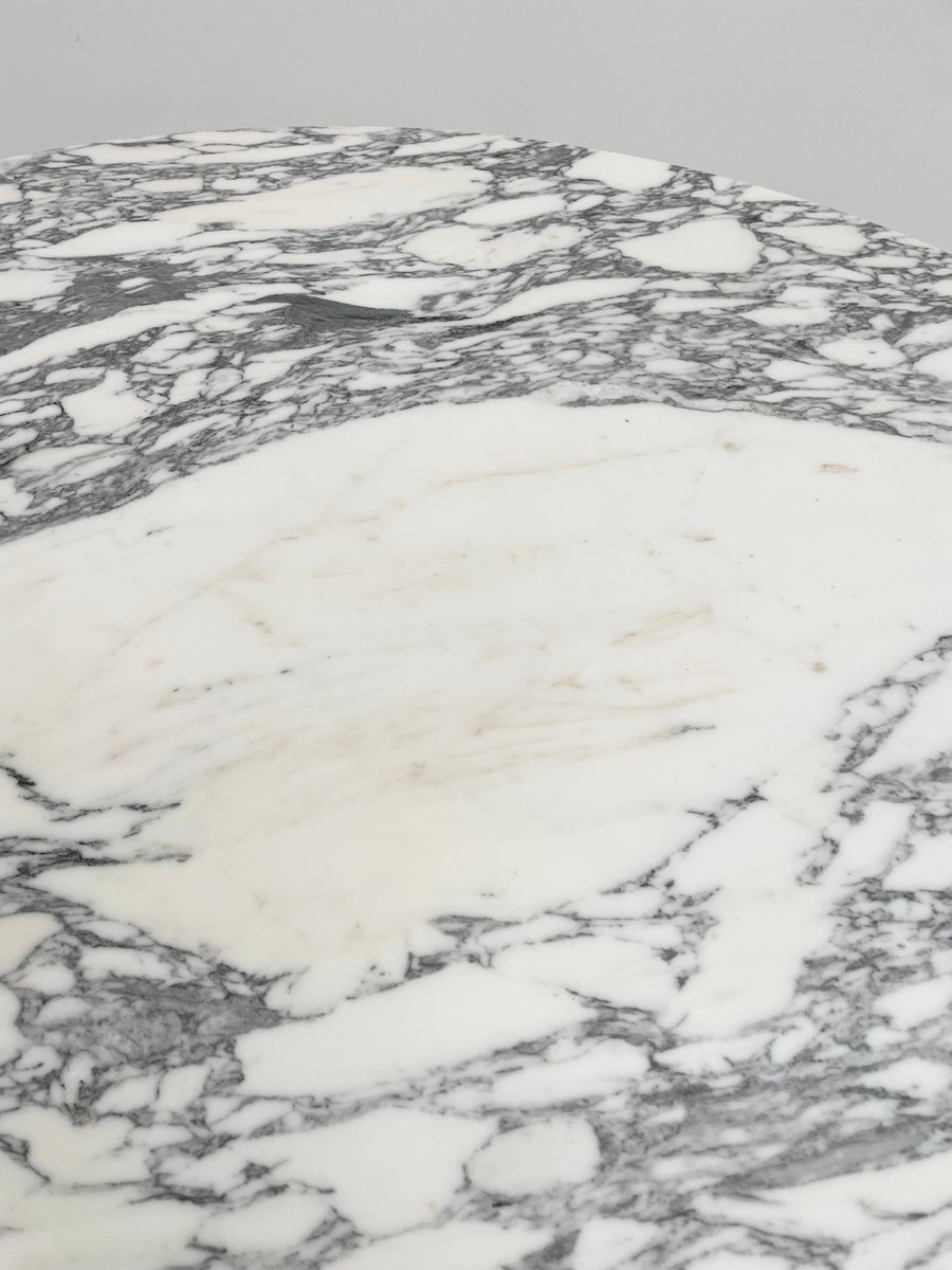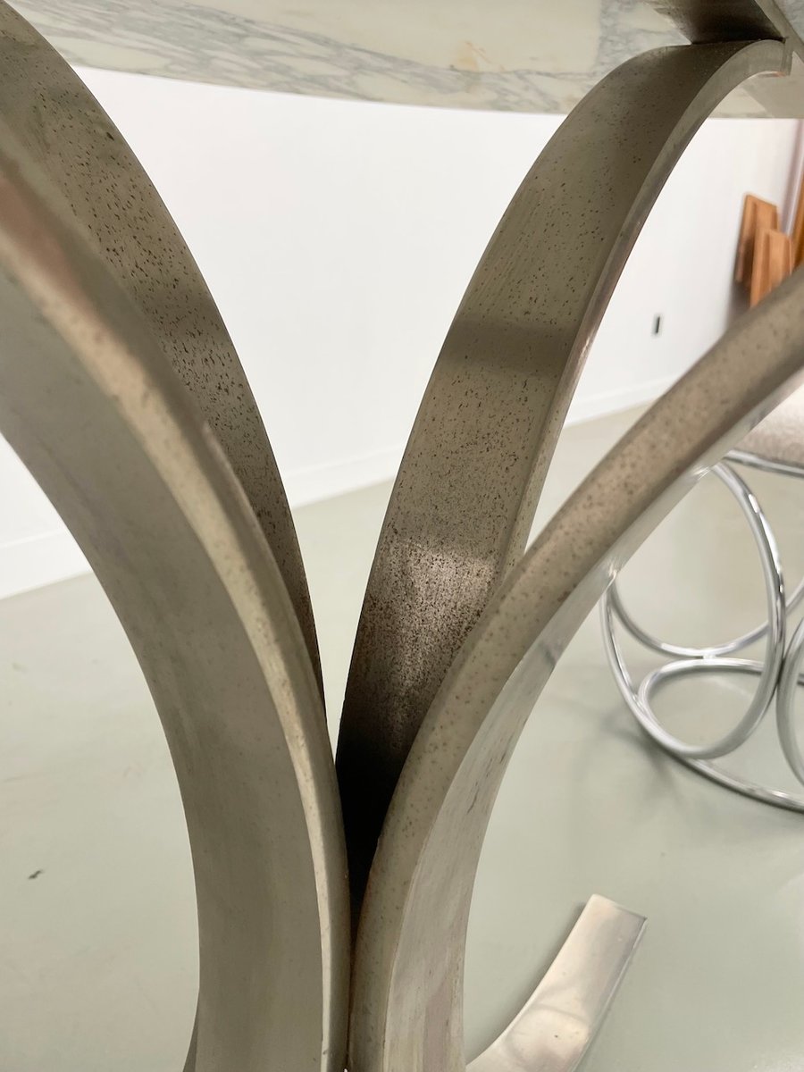 Old table with its round white marble top and its flowery chrome base, in the style of Osvaldo Borsani model T69.