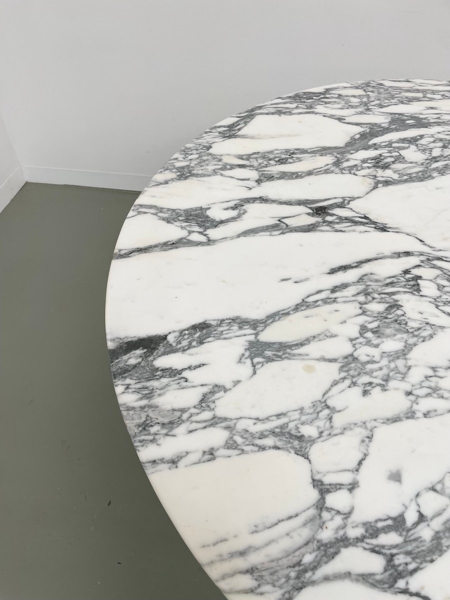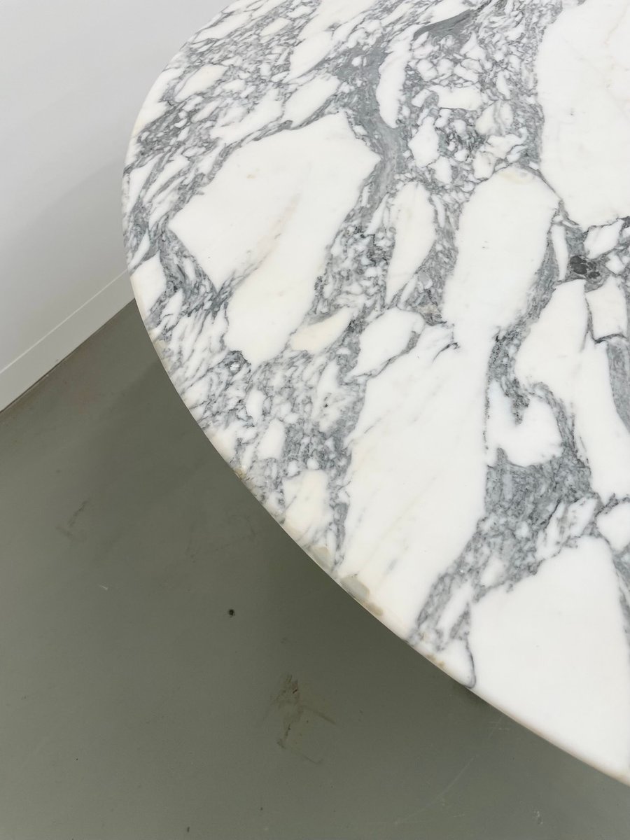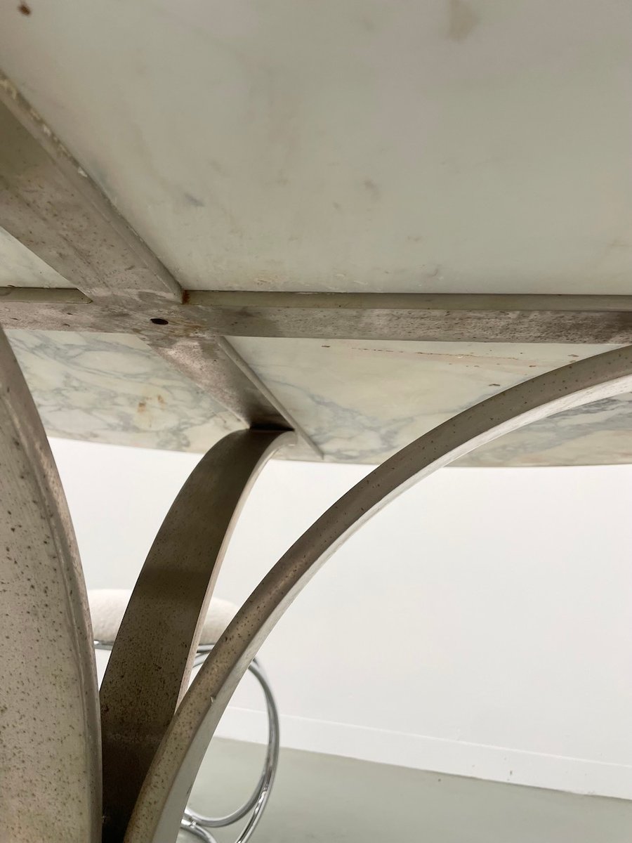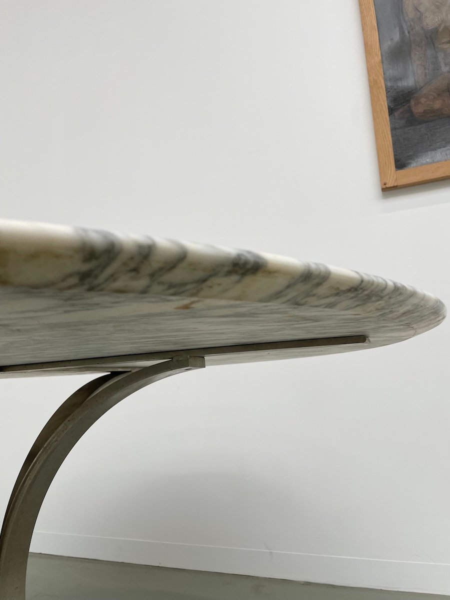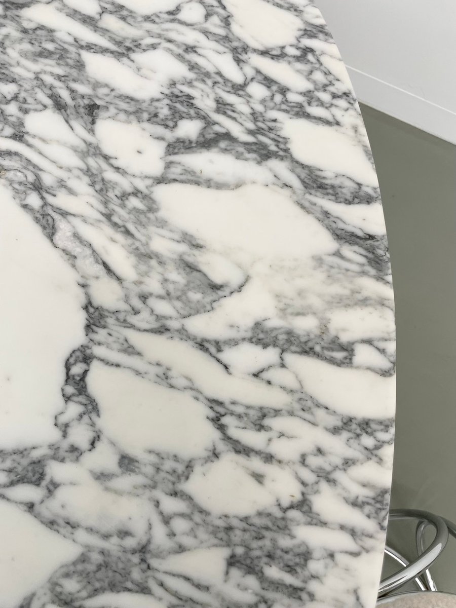 Old table with its round white marble top and its flowery chrome base, in the style of Osvaldo Borsani model T69.