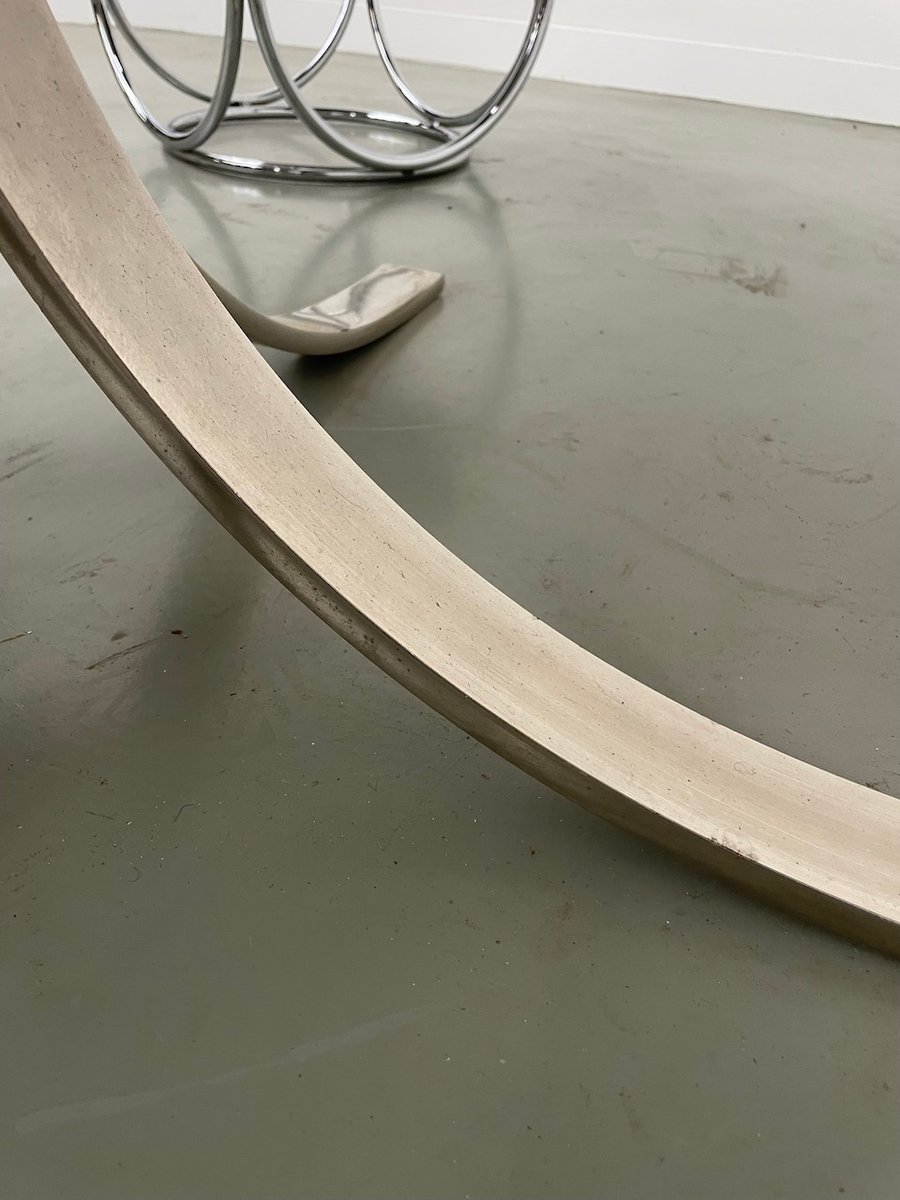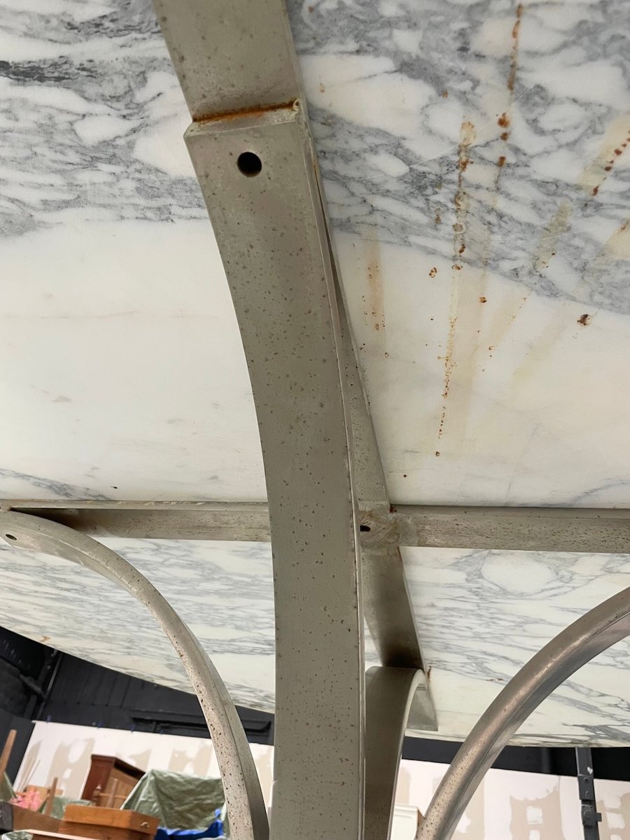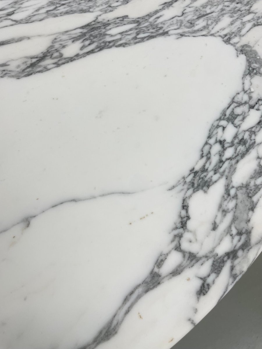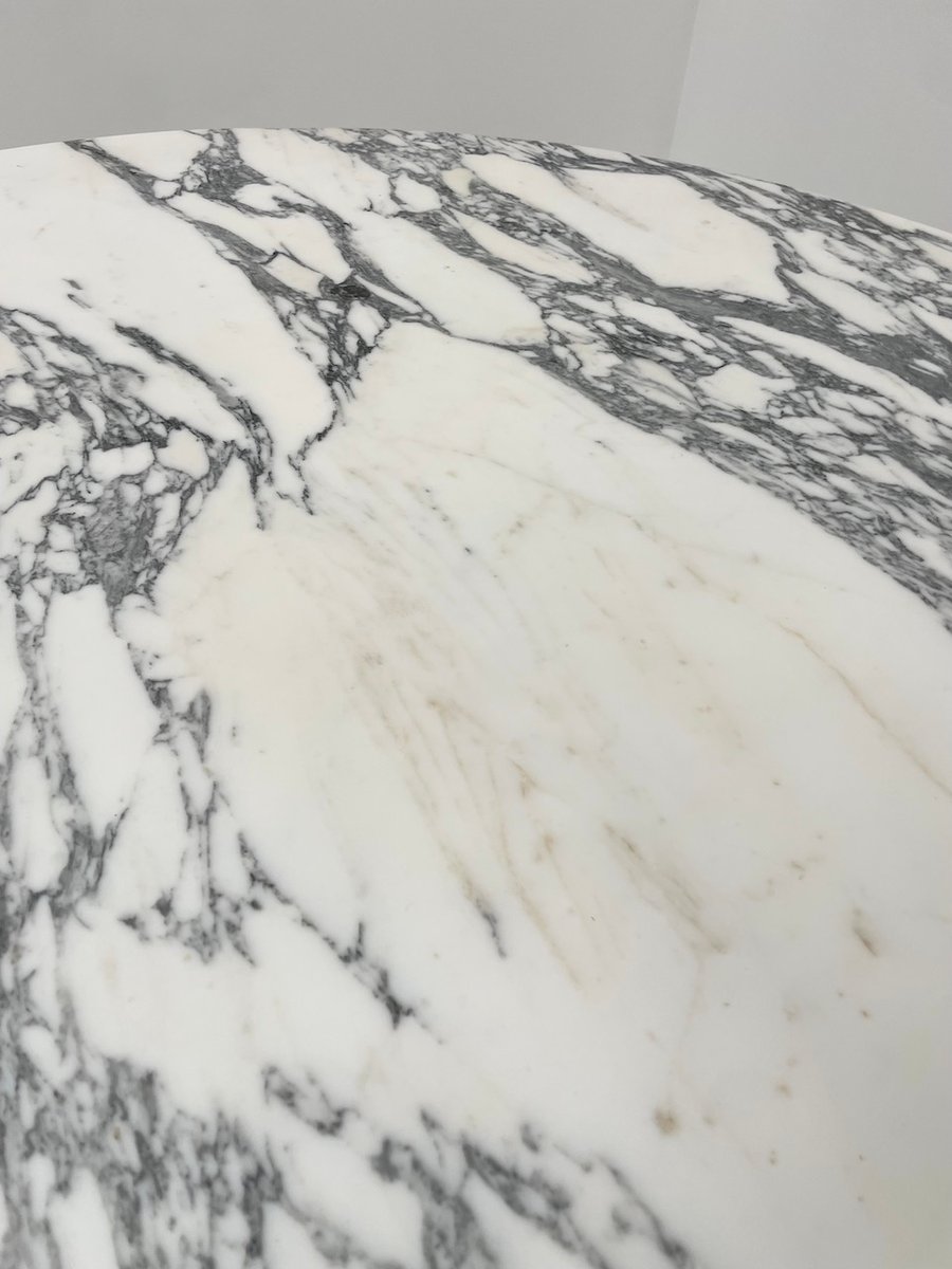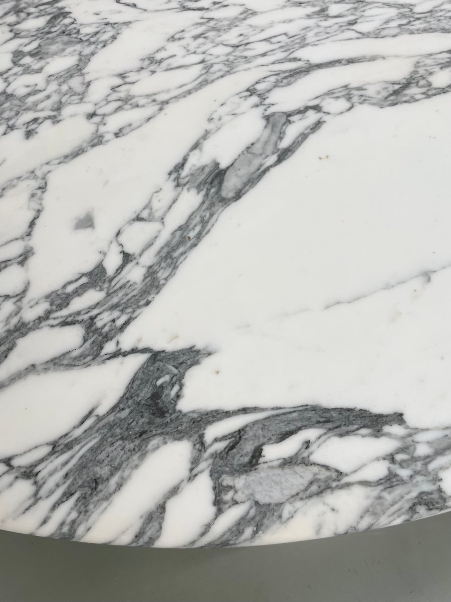Old table with its round white marble top and its flowery chrome base, in the style of Osvaldo Borsani model T69.