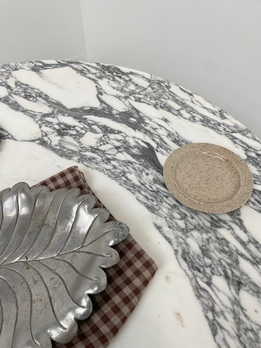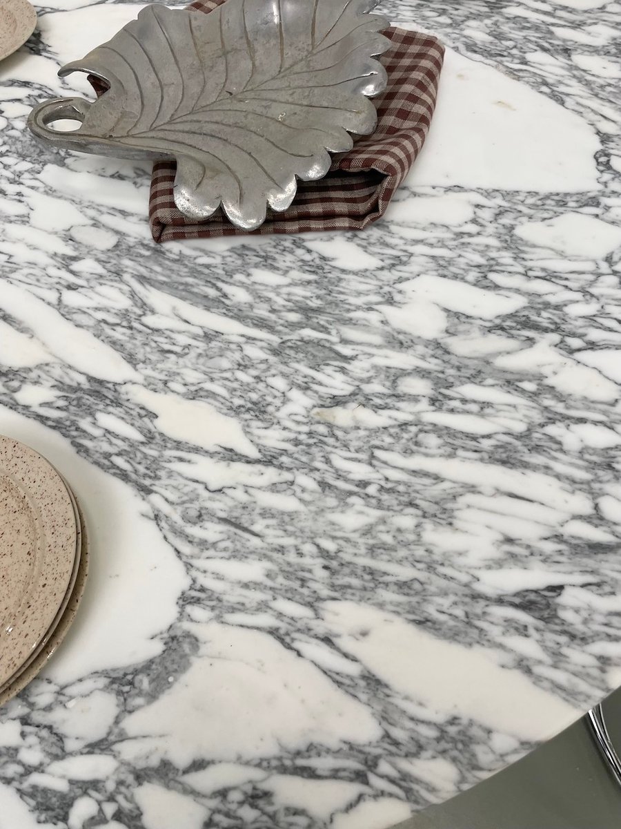 On adore le design si singulier de son piètement, et le marbre qui vient contraster avec ce matériau.