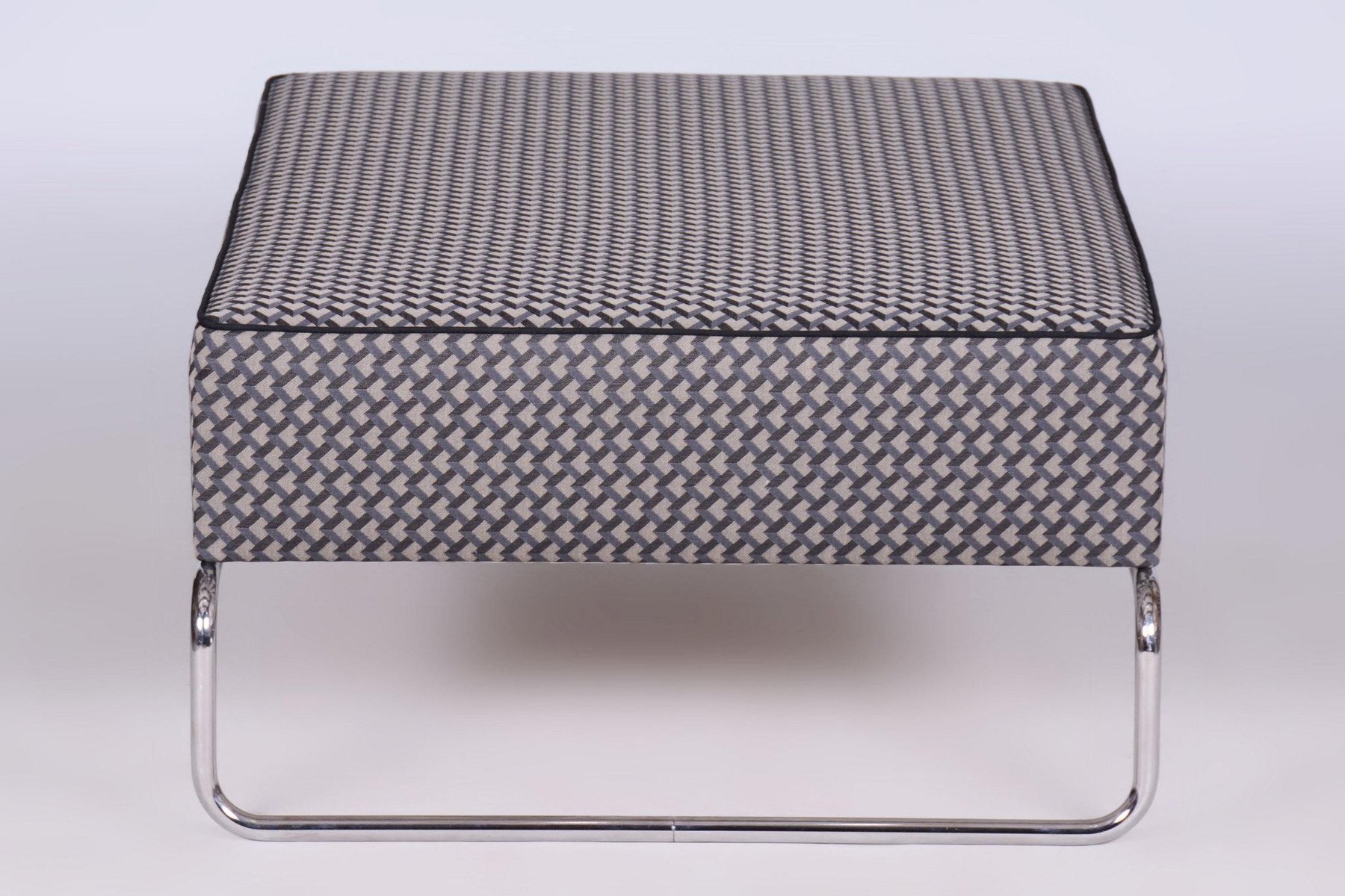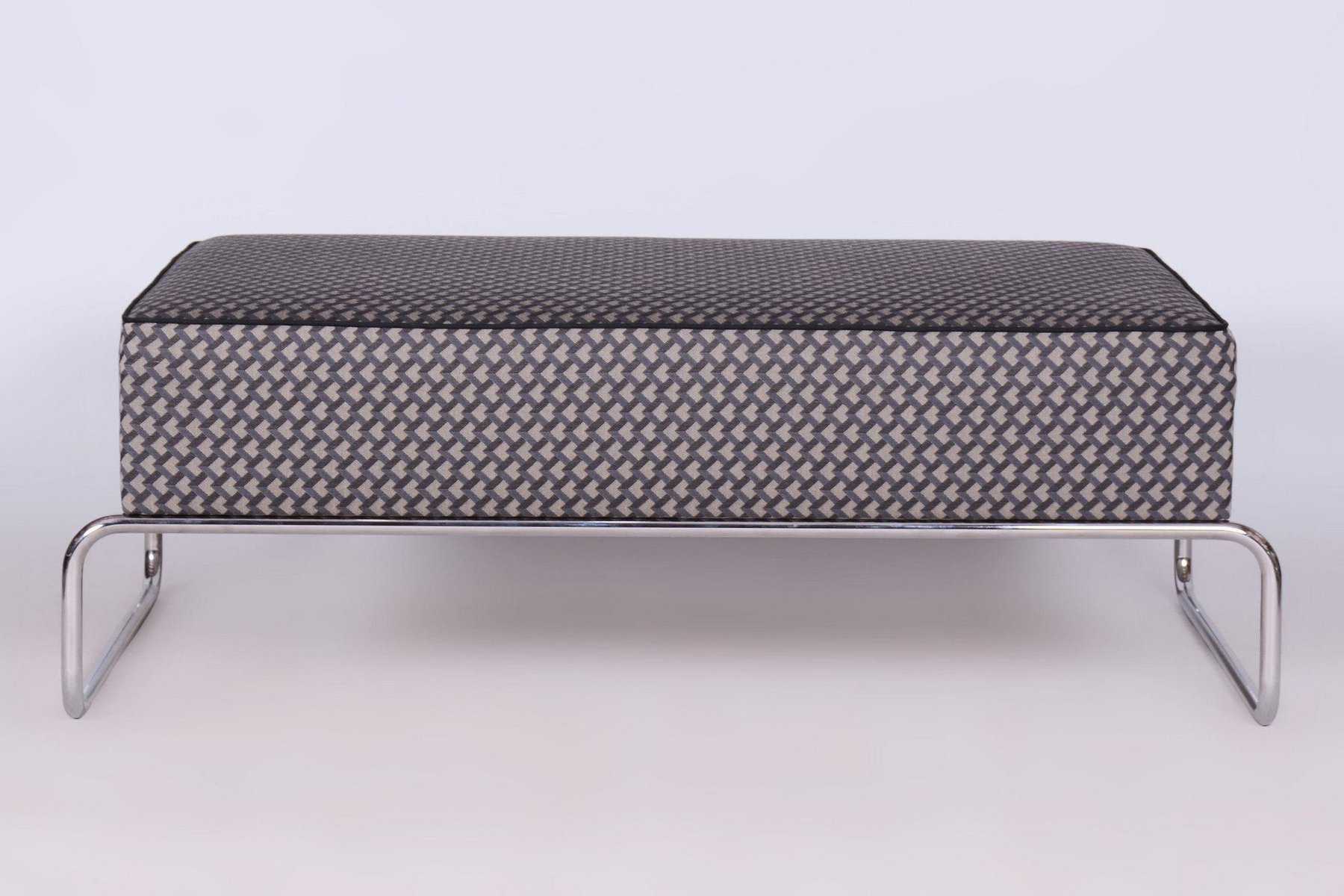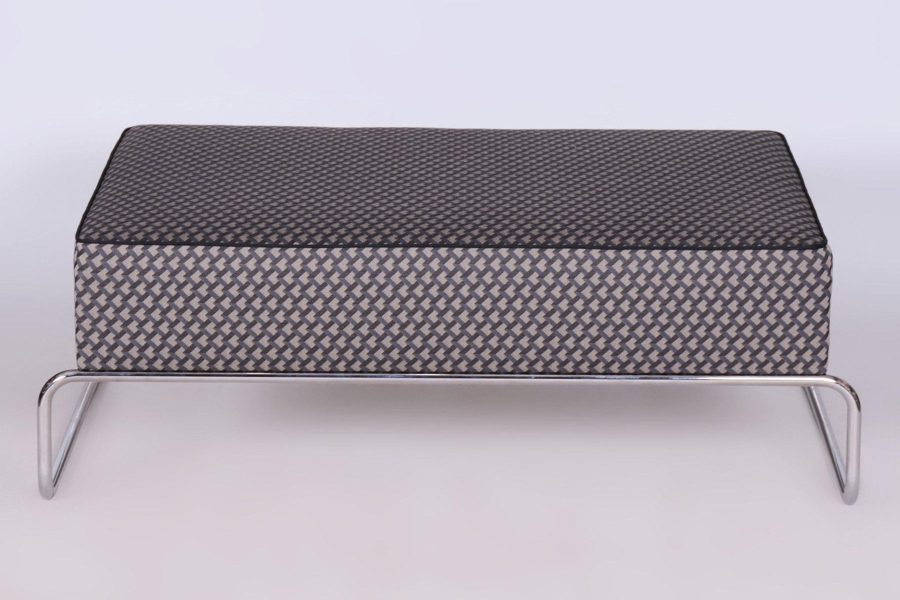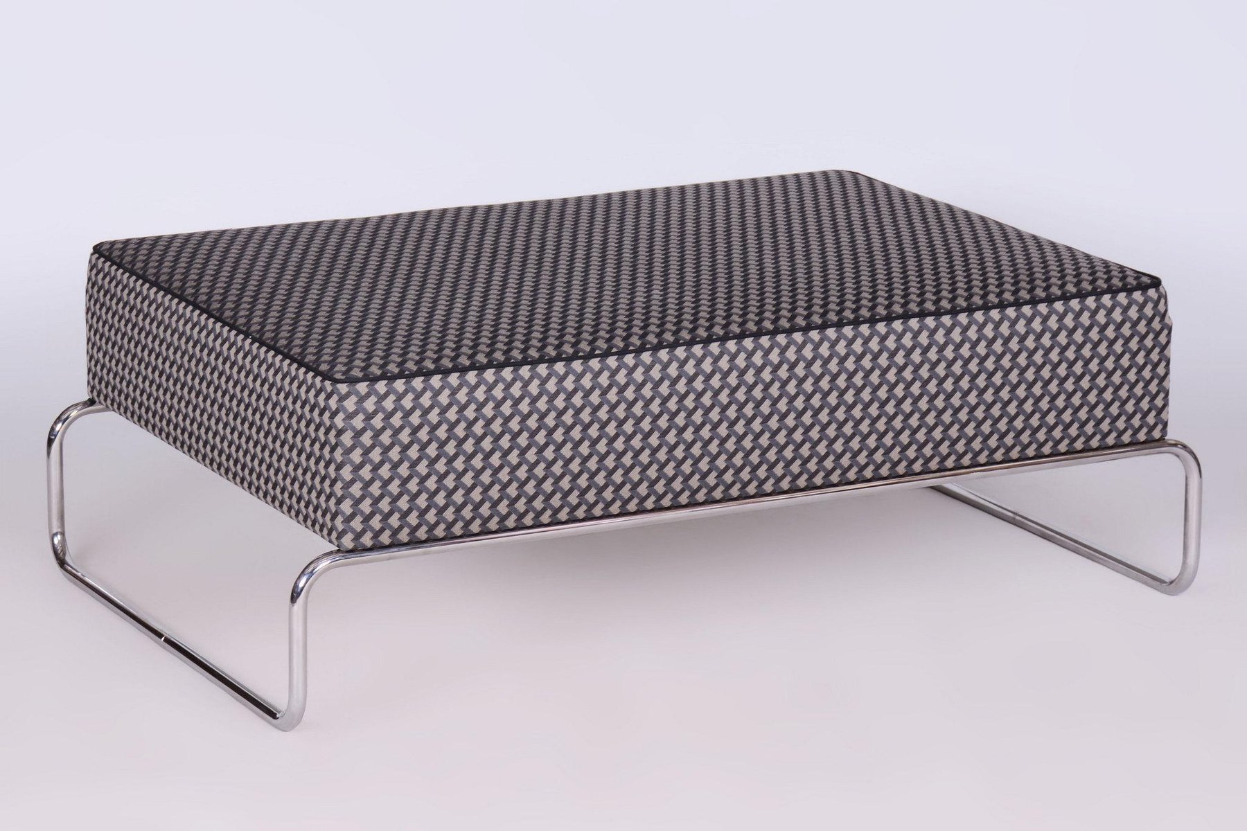 A large ottoman in the Bauhaus style, which can also be used as a coffee table. This piece has been fully restored with careful attention to preserving both its original appearance and functionality. The frame is made of tubular chromed steel, which has been professionally cleaned, giving it a sleek and polished look. The ottoman has been newly upholstered by experts, making it not only stylish but also highly comfortable and practical for everyday use. This item features classic Bauhaus design elements. Elements of this style are neutral colours, and occasional bright primary colours. Bauhaus designers avoided the fussy and pretentious, looking for clean, modern lines instead. Perfect for a timeless, yet modern look.