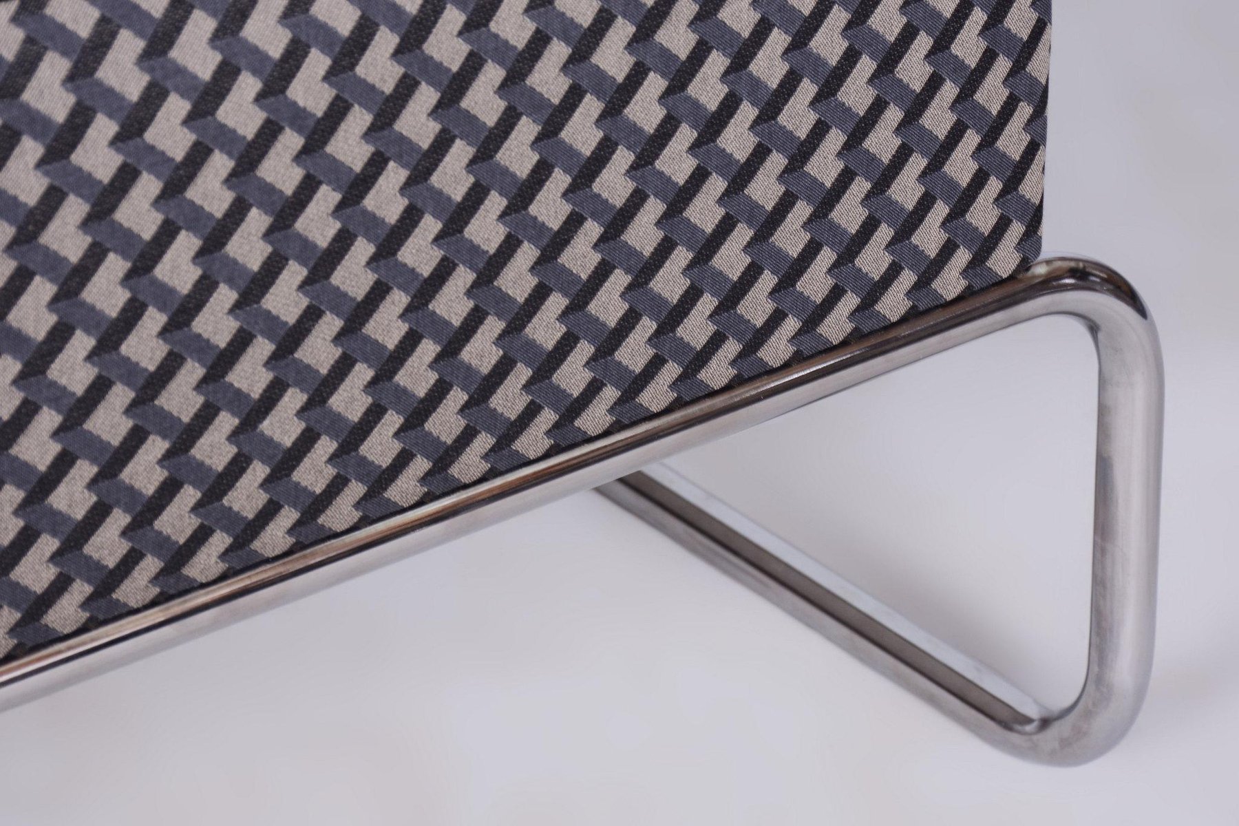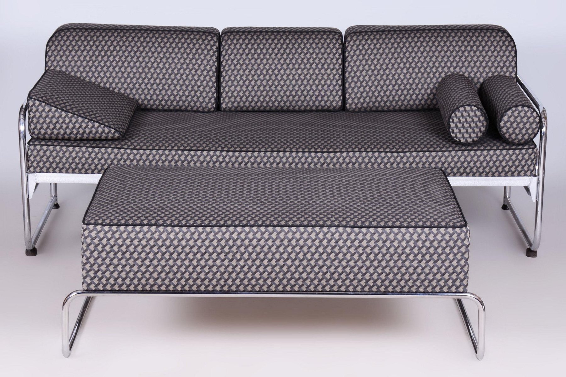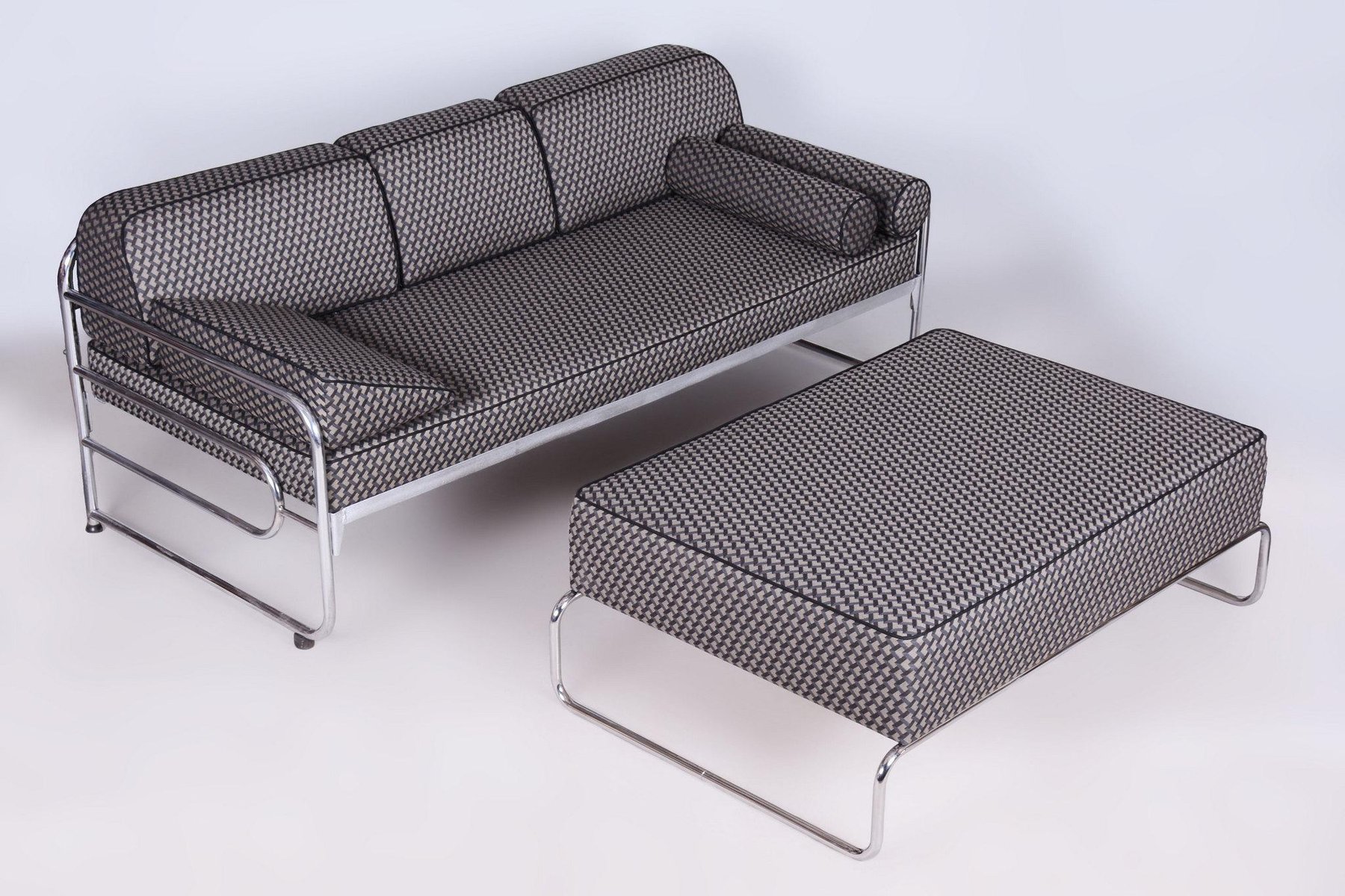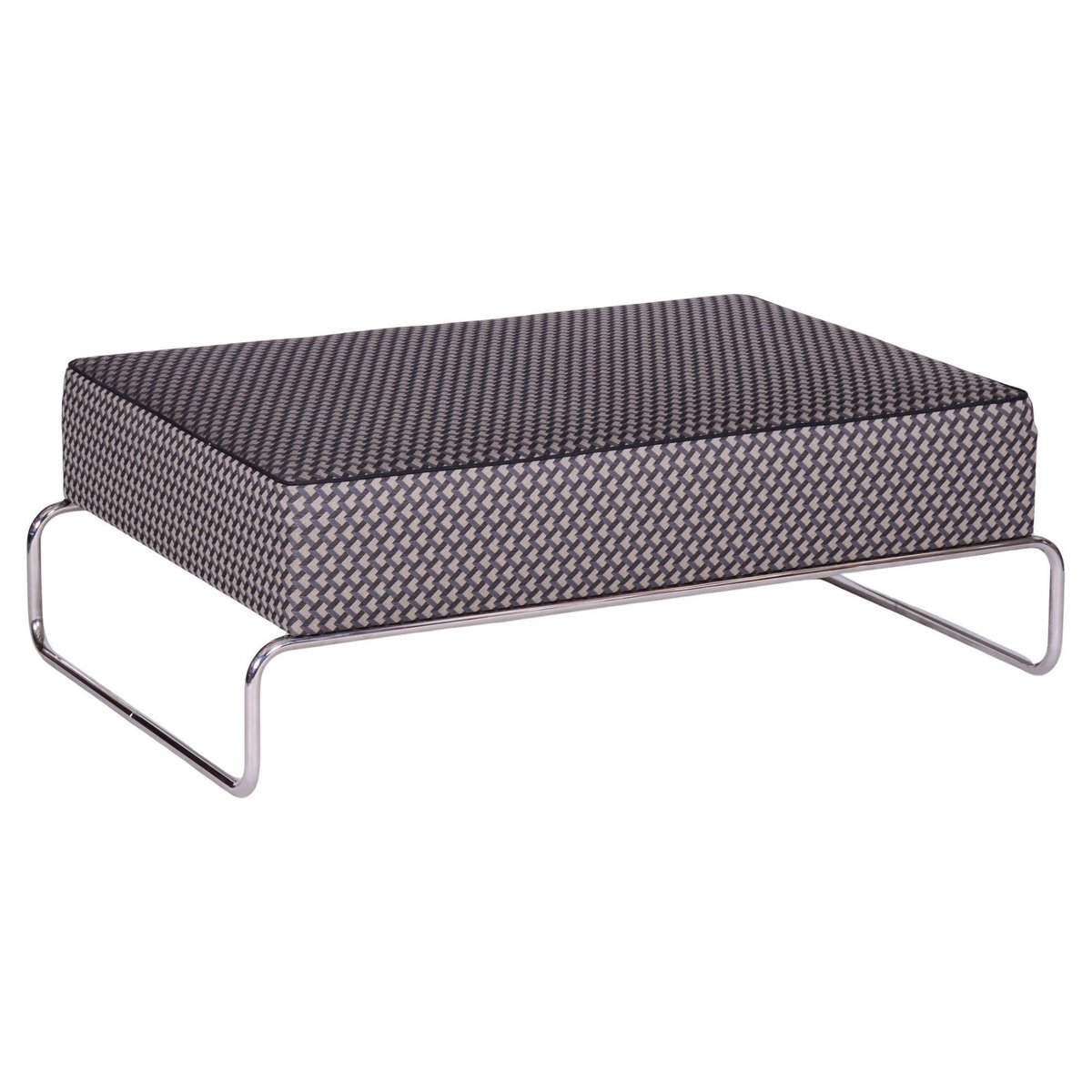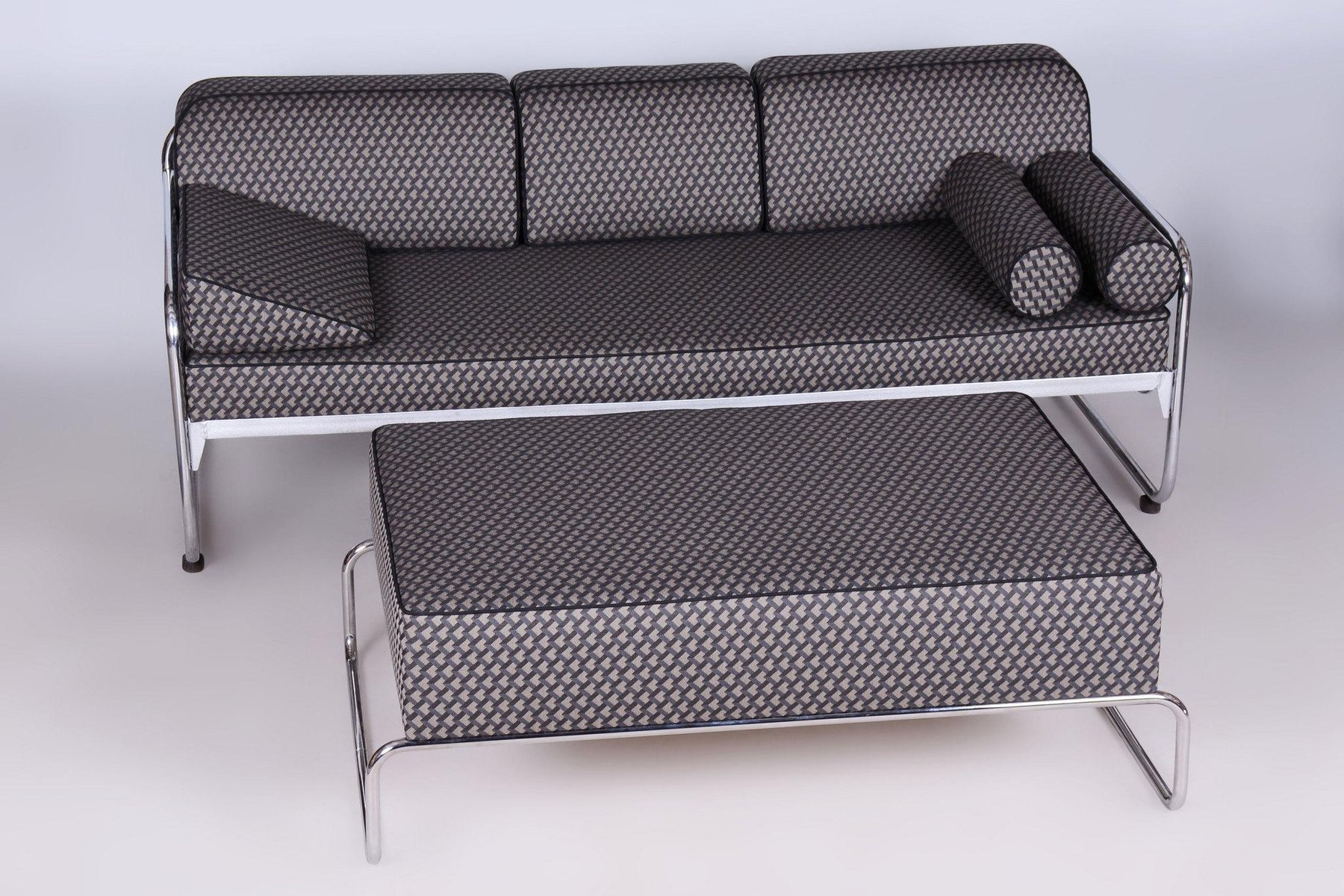 A large ottoman in the Bauhaus style, which can also be used as a coffee table. This piece has been fully restored with careful attention to preserving both its original appearance and functionality. The frame is made of tubular chromed steel, which has been professionally cleaned, giving it a sleek and polished look. The ottoman has been newly upholstered by experts, making it not only stylish but also highly comfortable and practical for everyday use. This item features classic Bauhaus design elements. Elements of this style are neutral colours, and occasional bright primary colours. Bauhaus designers avoided the fussy and pretentious, looking for clean, modern lines instead. Perfect for a timeless, yet modern look.