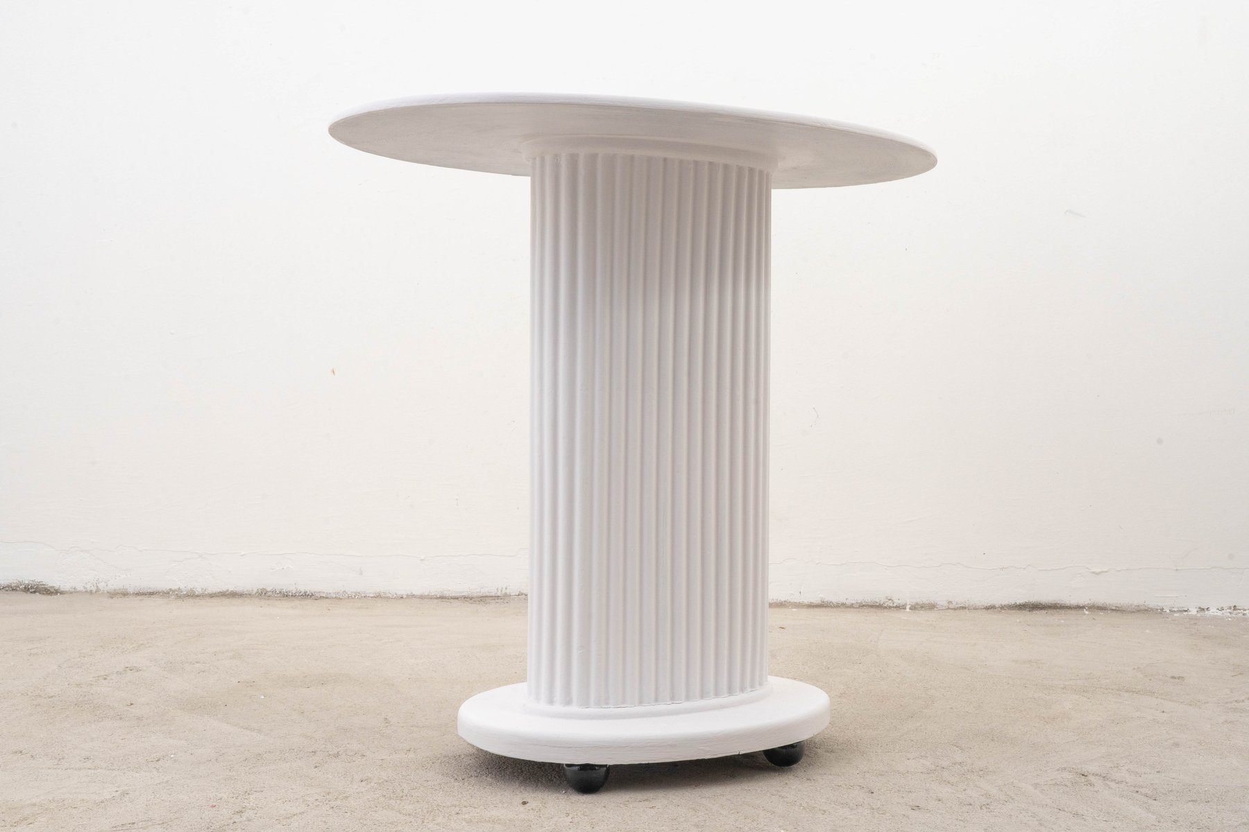 Constructed from bent beechwood and corrugated cardboard, both painted white, the table exemplifies early experiments with lightweight, industrial materials—hallmarks of modernist thinking. The tabletop and structure show traces of age and patina, while the four distinctive round black feet provide a striking visual contrast. Some surfaces have been partially painted over in keeping with historical restoration techniques.