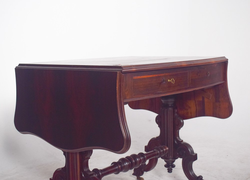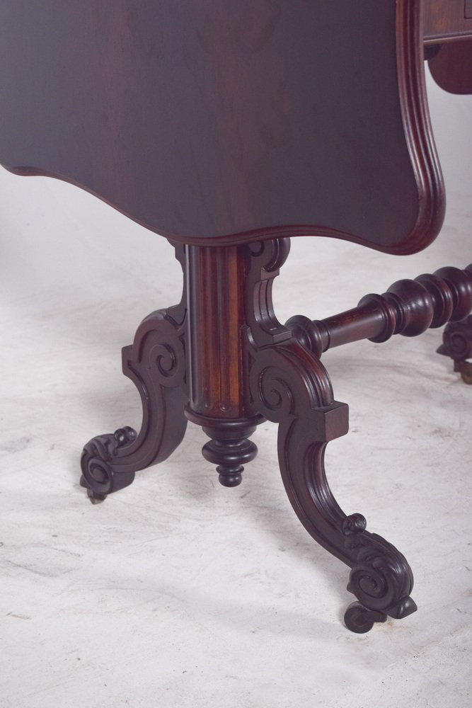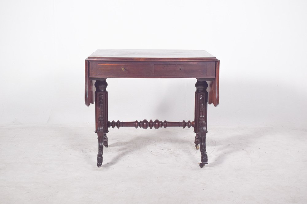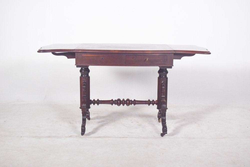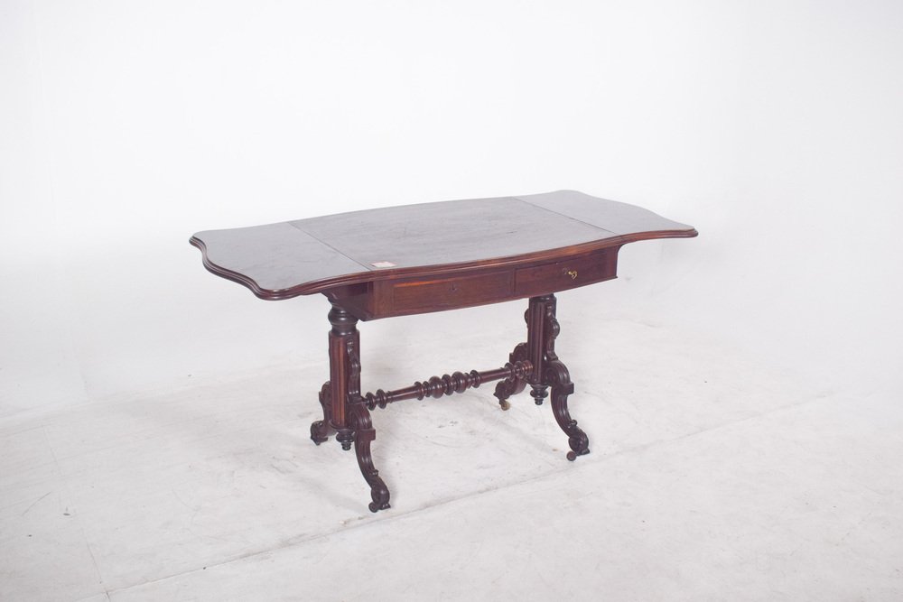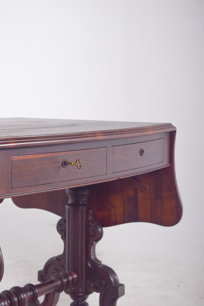 Table victorienne en bois de rose, avec deux tiroirs. Le plateau comporte deux volets latéraux mobiles découpés qui, lorsqu'ils sont soulevés, prolongent le plateau, révélant la fonctionnalité conçue pour optimiser l'espace sans sacrifier l'élégance.