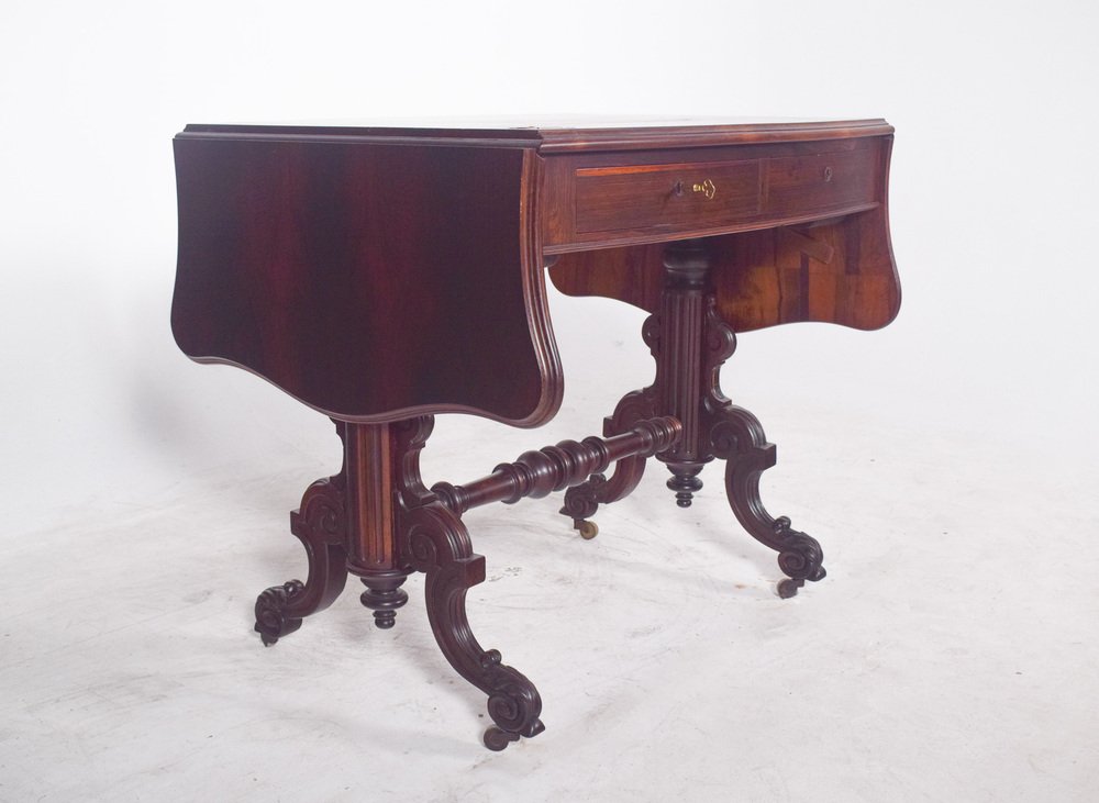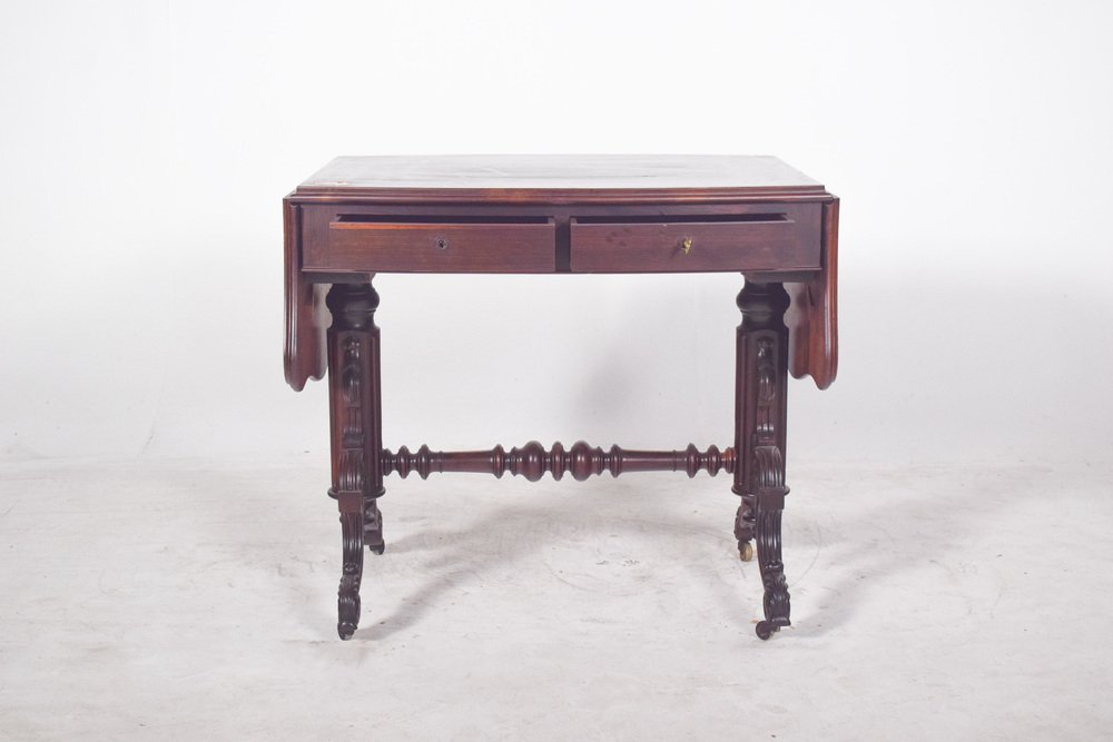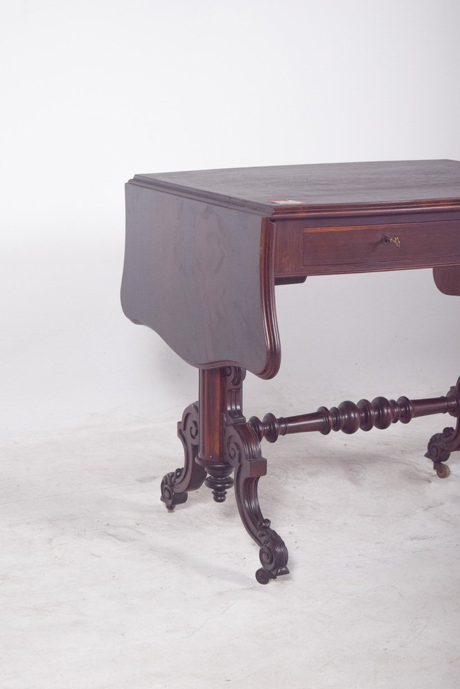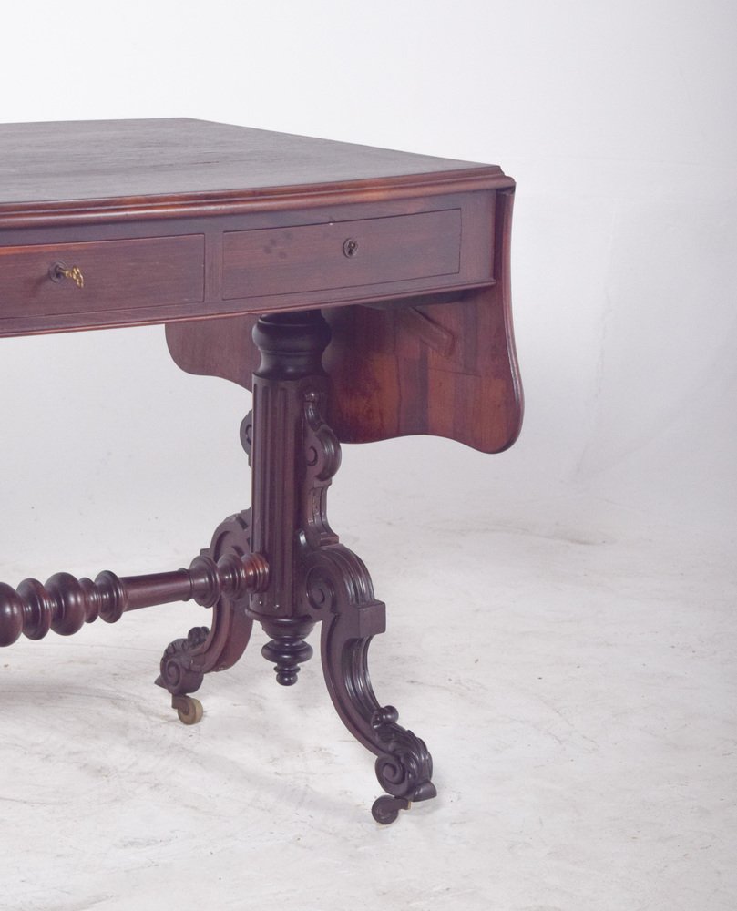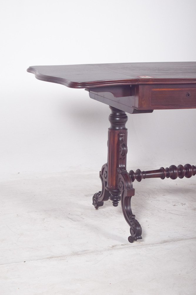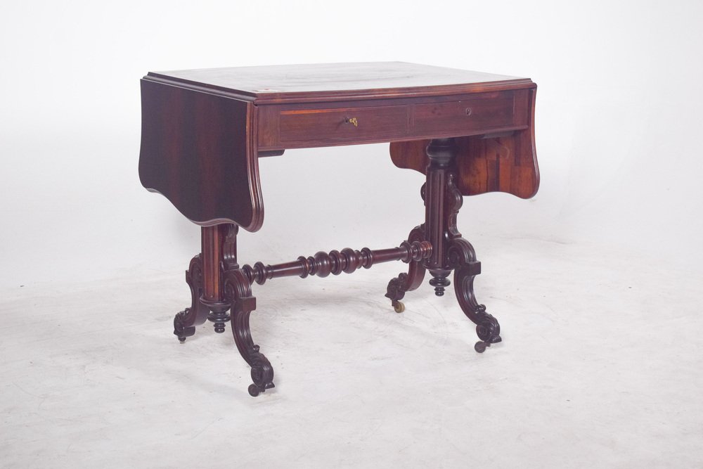 Table victorienne en bois de rose, avec deux tiroirs. Le plateau comporte deux volets latéraux mobiles découpés qui, lorsqu'ils sont soulevés, prolongent le plateau, révélant la fonctionnalité conçue pour optimiser l'espace sans sacrifier l'élégance.