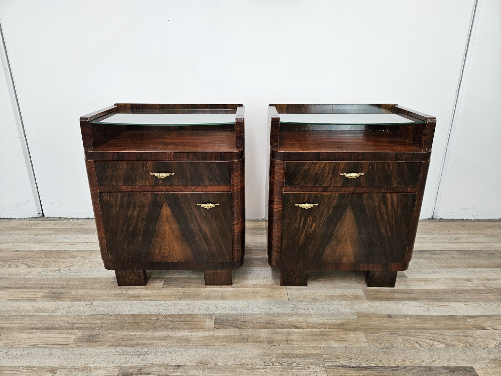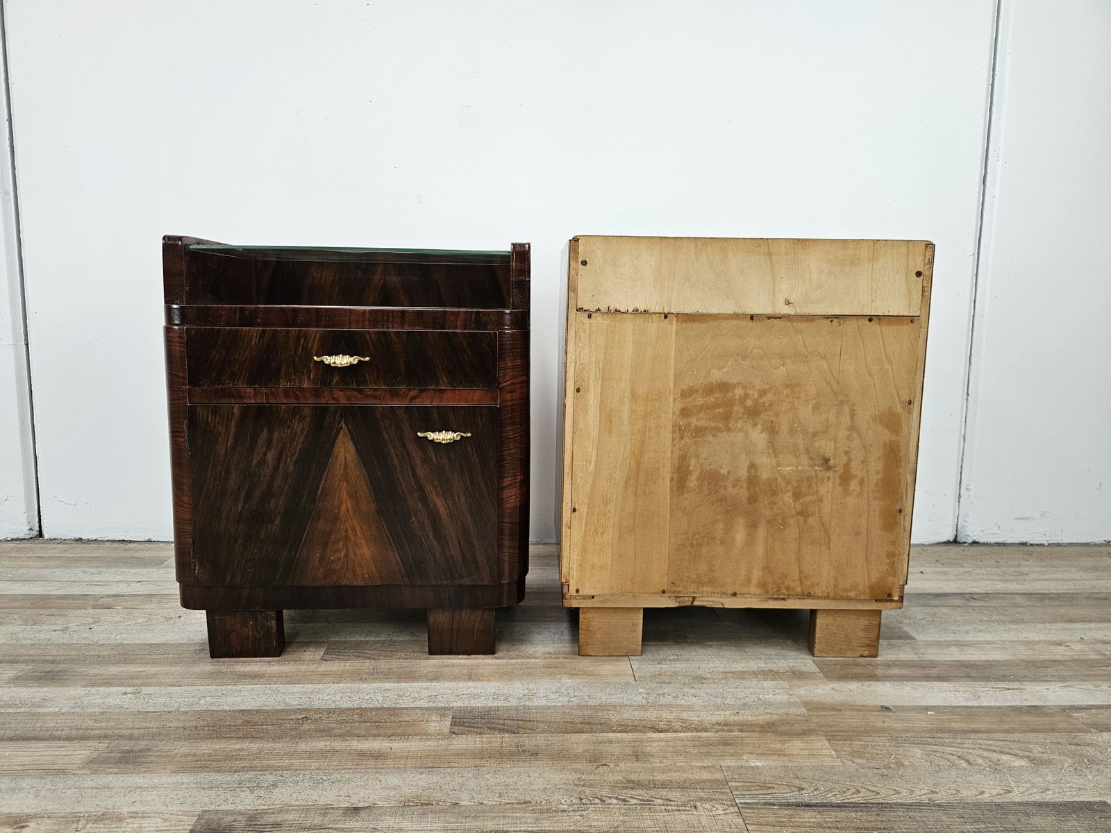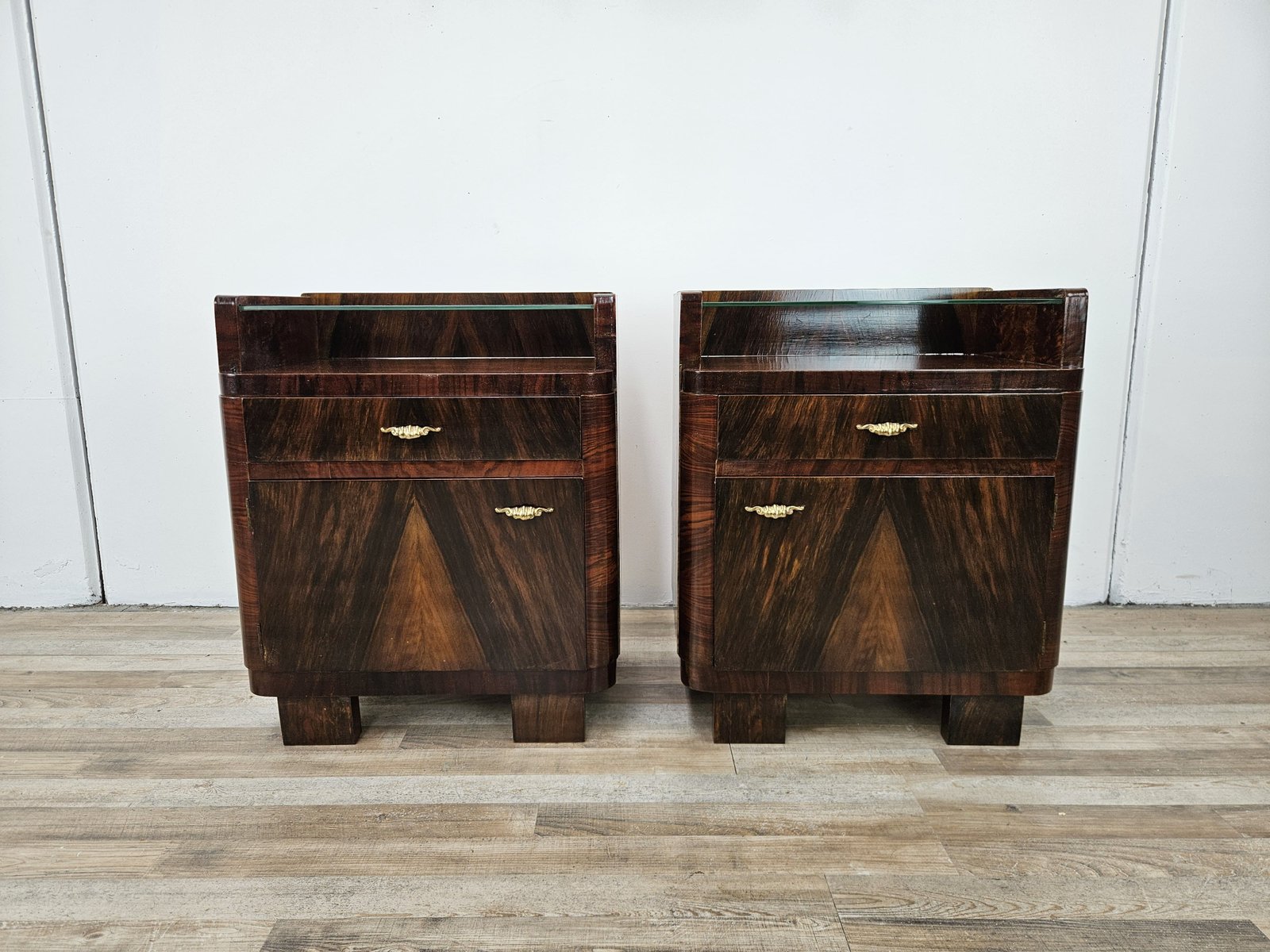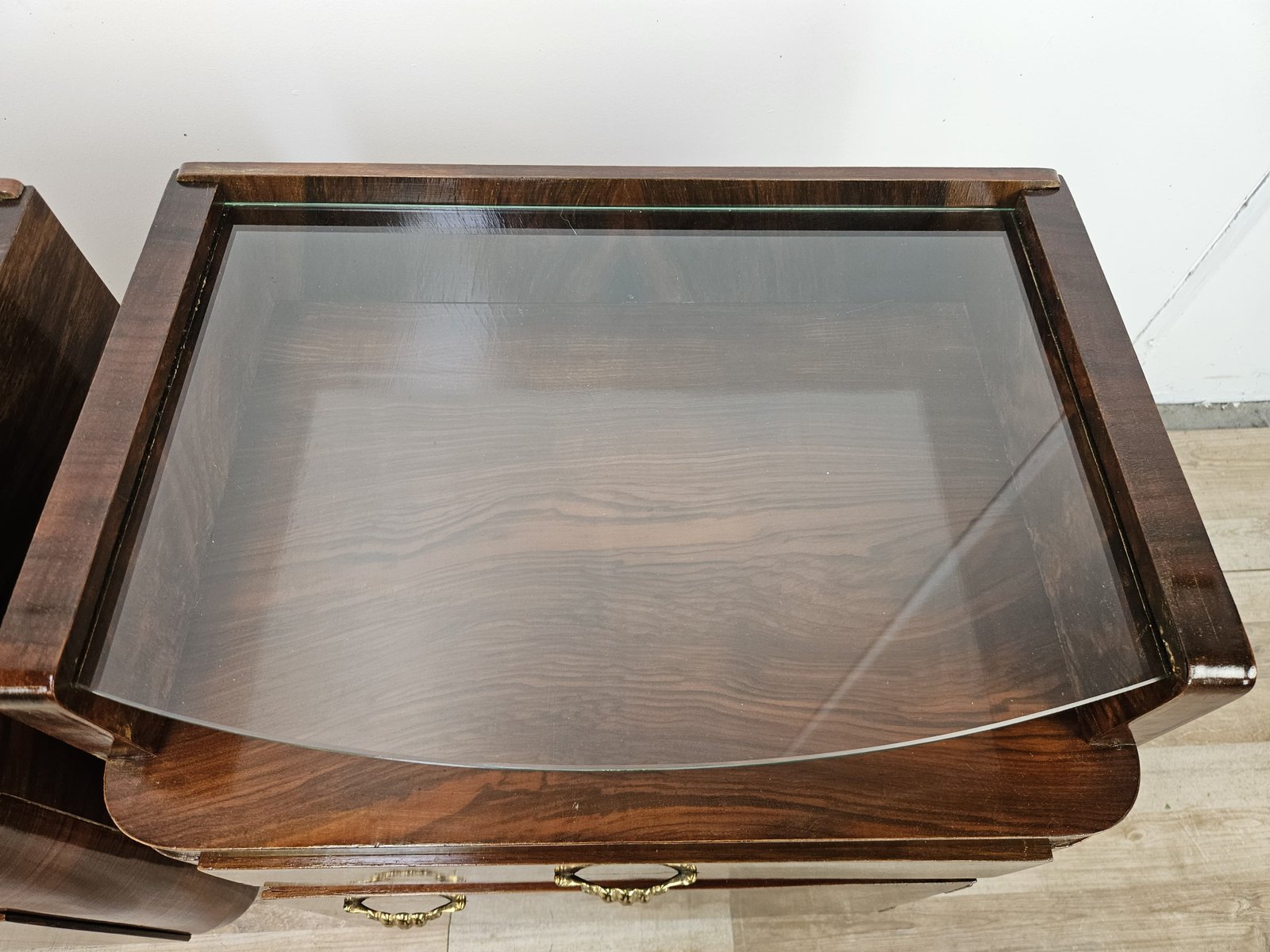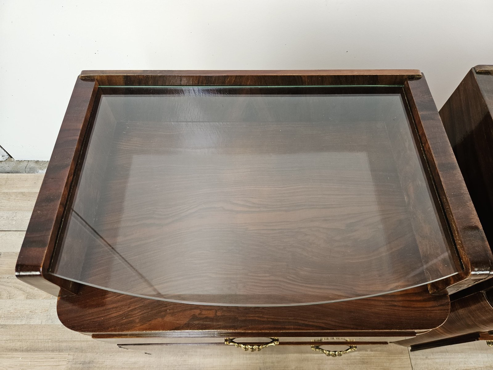 Tables de Chevet Art Déco en Loupe de Noyer avec Plateaux en Verre et Poignées en Laiton, 1940s, Set de 2