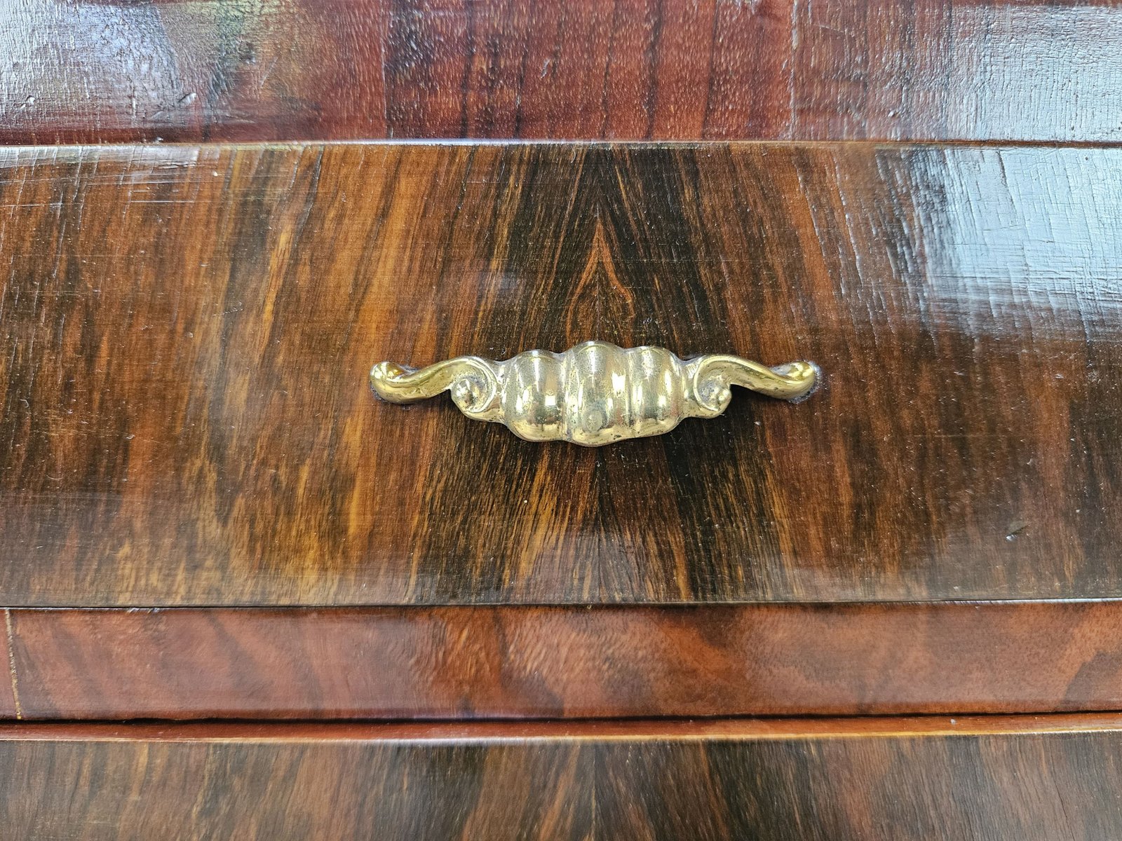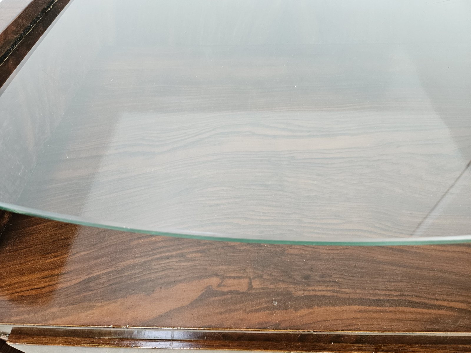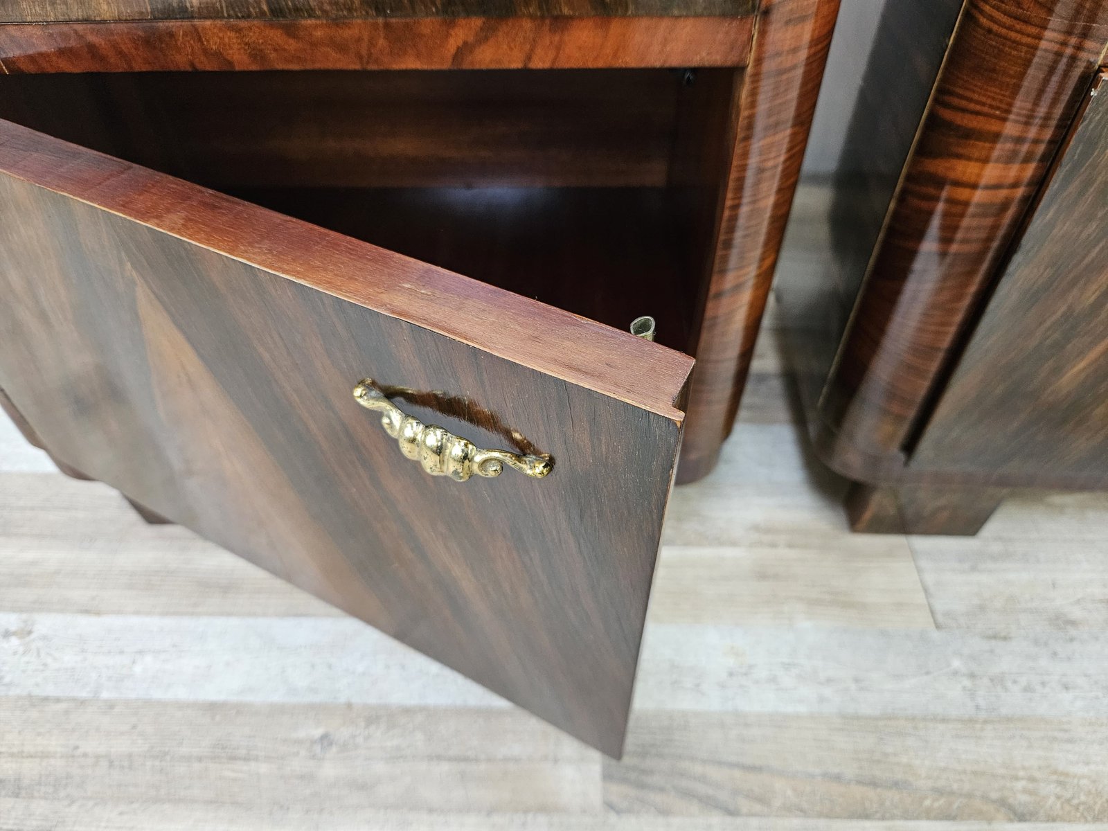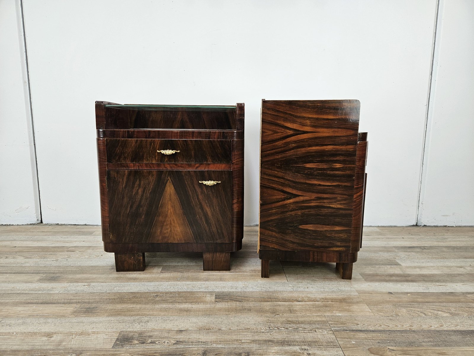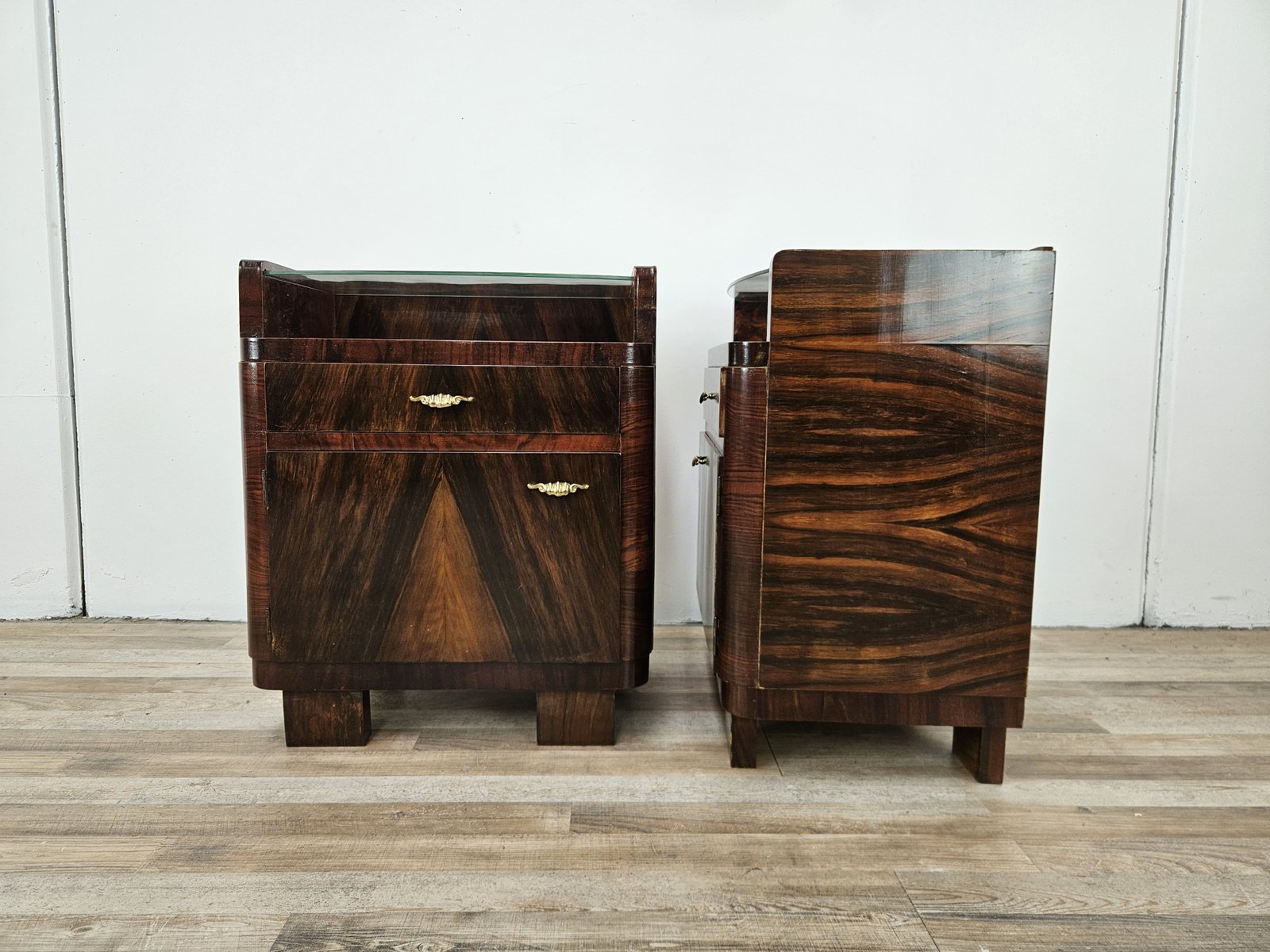 Tables de Chevet Art Déco en Loupe de Noyer avec Plateaux en Verre et Poignées en Laiton, 1940s, Set de 2