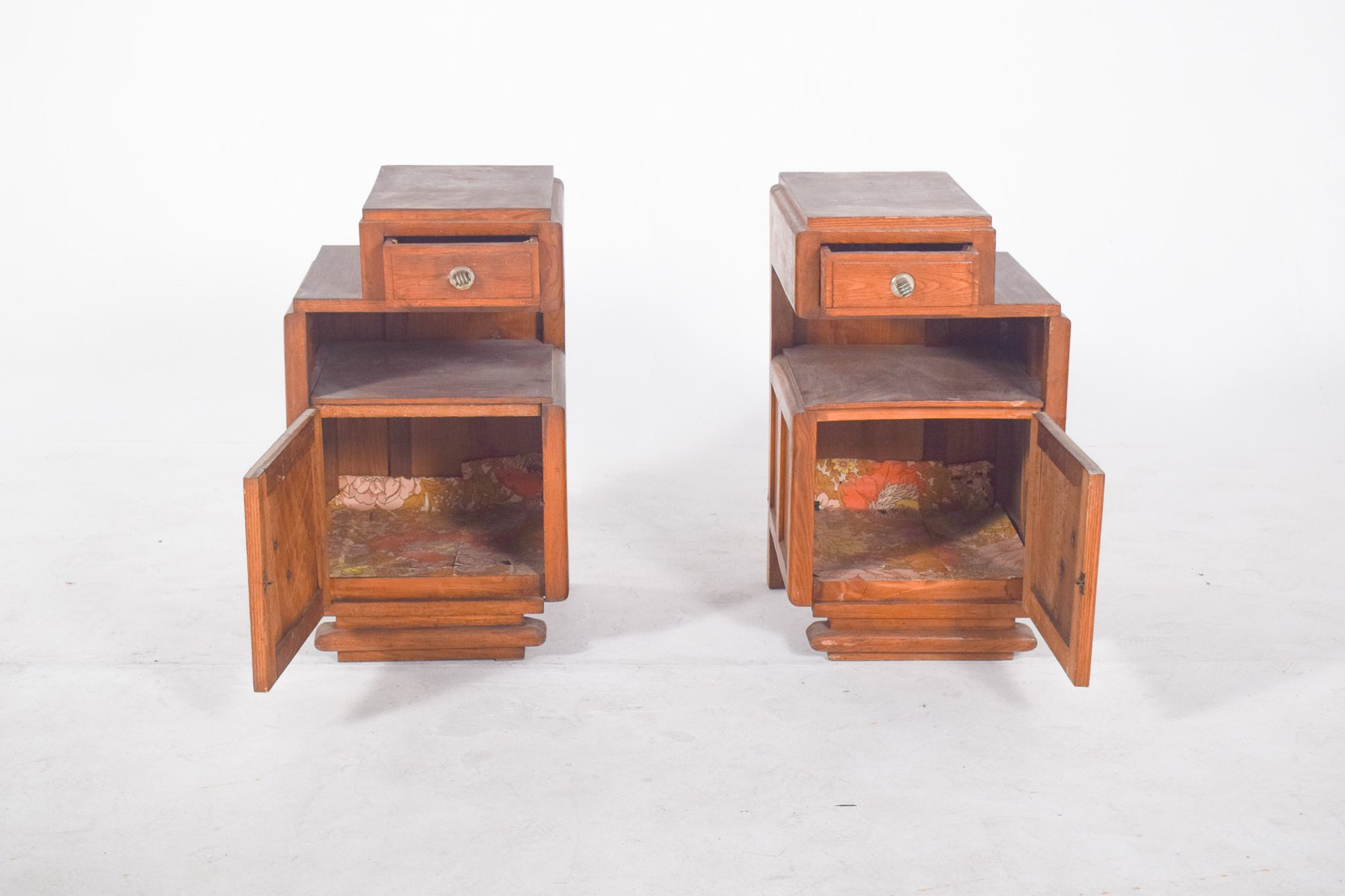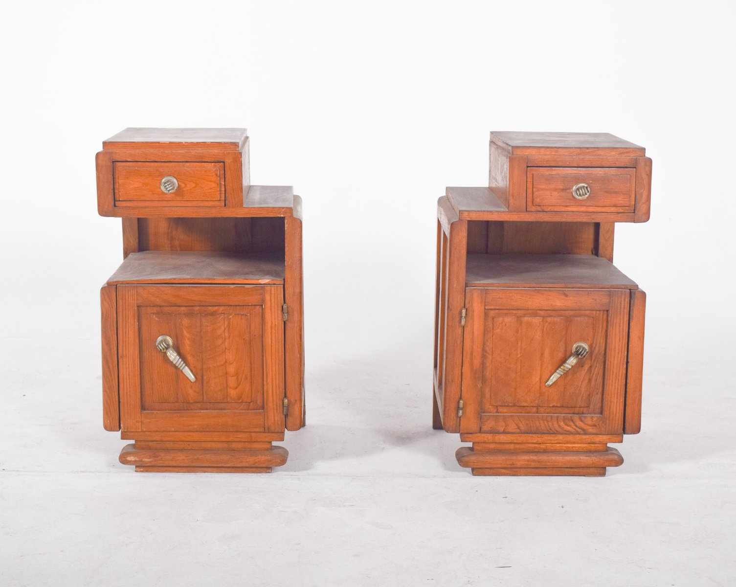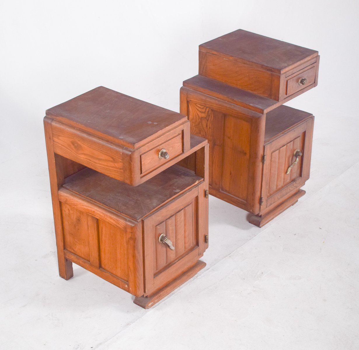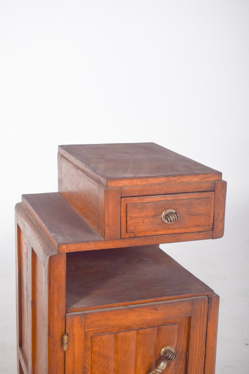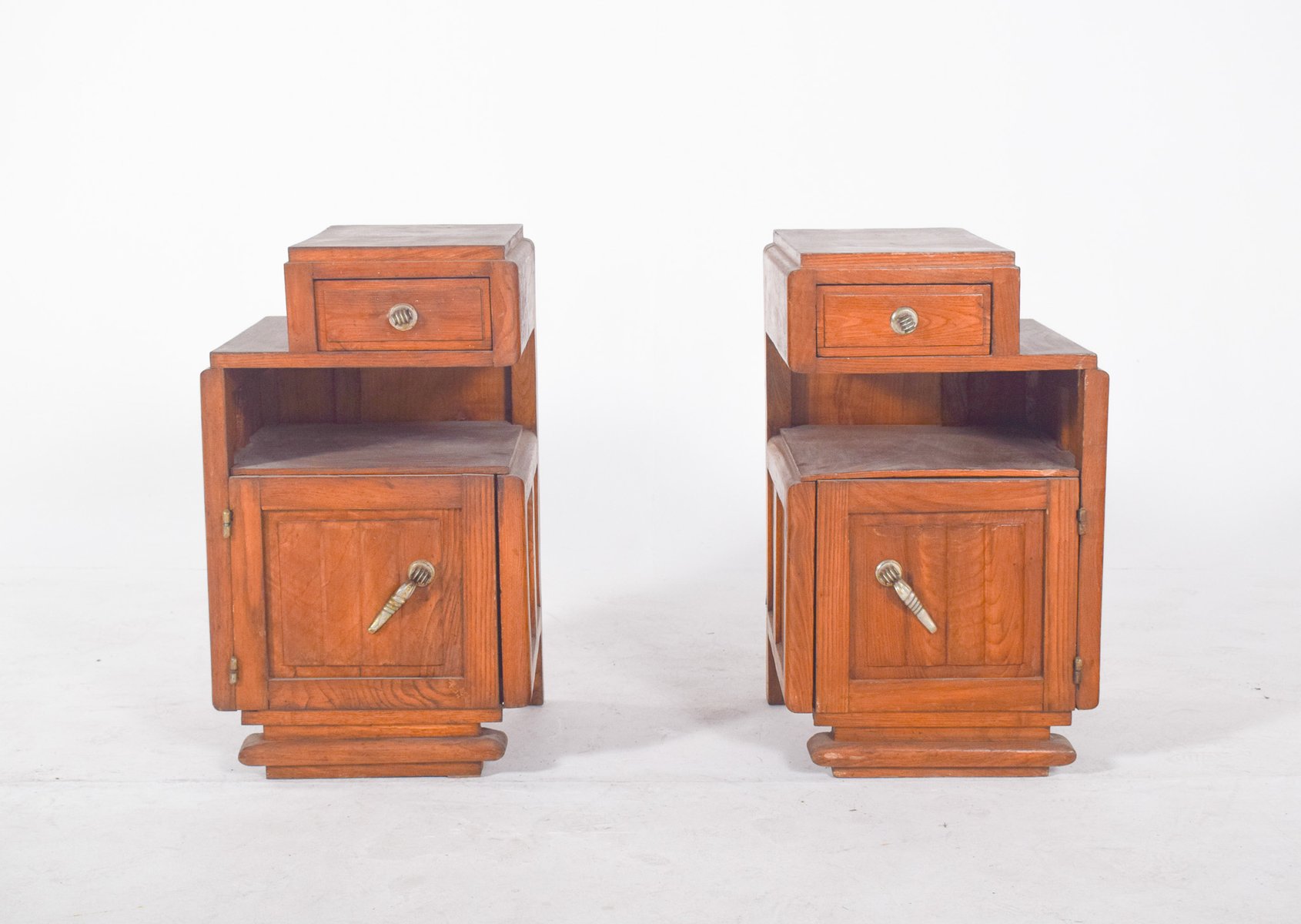 Pair of Deco-style bedside tables. They have raised tops that house small drawers with round metal handles, followed by open central niches and lower doors with ornate conical-shaped handles. The sides feature simple, discreet mouldings, while the bases are made up of stepped platforms that reinforce the set's solid, geometric look. The wood is finished in a warm colour, with apparent veins and slight signs of use, such as surface marks and wear on the tops.
