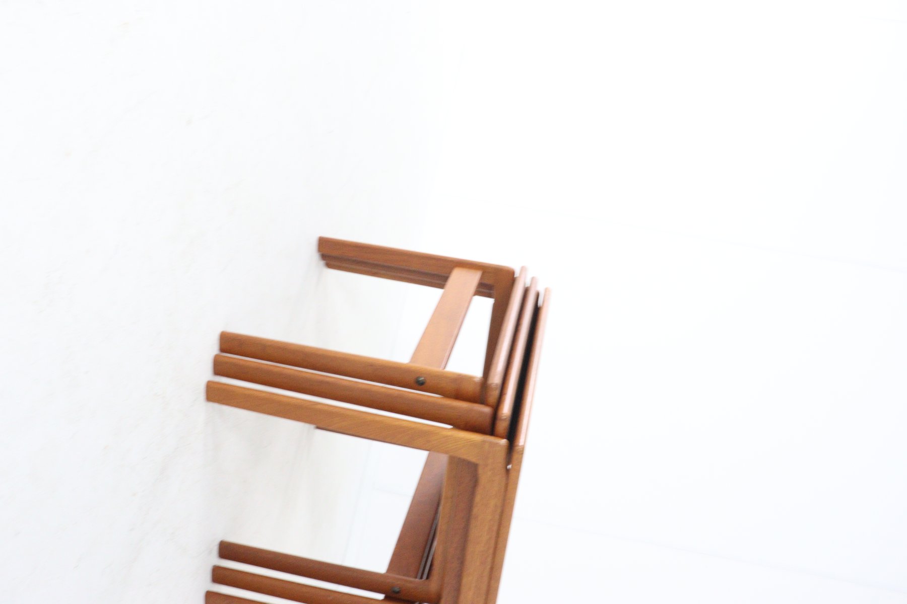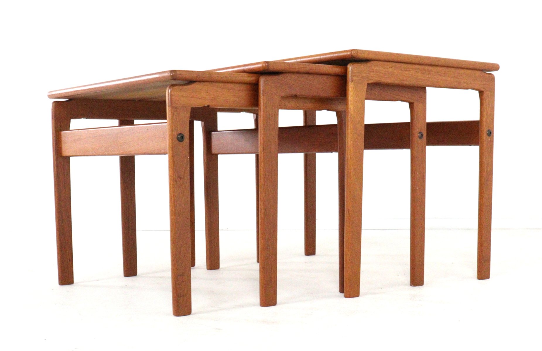 Set of 3 Teak Nesting Tables Minimalism at its finest. This set of three 'Made in Denmark' side tables is the definition of smart, Scandinavian living. While some items focus on curves, this set celebrates the beauty of straight lines. These nesting tables (or, in proper Dutch: mimiset) from the 1960s are perfect proof that practical design can also be visually appealing. The warm teak and sleek finish instantly add ambiance to any interior. Form & Function The design is typical of the heyday of Danish Modernism: no unnecessary frills, but a pure focus on materials and proportions. The tables have a rectangular top with subtly rounded corners and stand on sturdy, square legs. The construction is as simple as it is ingenious: the tables nest nicely one underneath the other. Need space? Then they can be compactly nested into a single table. Having guests or a party? You can instantly create a generous surface by displaying them in tiers or spreading them throughout the room. The "Made in Denmark" label on the bottom is more than just a sign of provenance; it's a hallmark of quality from an era when furniture was made to last for generations. Why this set? Space-saving: Ideal for smaller homes or apartments; three tables take the place of one. Warm appearance: The teak has acquired a beautiful, deep glow over the years, adding warmth to sleek new construction or character to a 1930s home. Country of origin: Denmark Height: 45 | 47 | 48.5 cm Width: 49 | 54 | 100 cm 62 cm Depth: 35.5 | 38.5 | 41 cm