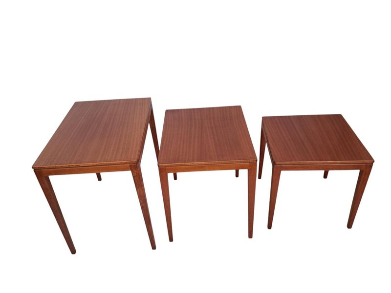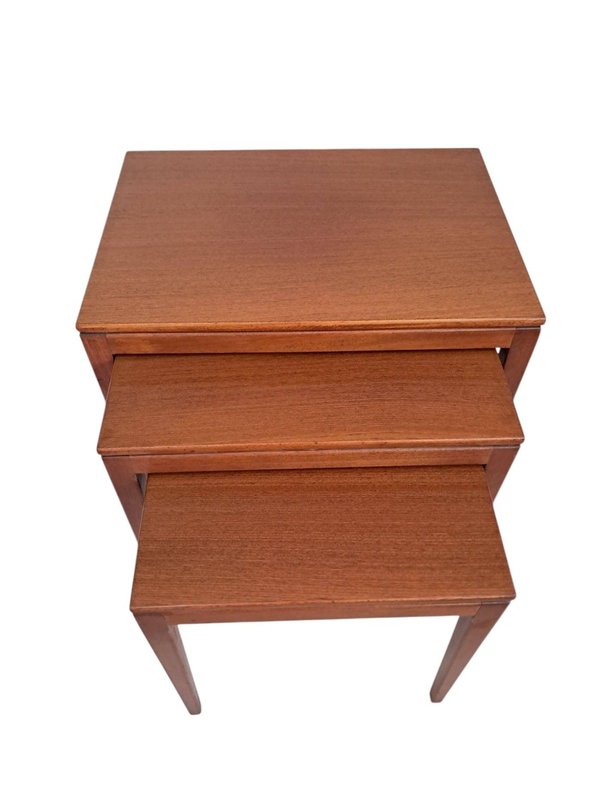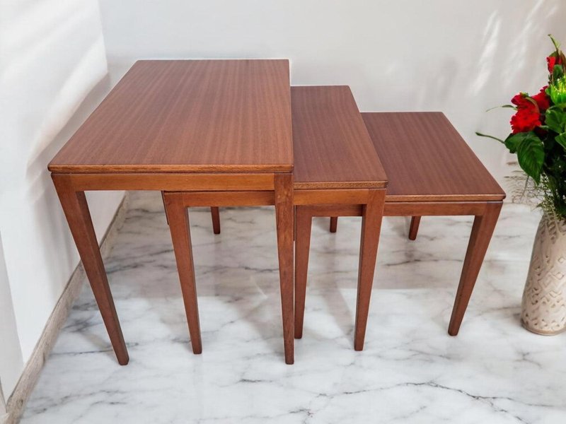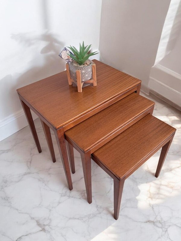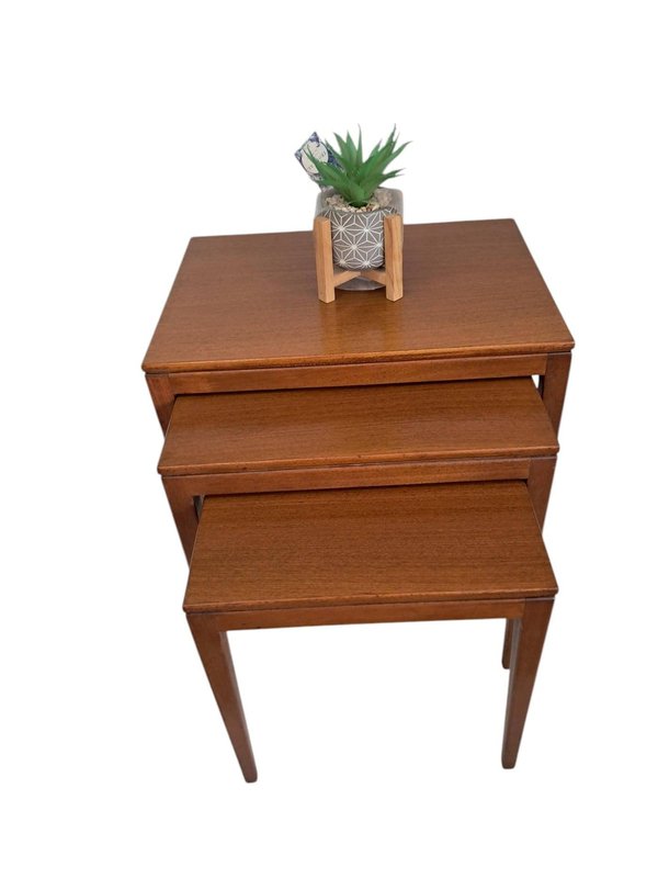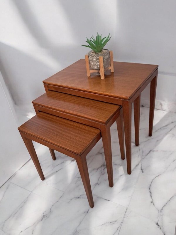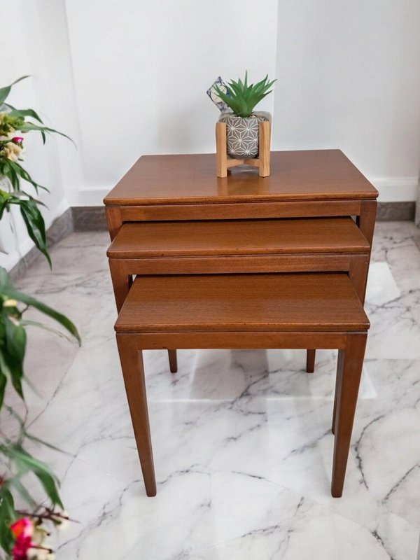 Mid Century Danish Style Nest of Tables | 1960s Danish-Inspired Design with a wonderful Teak wood grain to them. In superb condition. Professionally refinished and cleaned. Elevate your interiors with this exquisite Nest of Tables, a timeless piece crafted in the 1960s and embodying the elegance of Scandinavian modern design. This charming "trio" comprises three beautifully proportioned tables that nest seamlessly under one another, offering both practicality and sophistication. Resting on tapered retro legs, the tables exude understated elegance, ideal for those who value both form and function. Professionally cleaned and meticulously refinished, this set is presented in superb vintage condition, ready to make a stylish statement in your home. Whether for serving tea and coffee or as versatile occasional tables, they provide convenient surface space when needed, before tucking neatly away. A true icon of Mid-Century Modern design, these tables will complement any discerning interior. Measurements of individual tables: - approximate W 53cm x D 38cm x h 51cm w 46 cm x D 38cm x H 45.5cm w 38cm x D38 cm x H 40cm