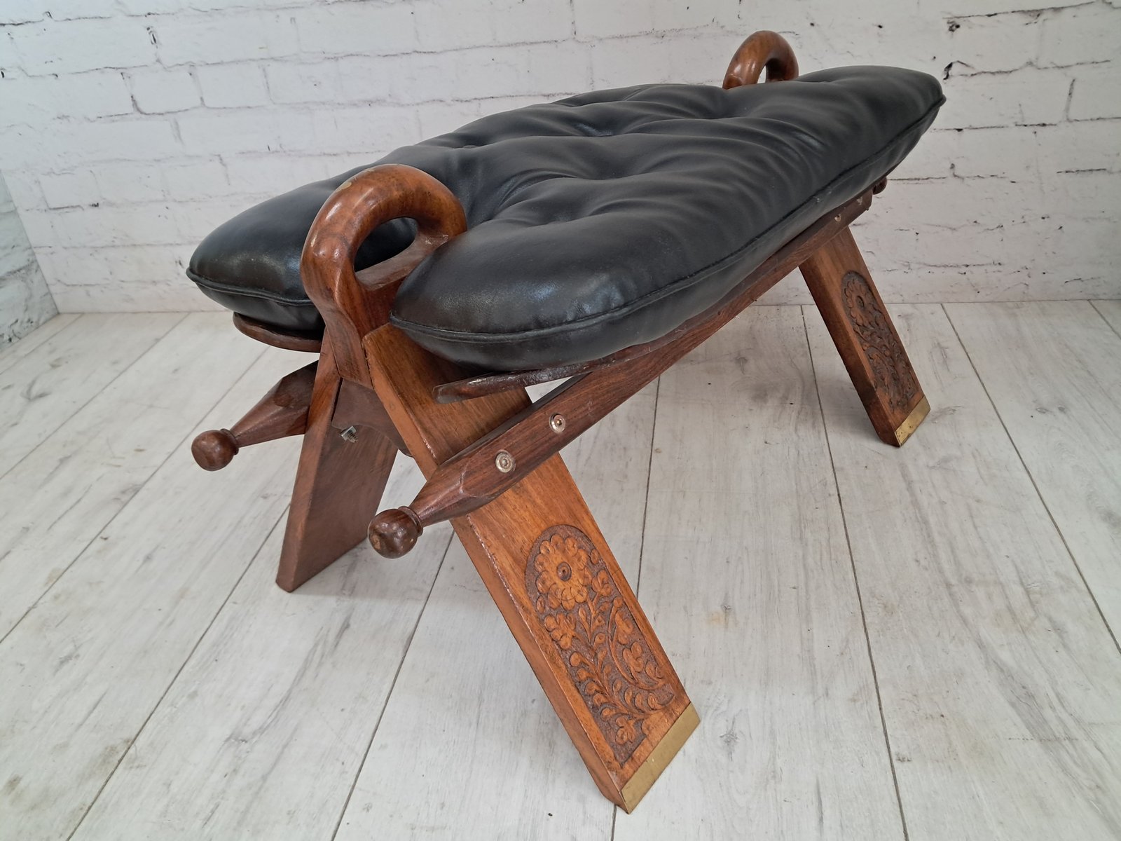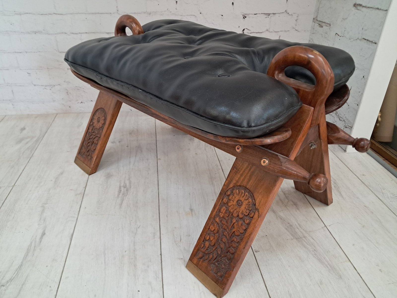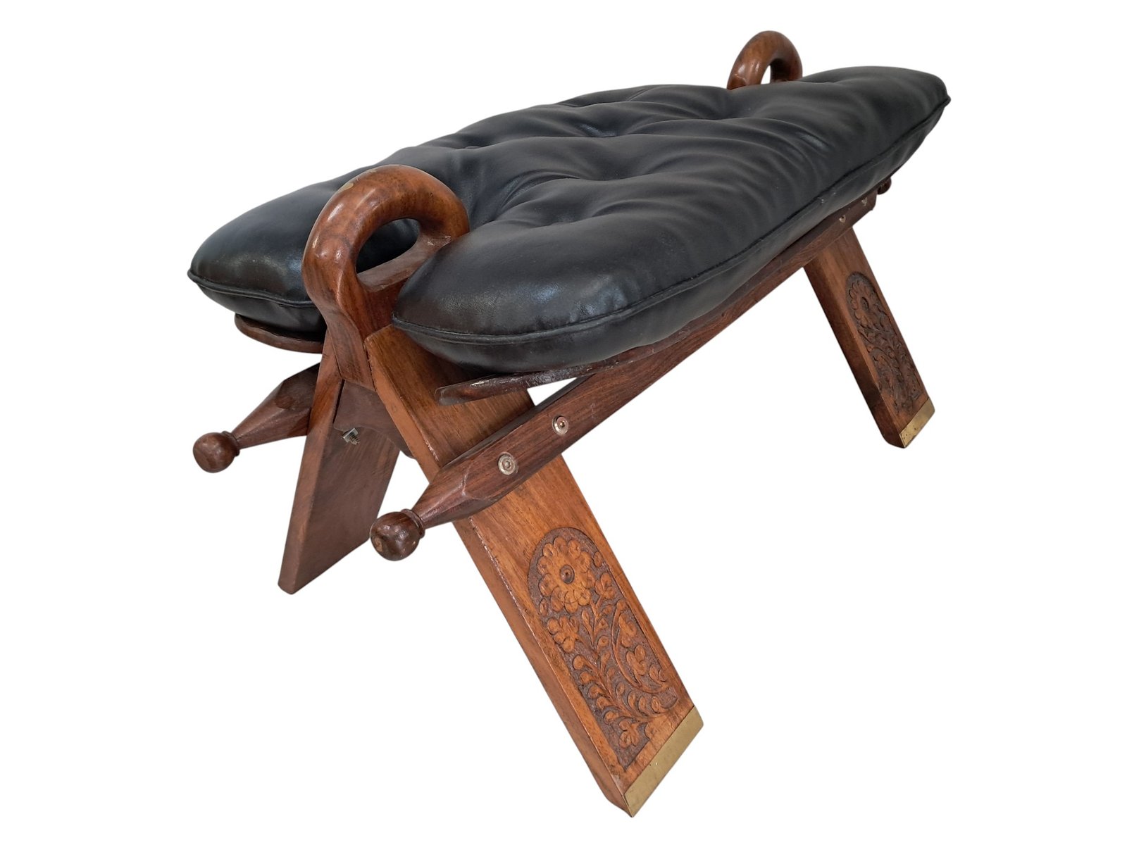 The design takes inspiration from traditional camel saddle stools once used across North Africa and the Middle East — admired for their portability and graceful curves. This example features a pair of sculptural walnut handles, each adorned with delicate gold gilt floral detailing, echoing the exotic origins of its design and lending a refined decorative flourish.