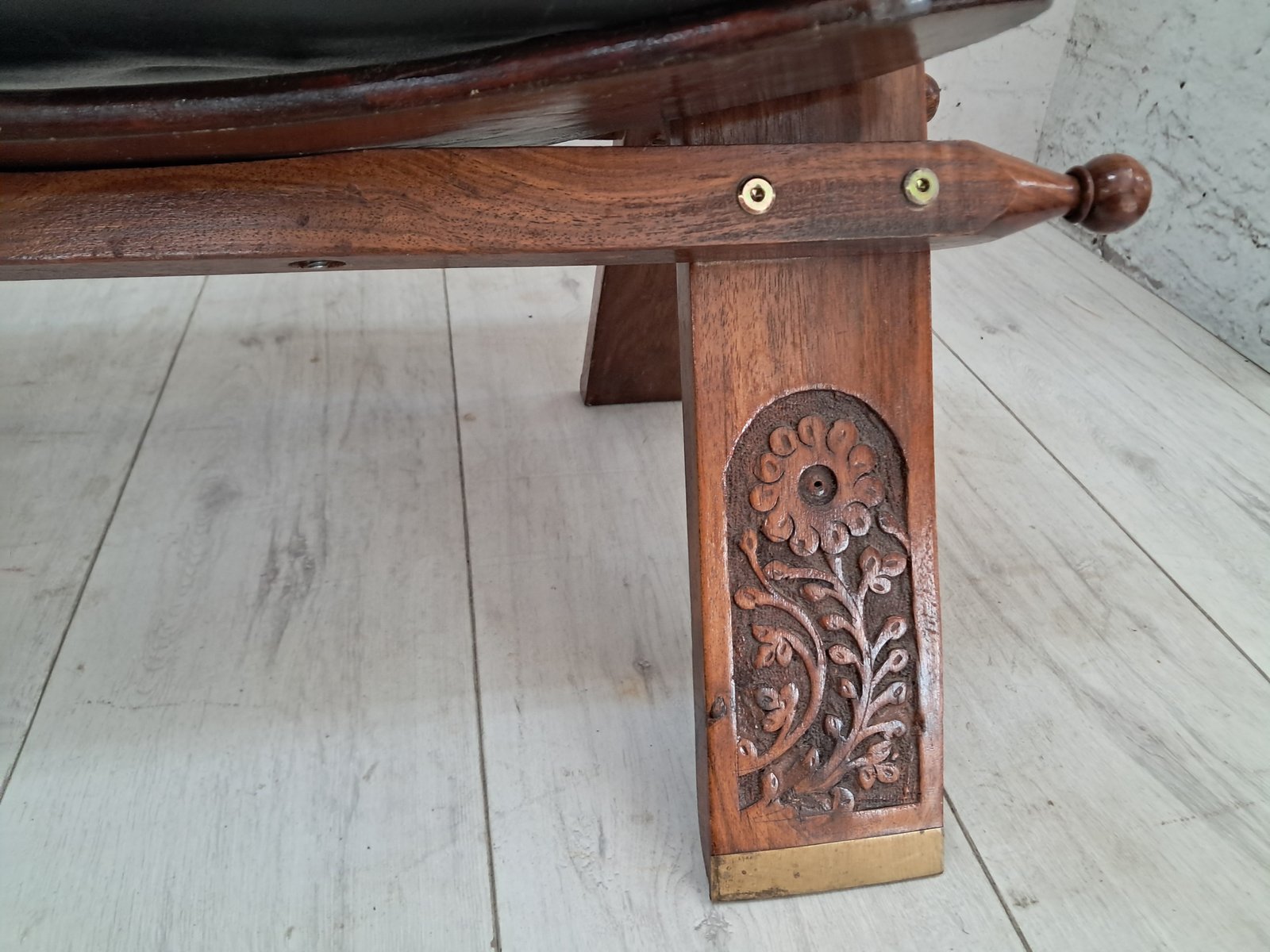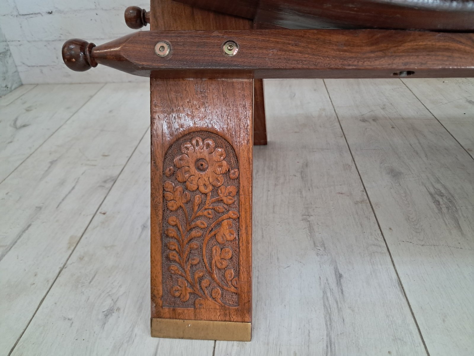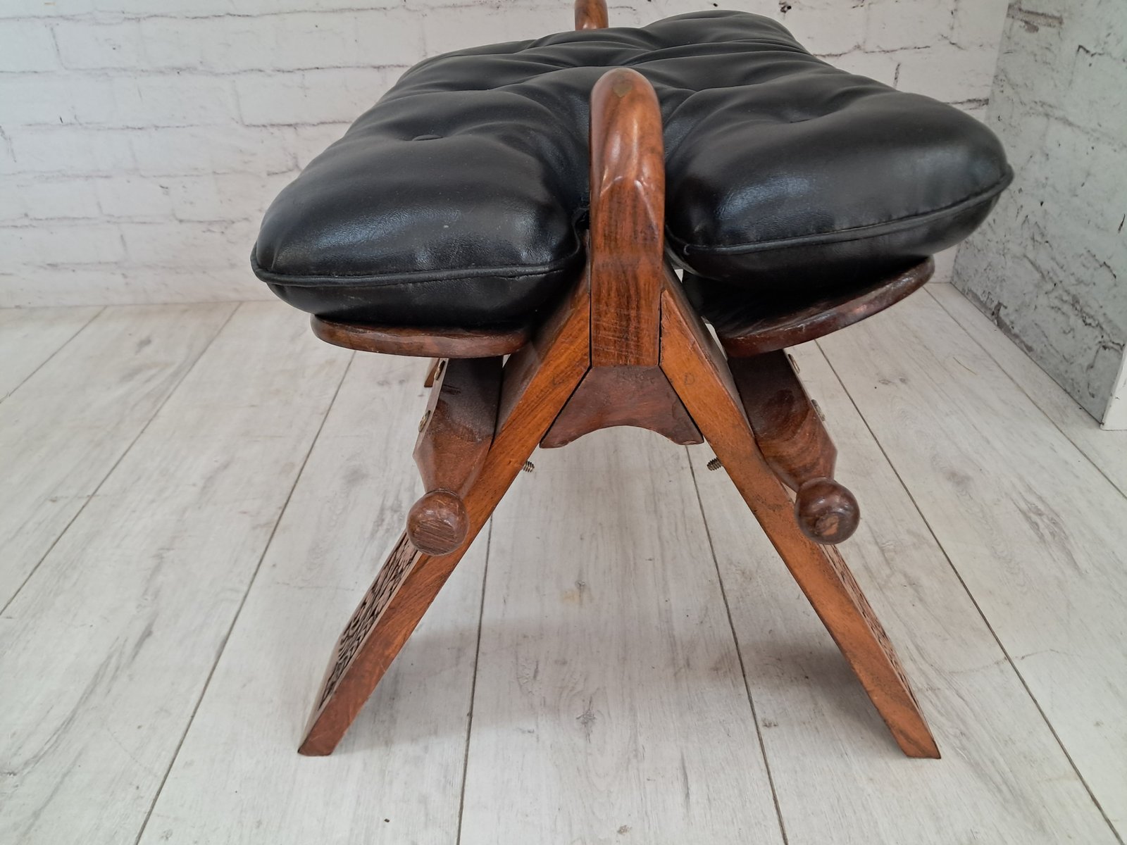 The design takes inspiration from traditional camel saddle stools once used across North Africa and the Middle East — admired for their portability and graceful curves. This example features a pair of sculptural walnut handles, each adorned with delicate gold gilt floral detailing, echoing the exotic origins of its design and lending a refined decorative flourish.